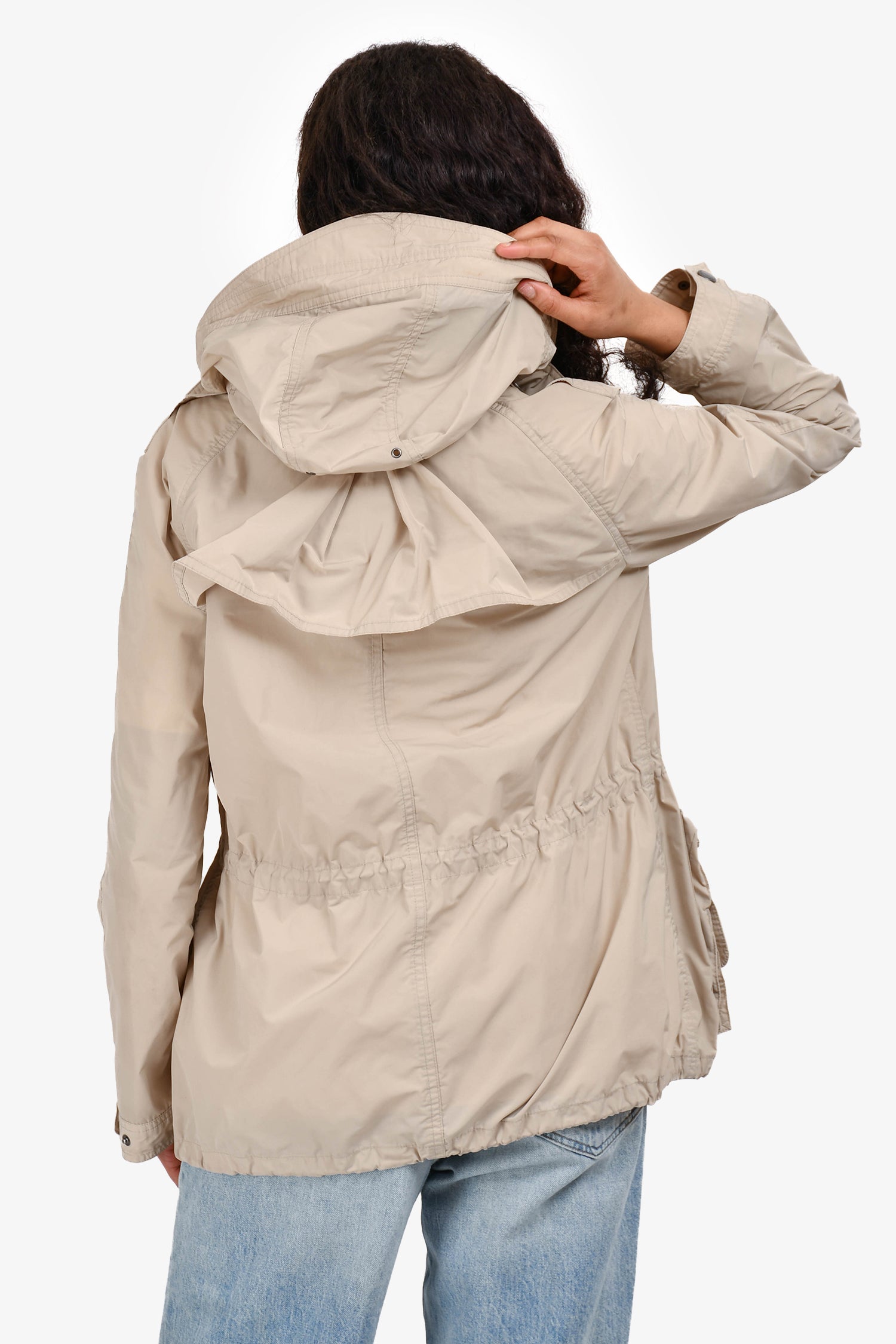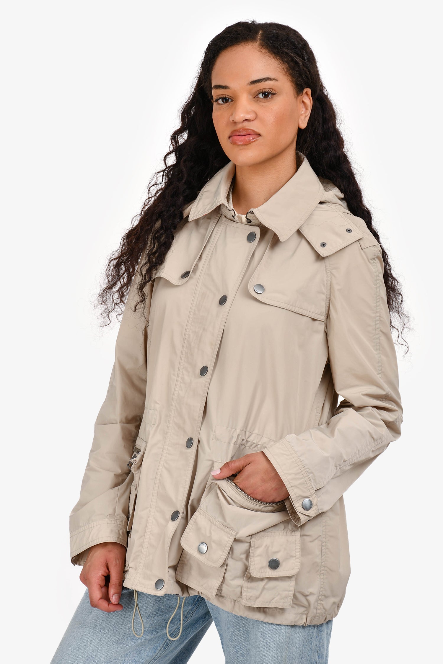 Refresh availabilityBurberry Brit Saje Green Nylon Short Utility Jacket. Zip front with snap-button placket. Multiple front flap pockets. Two front zip pockets. Adjustable waist drawstring. Fully lined. Attachable hood. Tonal stitching.