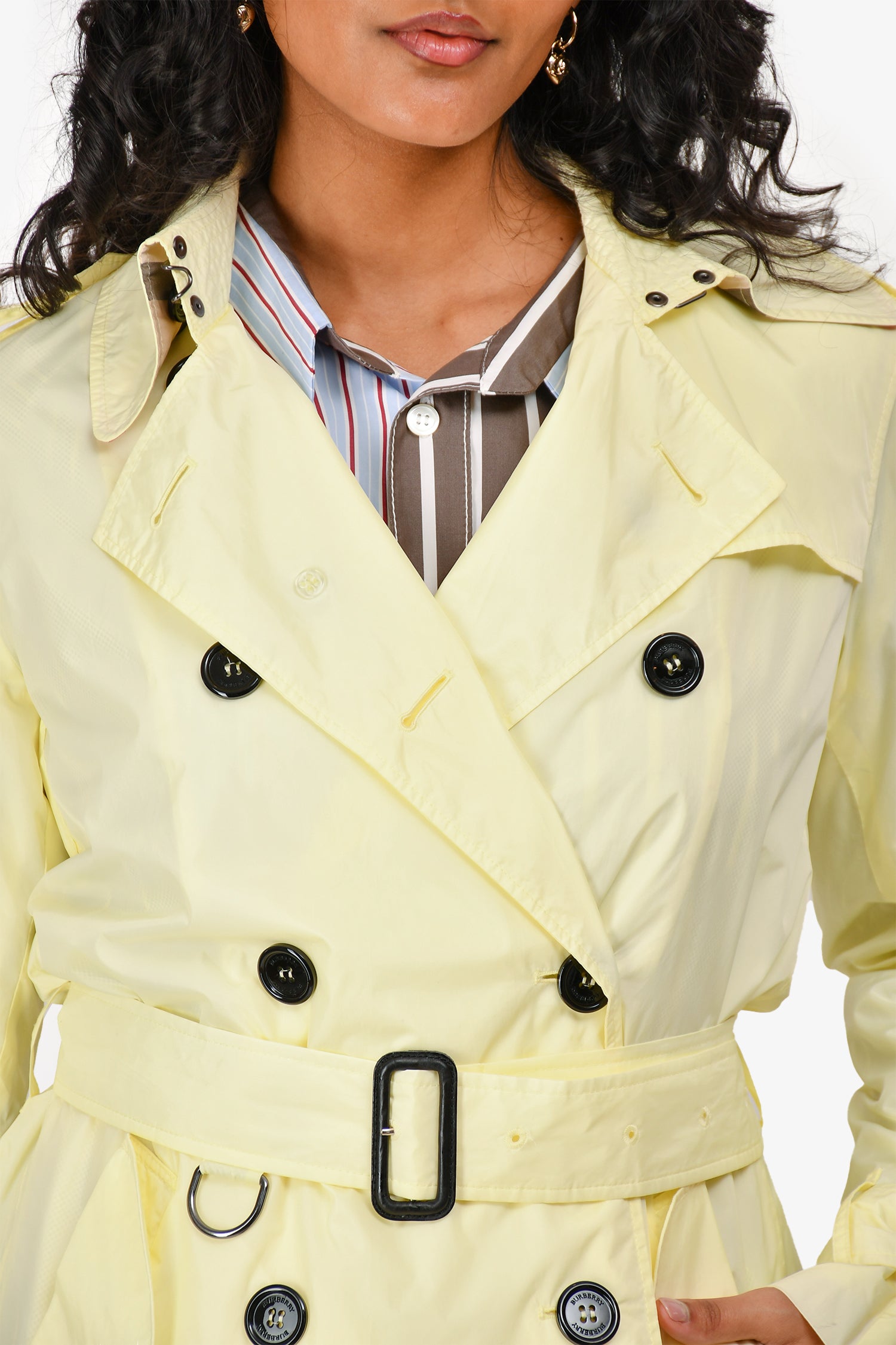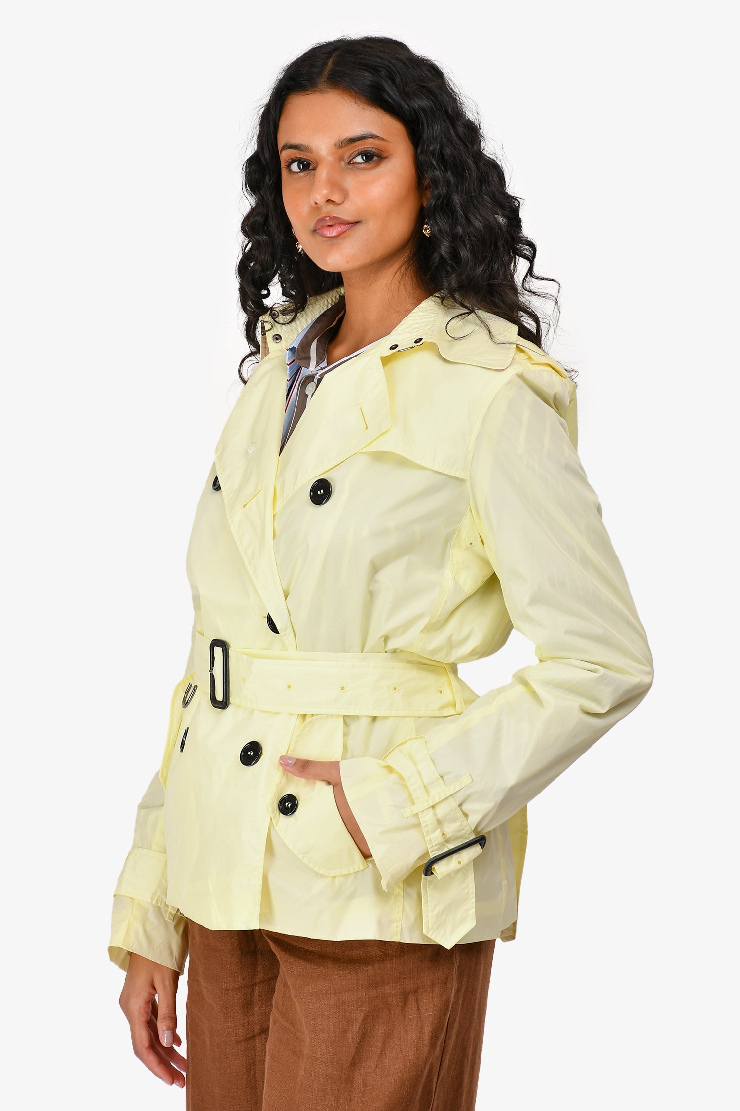 Refresh availabilityBurberry Brit Yellow Nylon Short Trench Jacket. Front button-up closure. Front pockets with button closure. Waist belt with buckle closure. Tonal stitching.