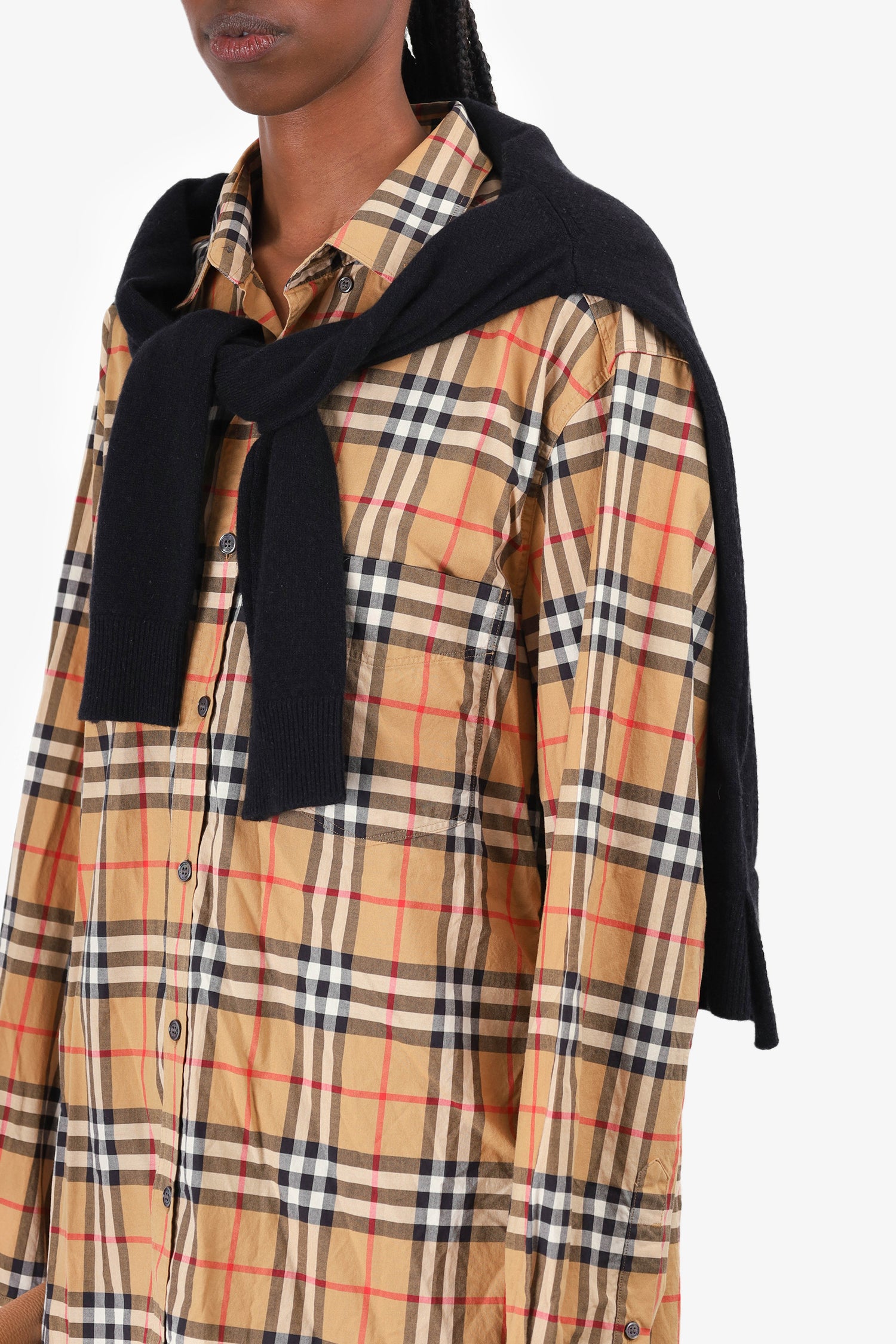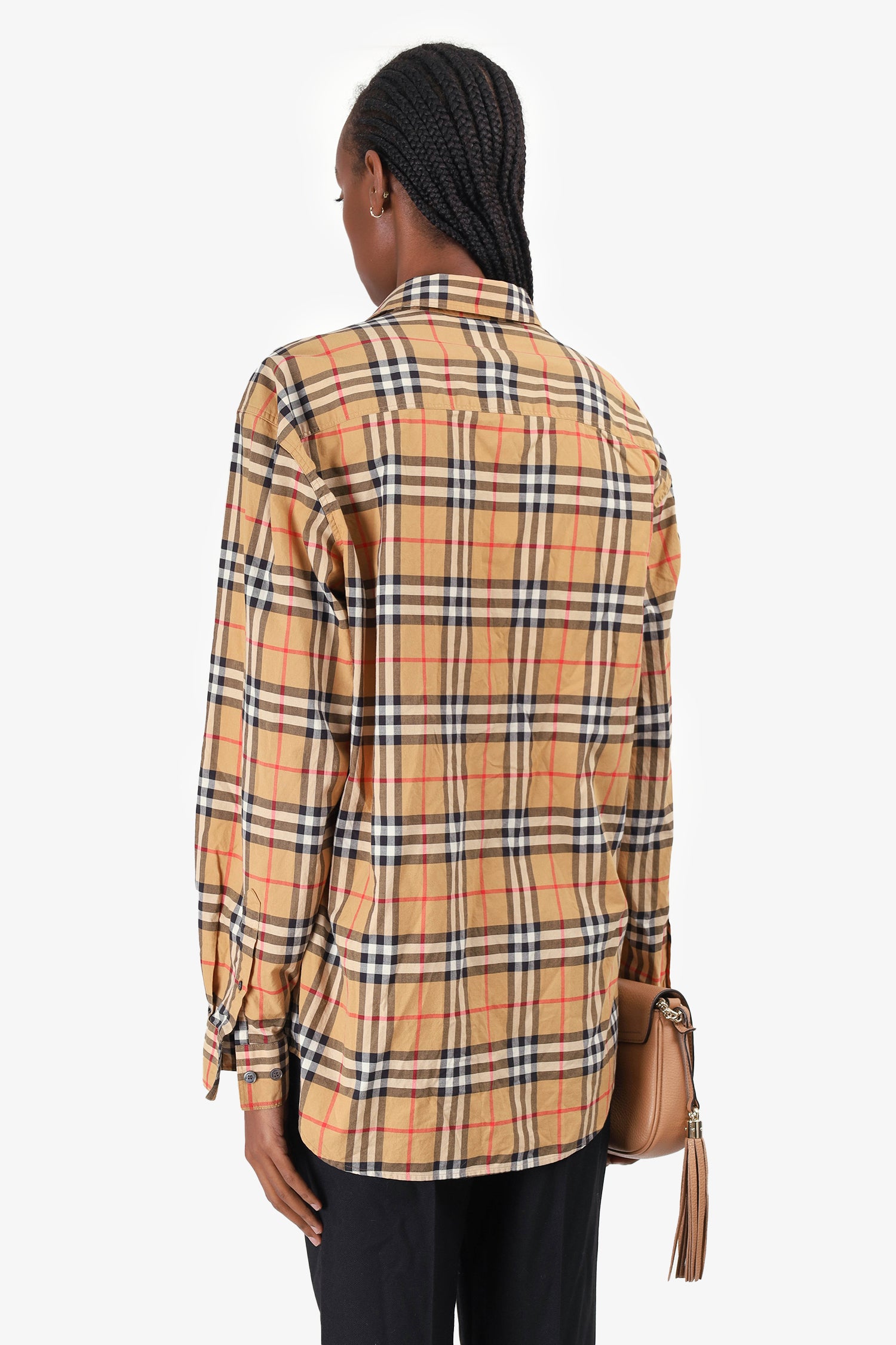 Refresh availabilityBurberry Brown Check Cotton Button-Up Shirt. Front button closure. Front slip pocket. Buttoned cuffs. Curved hem. Unlined. Tonal stitching.