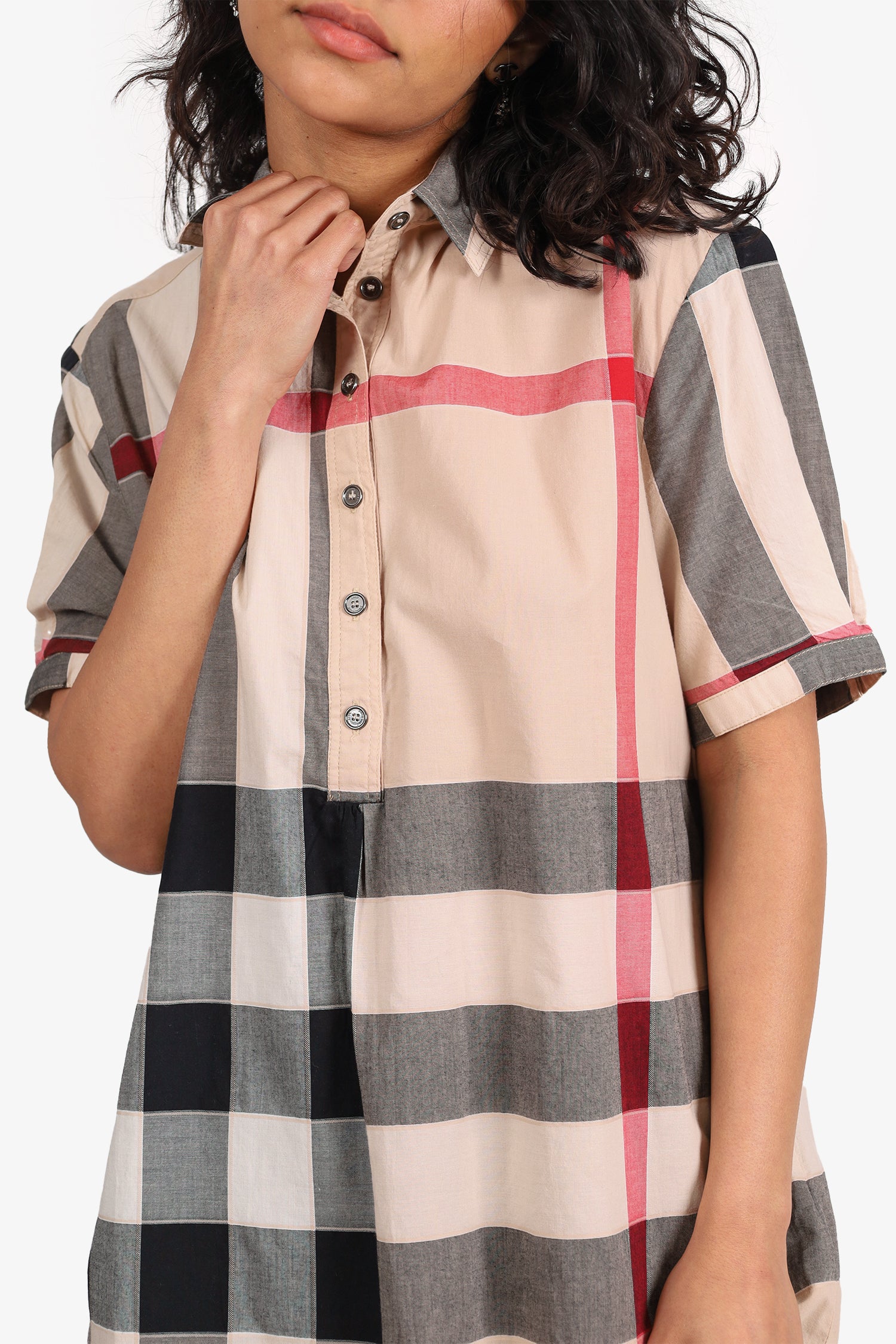Refresh availabilityBurberry Brown Cotton Check Pattern Short Sleeve Shirt. Pull-on. Collared-neckline. Front button-up closure. Tonal stitching.