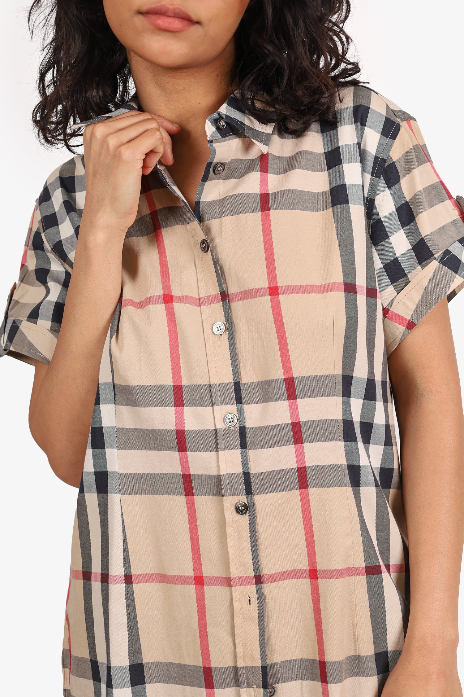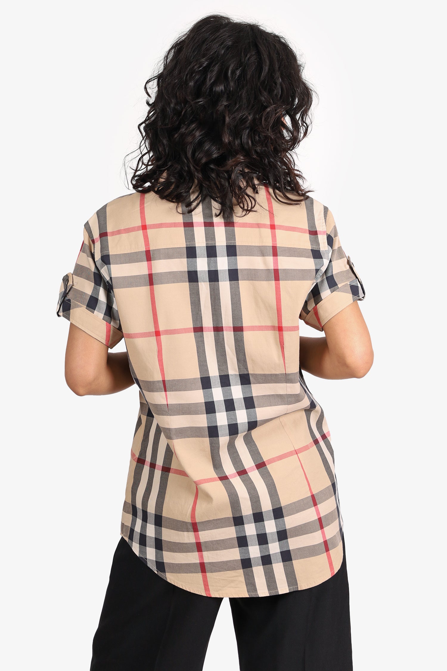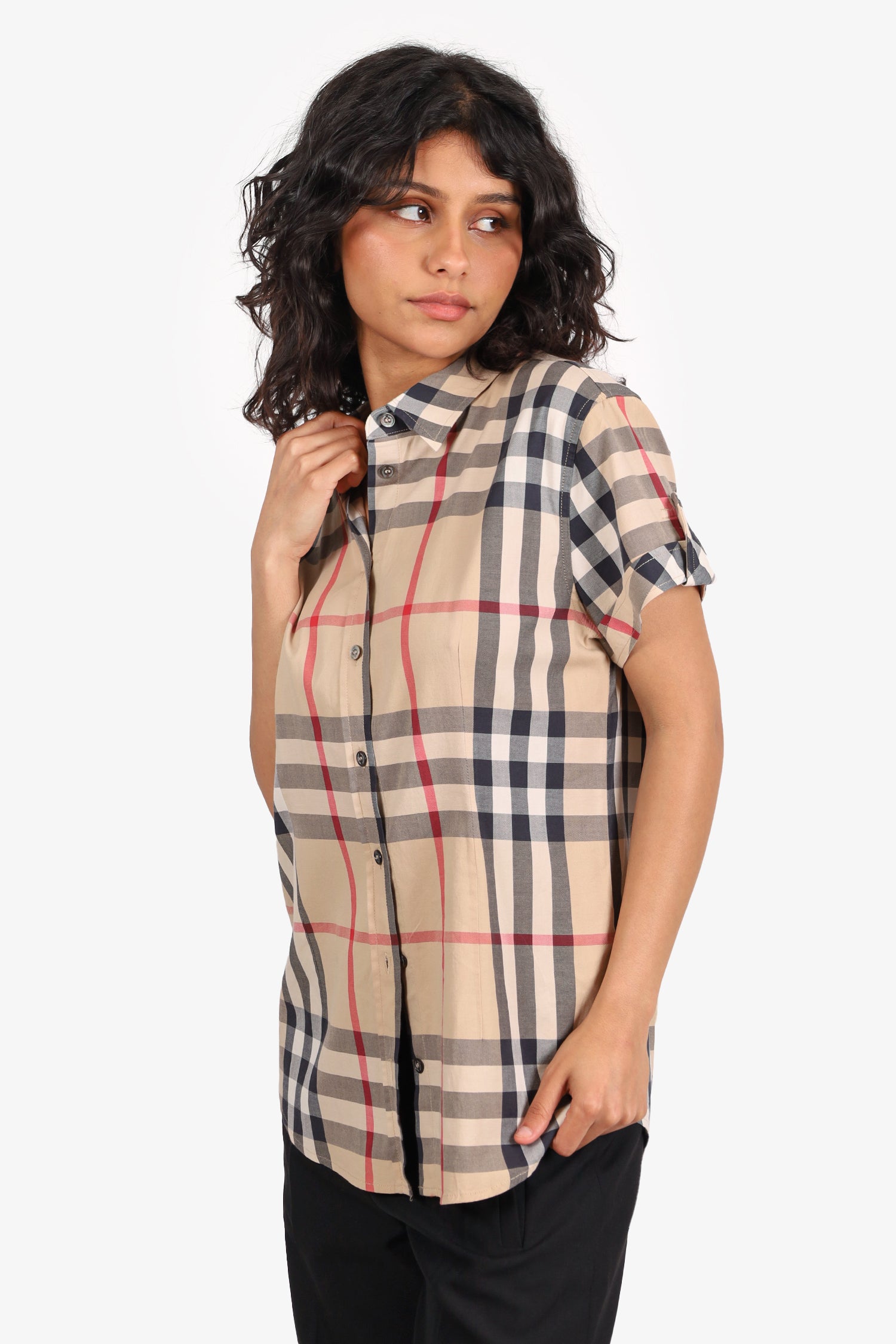 Refresh availabilityBurberry Brown Cotton Check Pattern Short Sleeve Shirt. Pull-on. Collared-neckline. Front button-up closure. Shoulder straps with button-up closure. Tonal stitching.