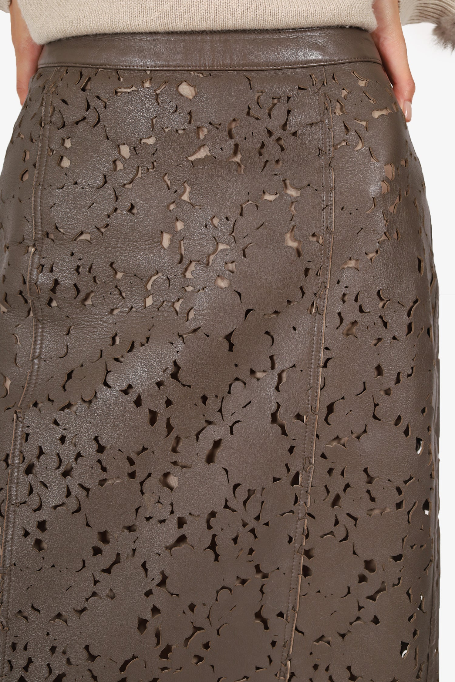 Refresh availabilityBurberry Brown Leather Cut-Out Midi Skirt. Slip-on. Rear zip closure. Lined interior. Tonal stitching.