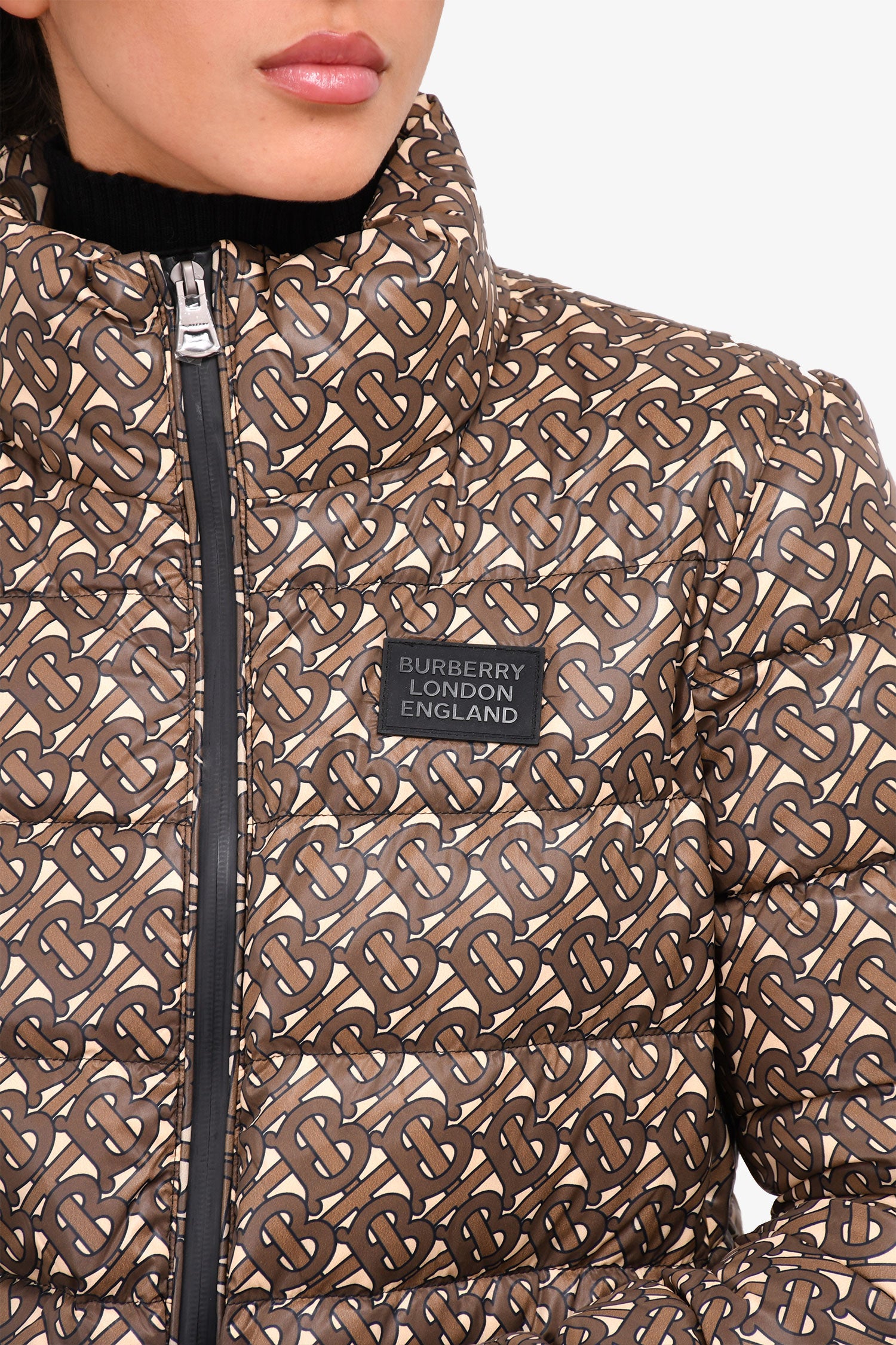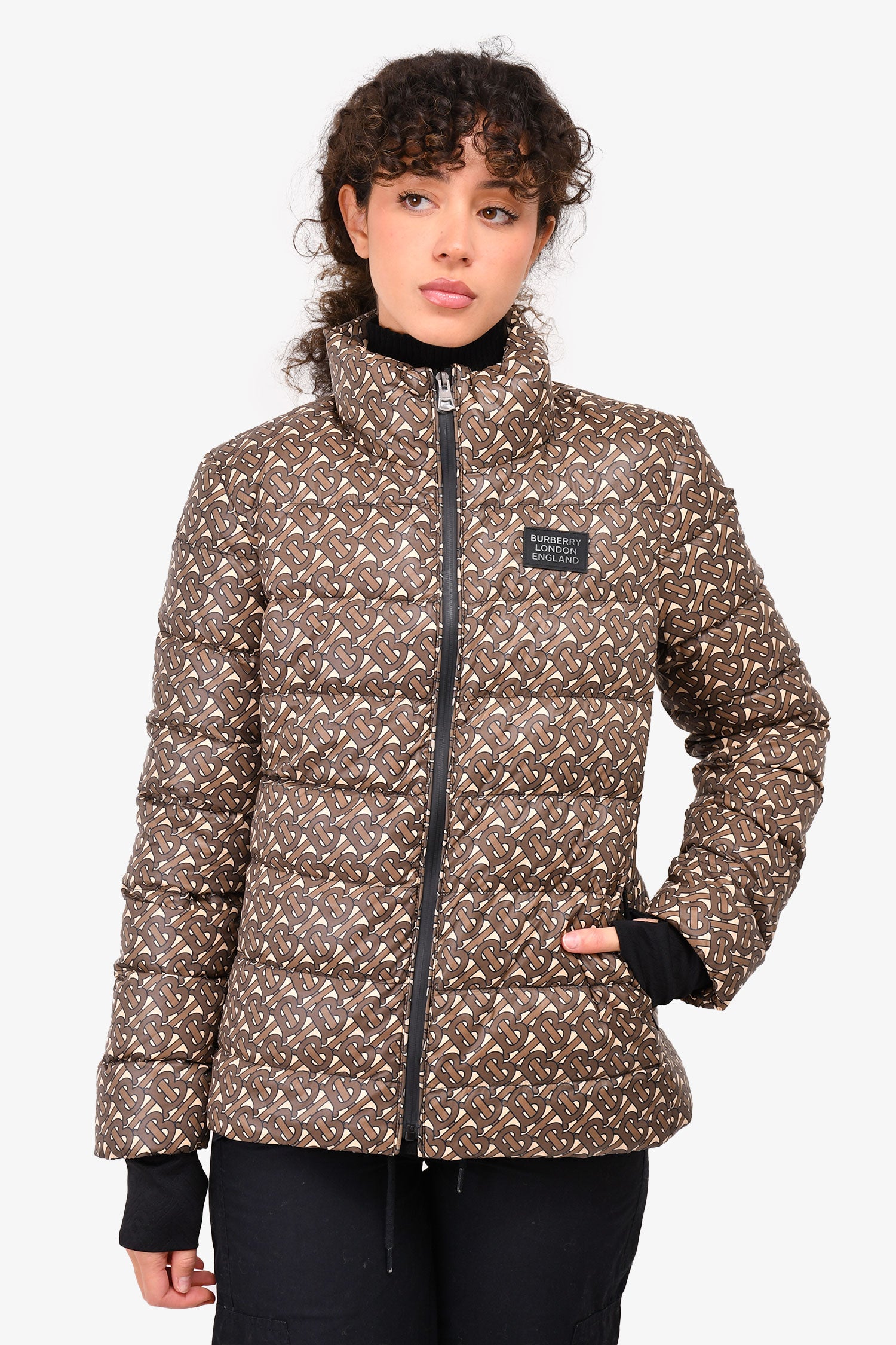 Refresh availabilityBurberry Brown TB Monogram Down Puffer Jacket. Black-tone hardware. Front zipper closure. Two front pockets with zipper closure. Interior pocket. Tonal stitching.