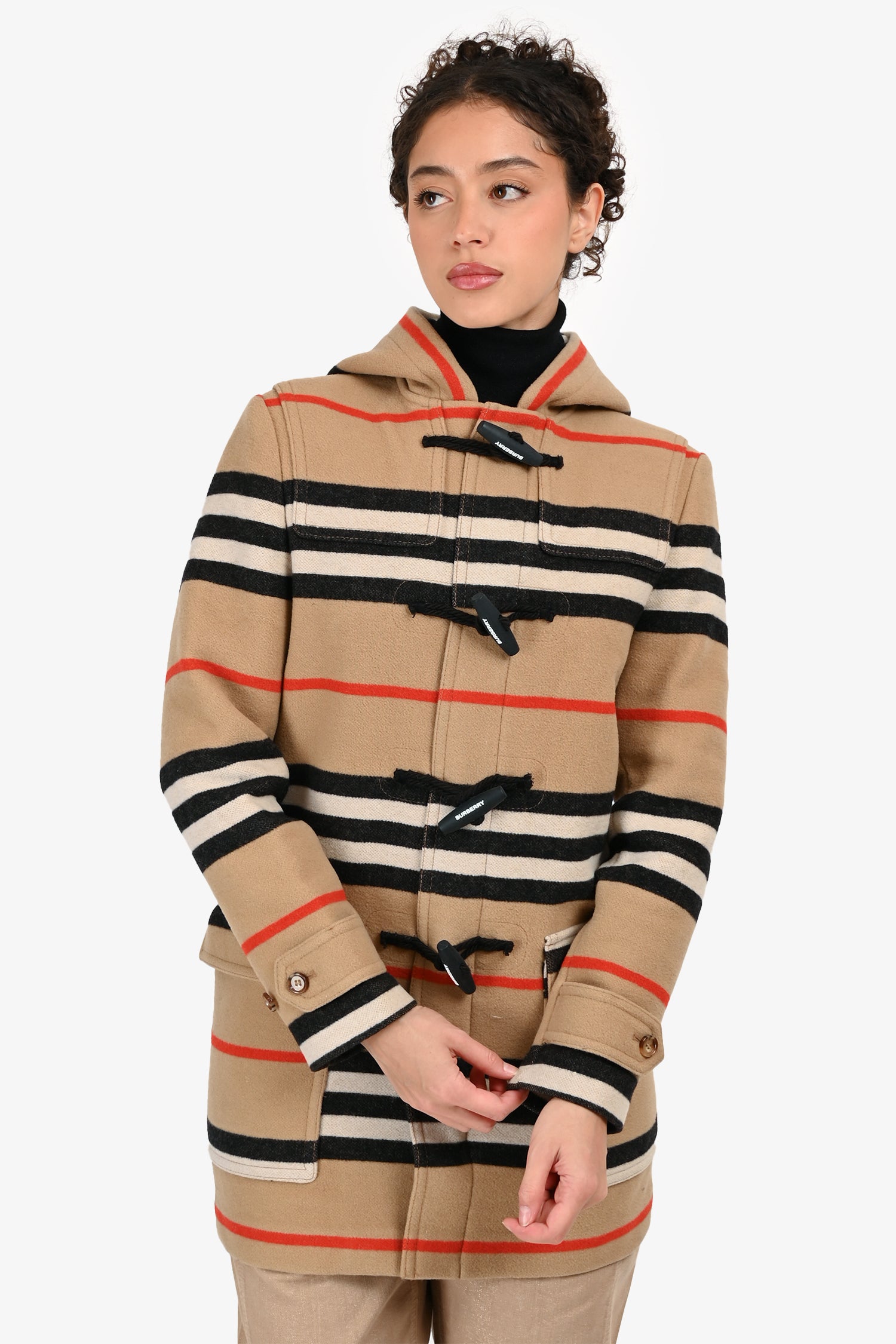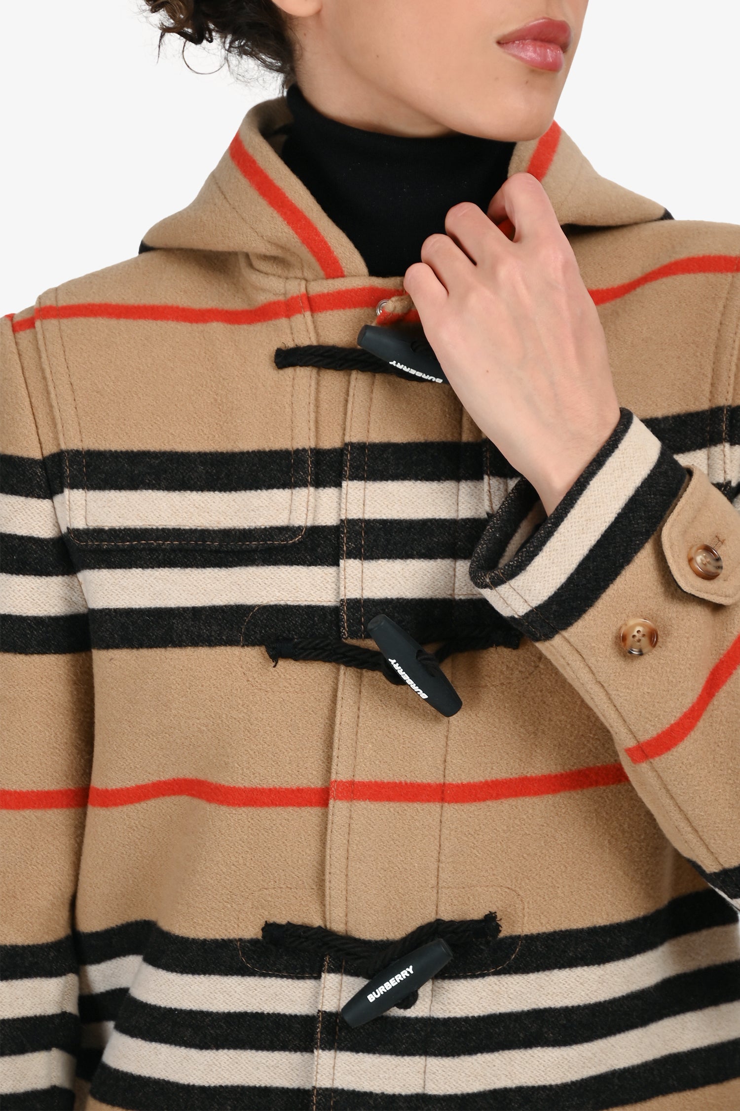 Refresh availabilityBurberry Brown Wool Tartan Pattern Duffle Coat. Slip-on. Front two-way zip and toggle-up closure. 2 front slip pockets. Sleeve cuffs with button closures. Silver-tone hardware. Tonal stitching.