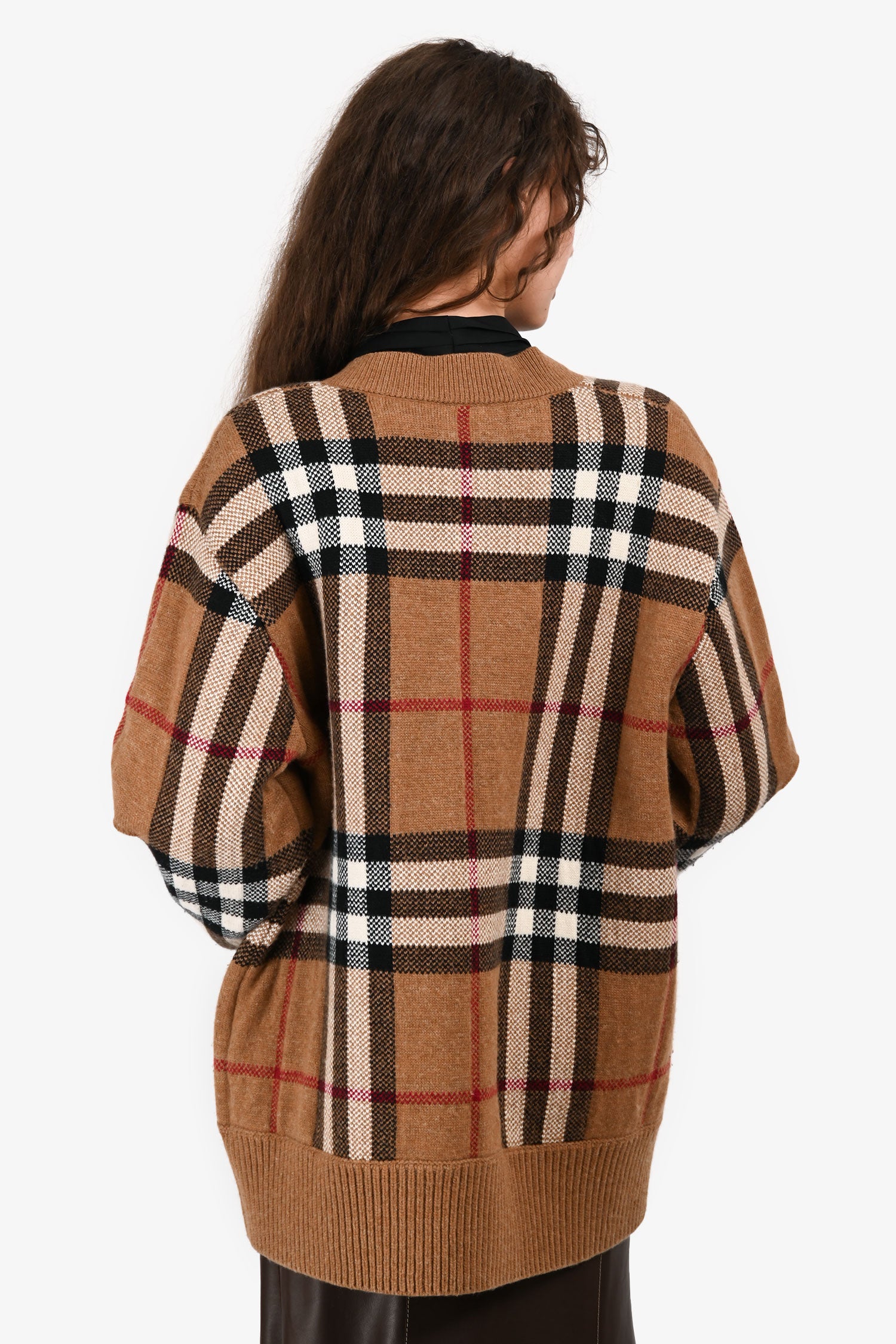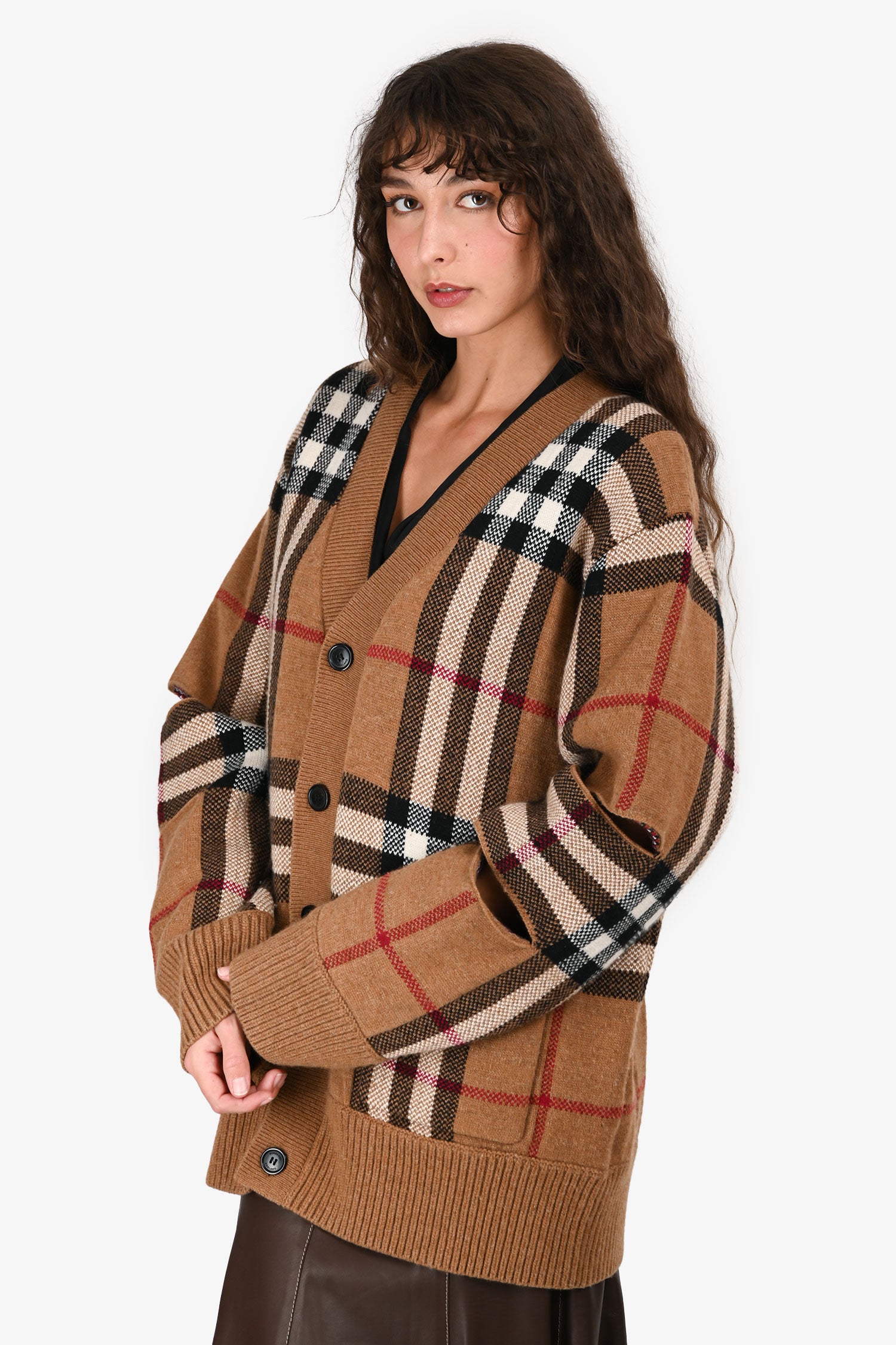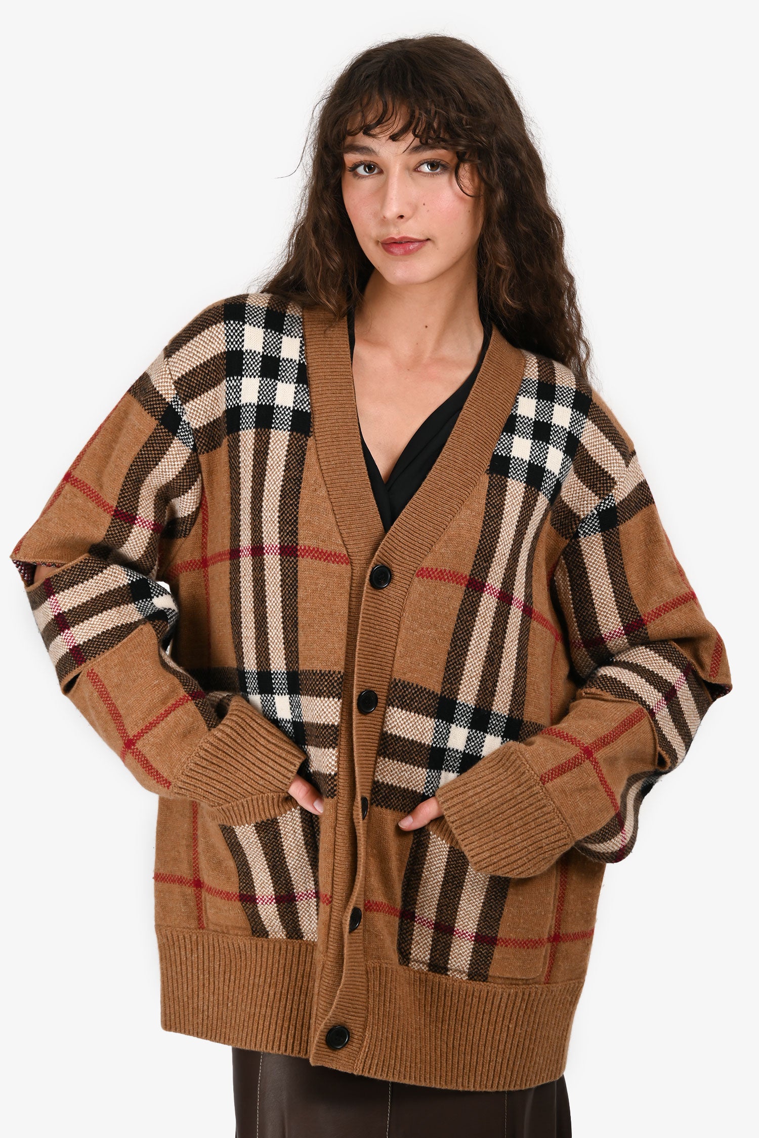 Refresh availabilityBurberry Brown Wool/Cashmere Check Cut Out Sleeve Oversized Cardigan. Pull-on. Front button closure. Ribbed neck, cuffs and hemline. 2 exterior slip pockets. Tonal stitching.