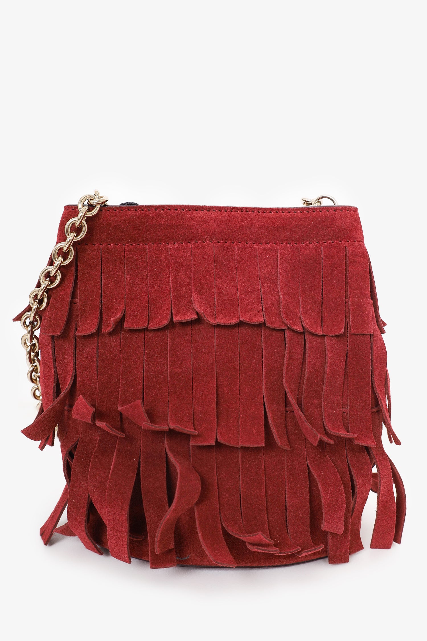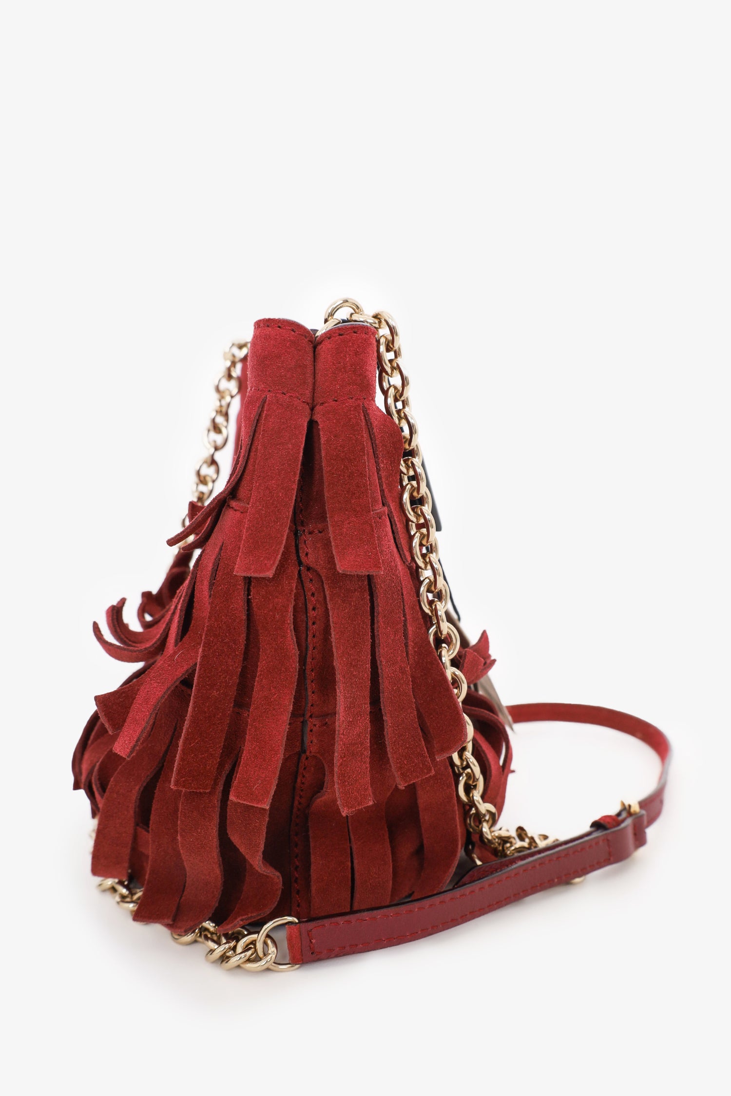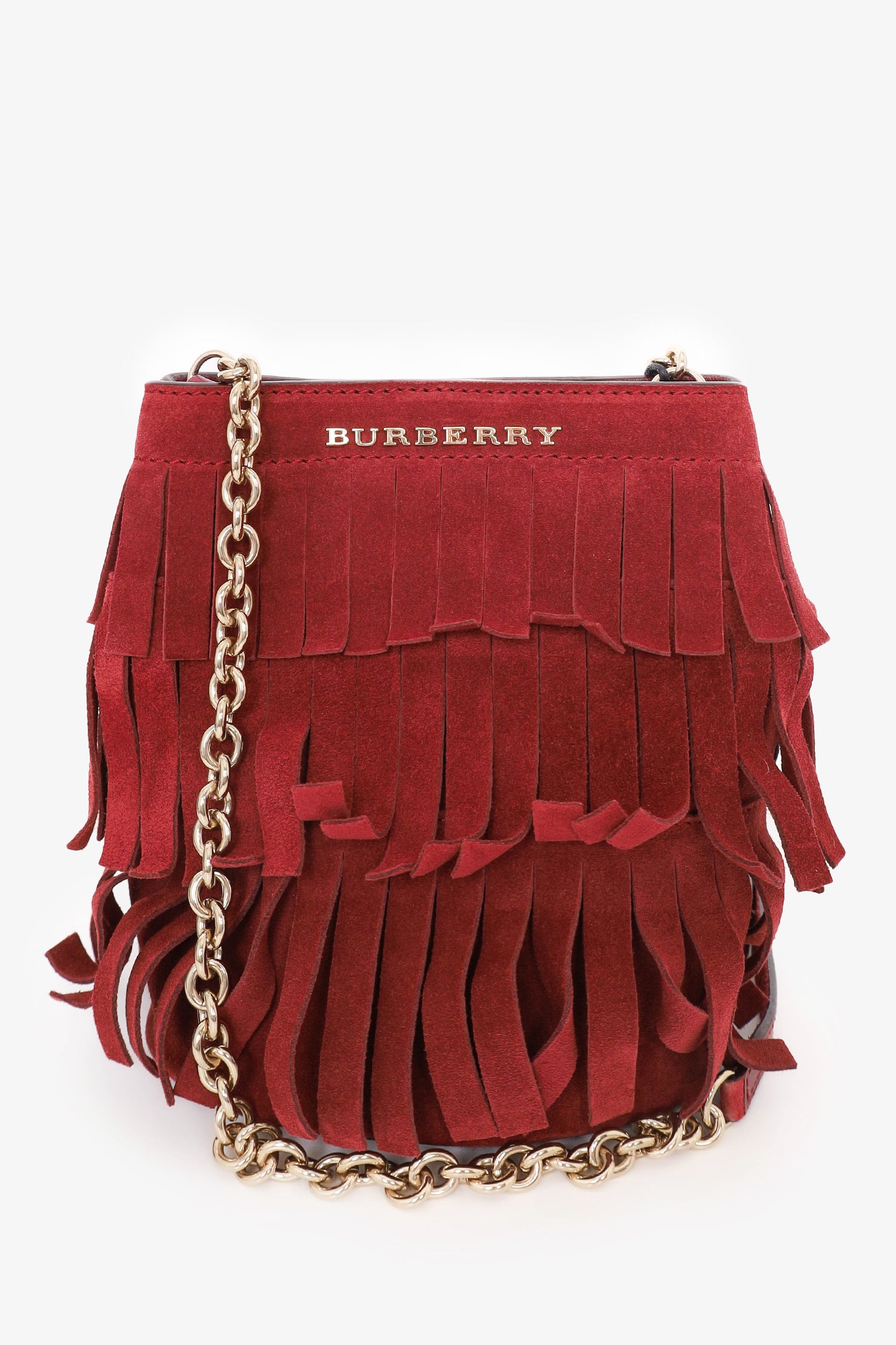 Refresh availabilityBurberry Burgundy 'Suede Baby' Fringe Crossbody Bucket Bag. Top magnet closure. Open suede interior with single leather wall slip pocket. Adjustable crossbody strap. Gold-tone hardware. Tonal stitching.
