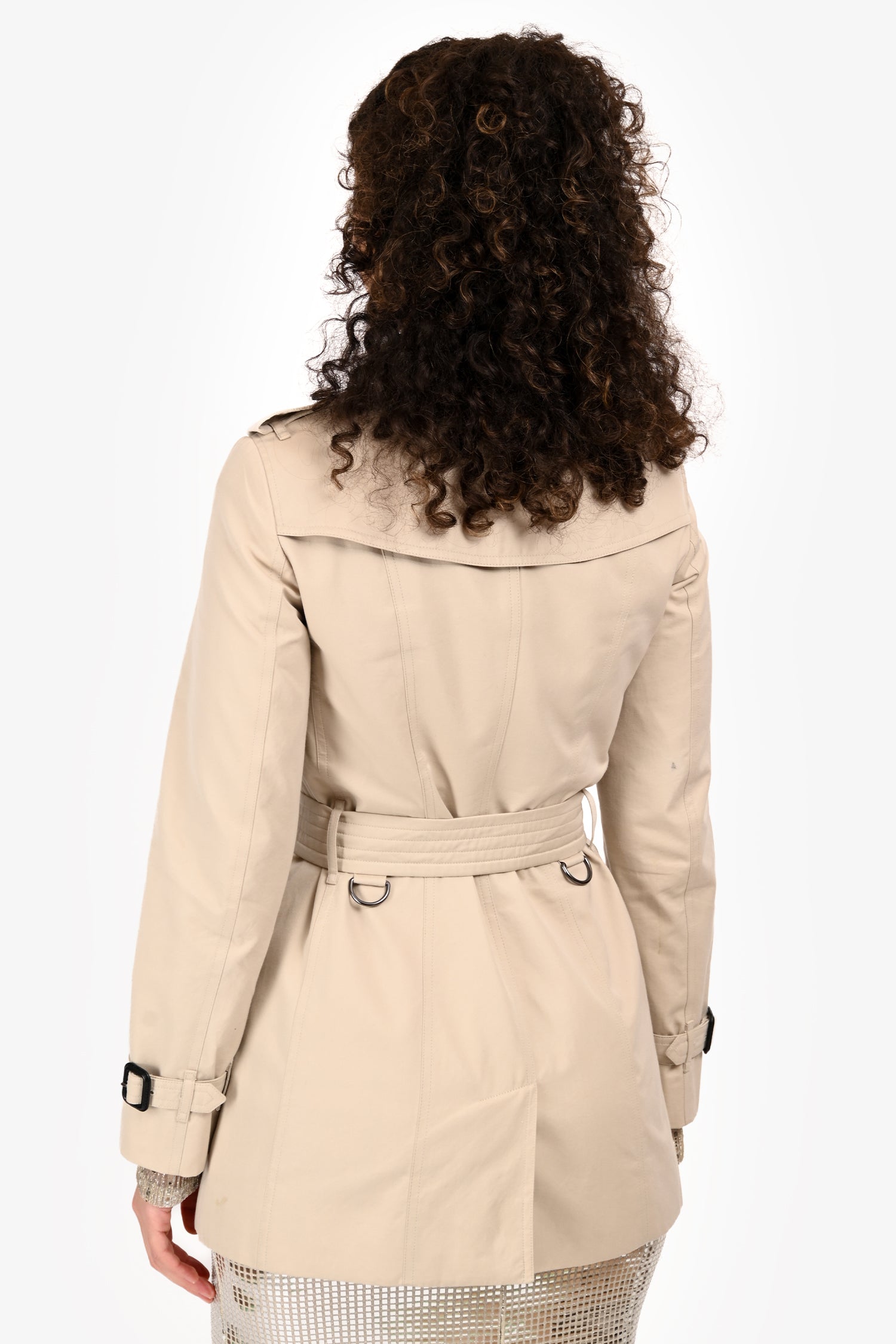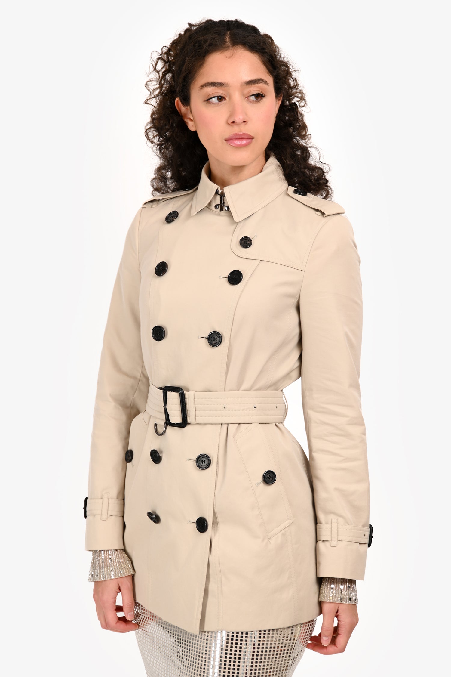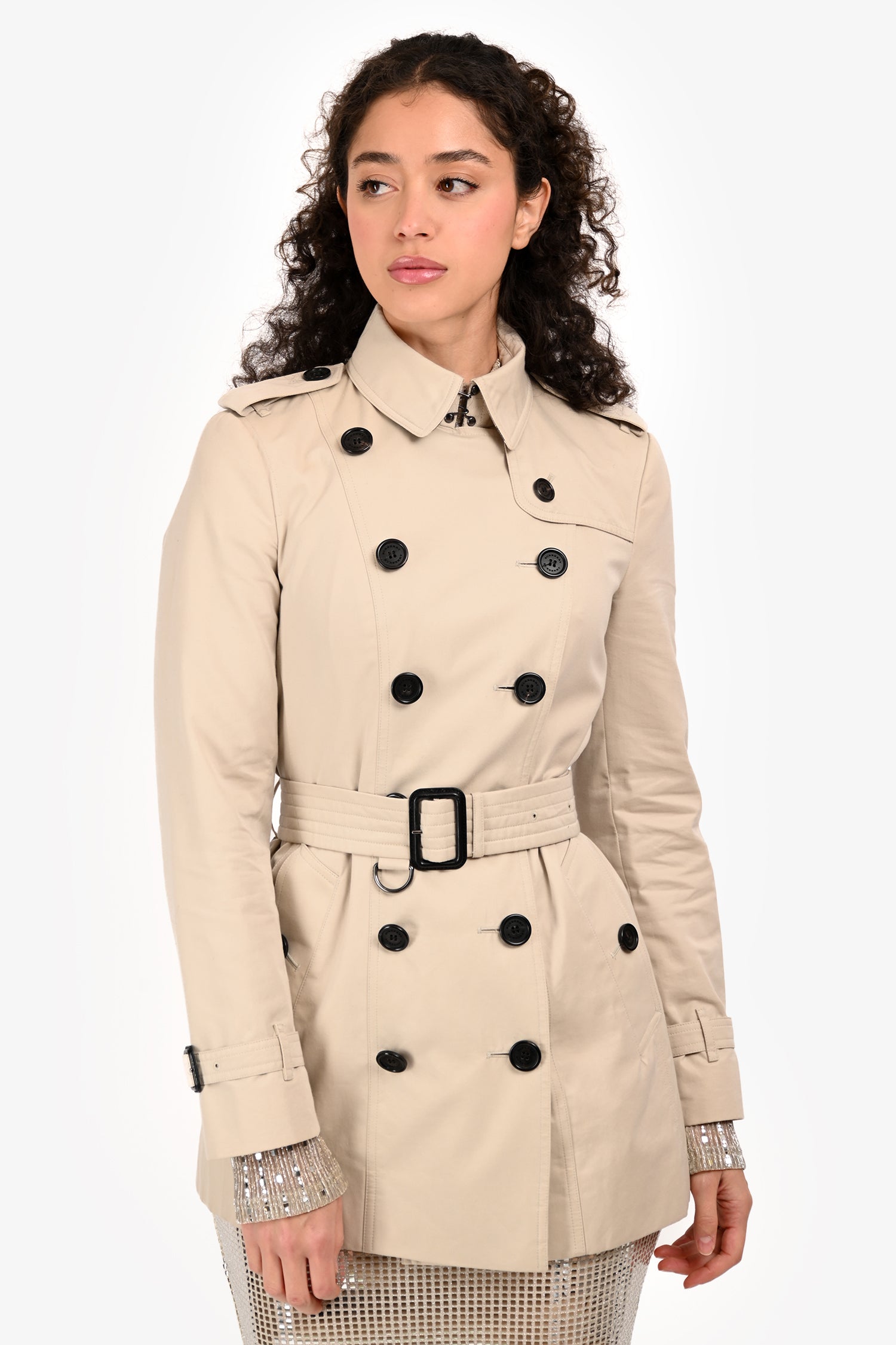 Refresh availabilityBurberry Cream Double Breasted Belted Short Trench. Slip-on. Double-breasted front button-up closure. Collar with hook-and-eye closure. Shoulder straps with button detail. Cuffs with an adjustable buckle strap detail. Removable buckle waist belt. 2 exterior slip pockets with button-up closure. Rear vent. Fully lined. Tonal stitching.