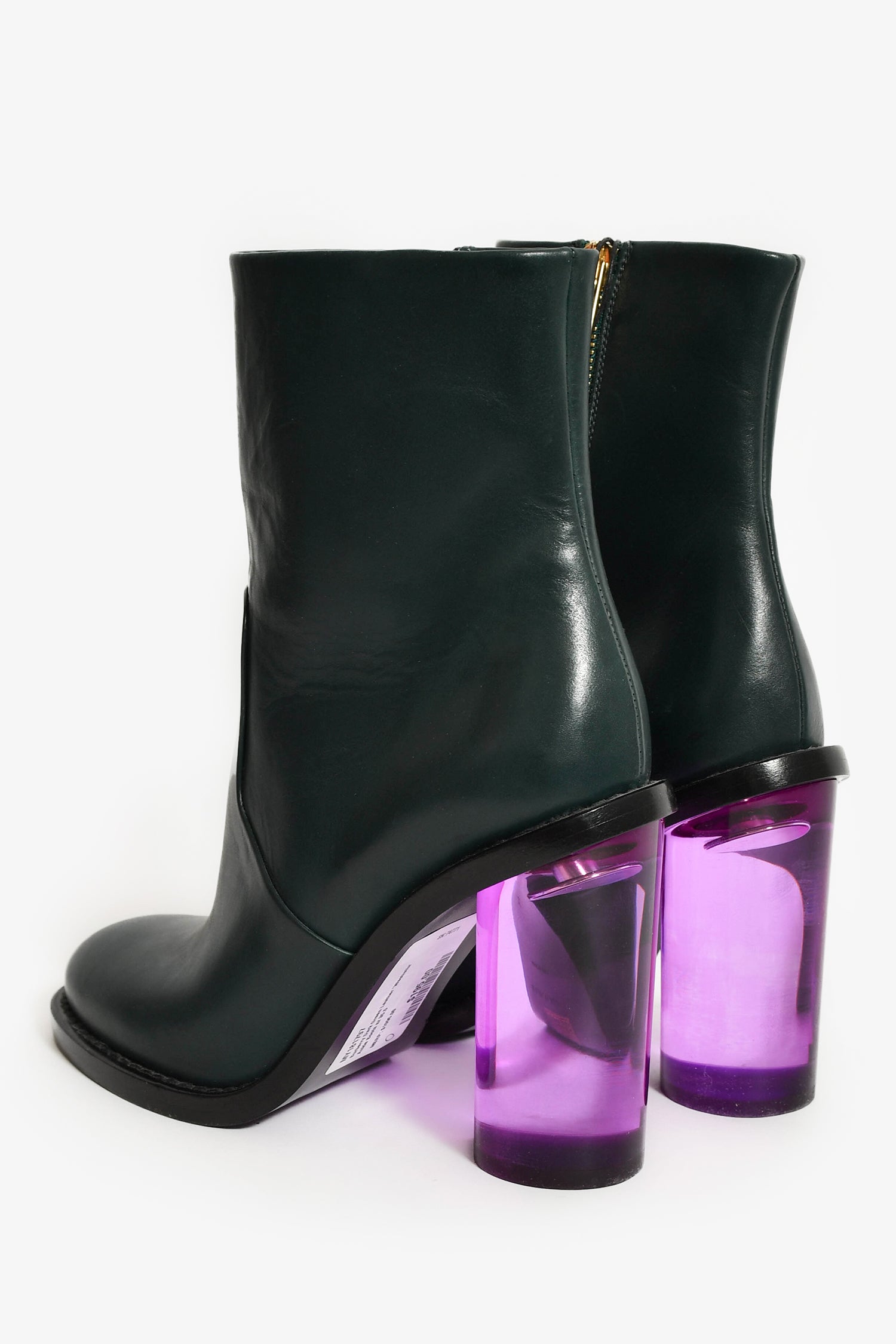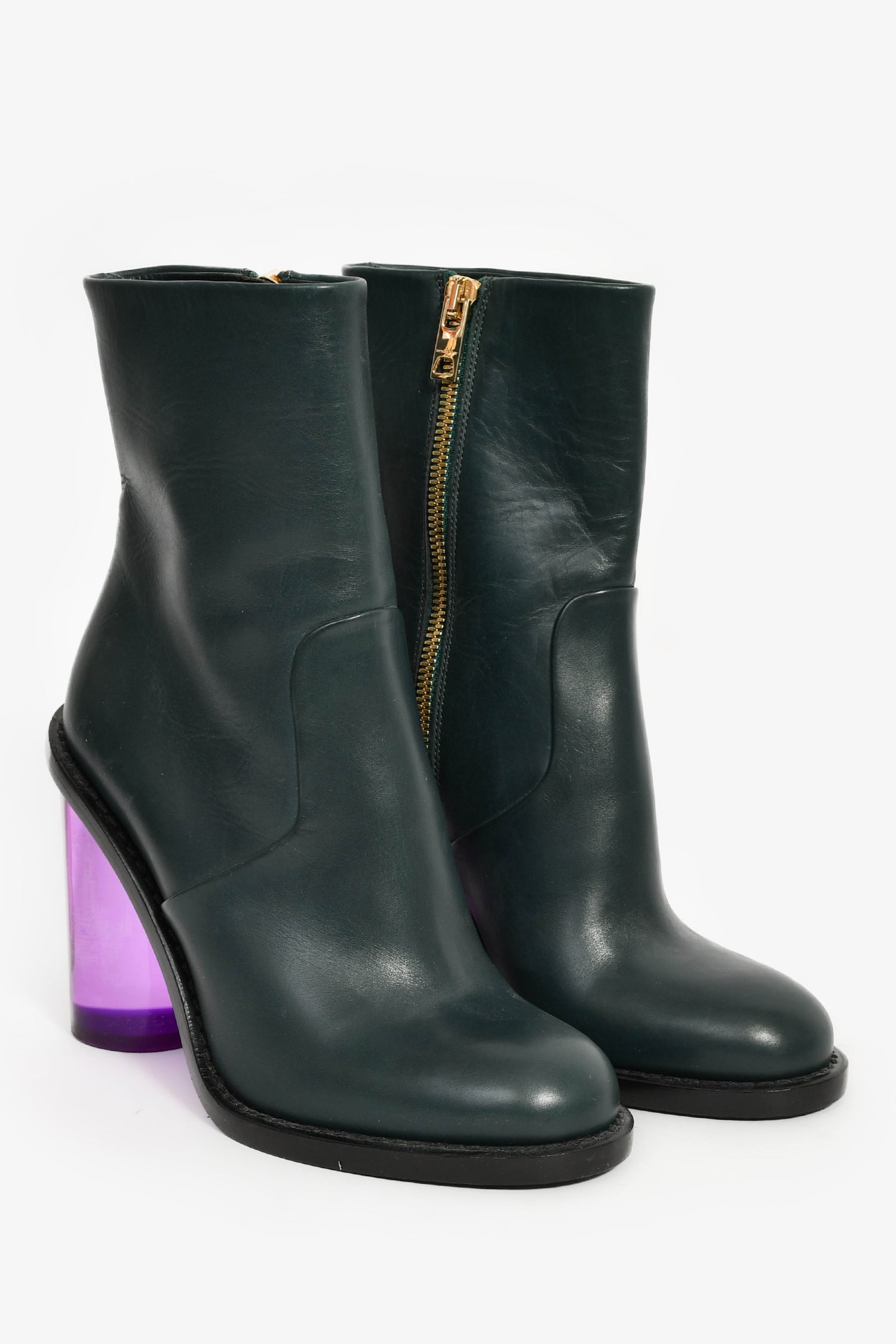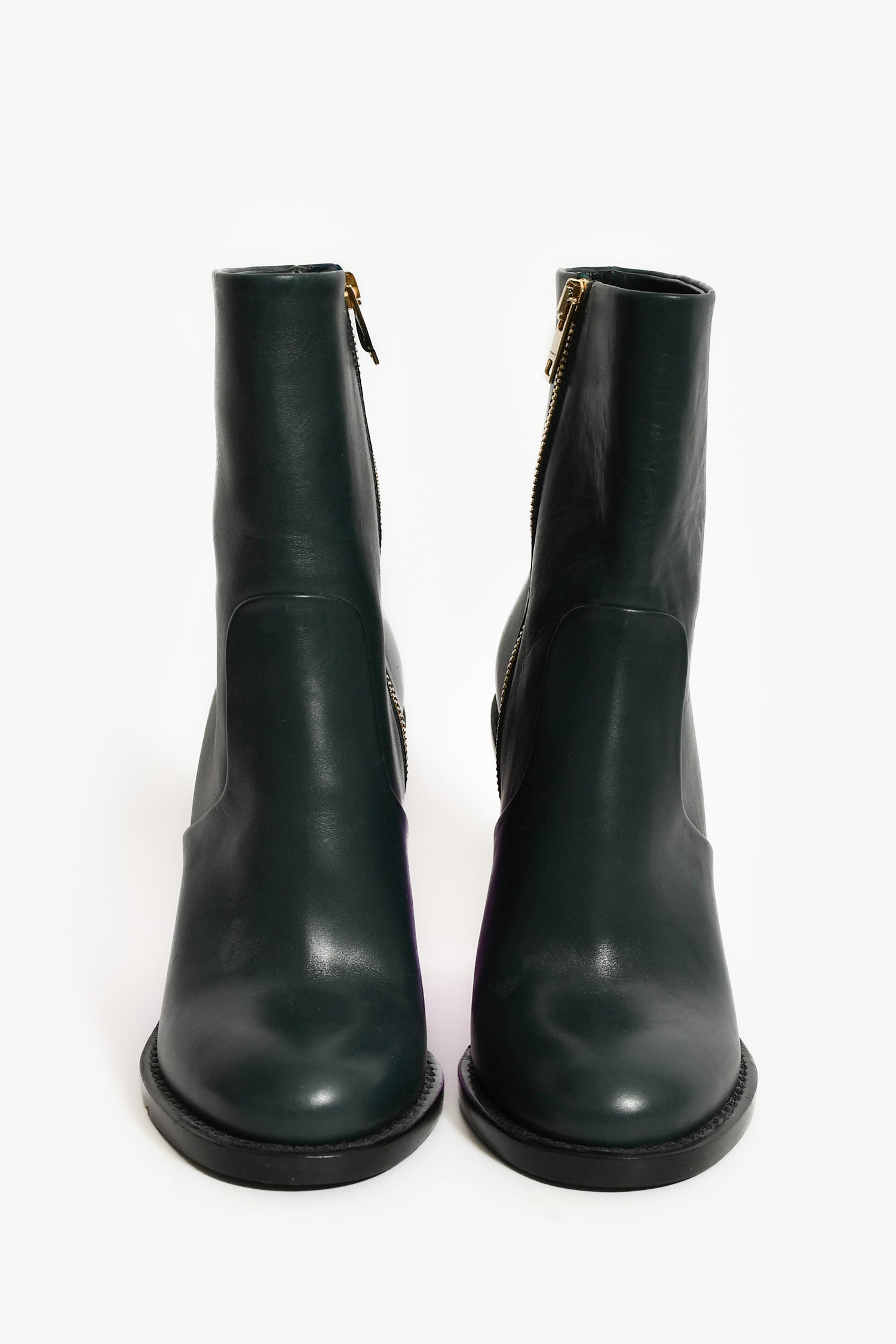 Refresh availabilityBurberry Dark Green Leather 'Westrella' Ankle Boots. Pull-on. Almond toe. Side zipper closure. Gold-tone hardware. Tonal stitching.