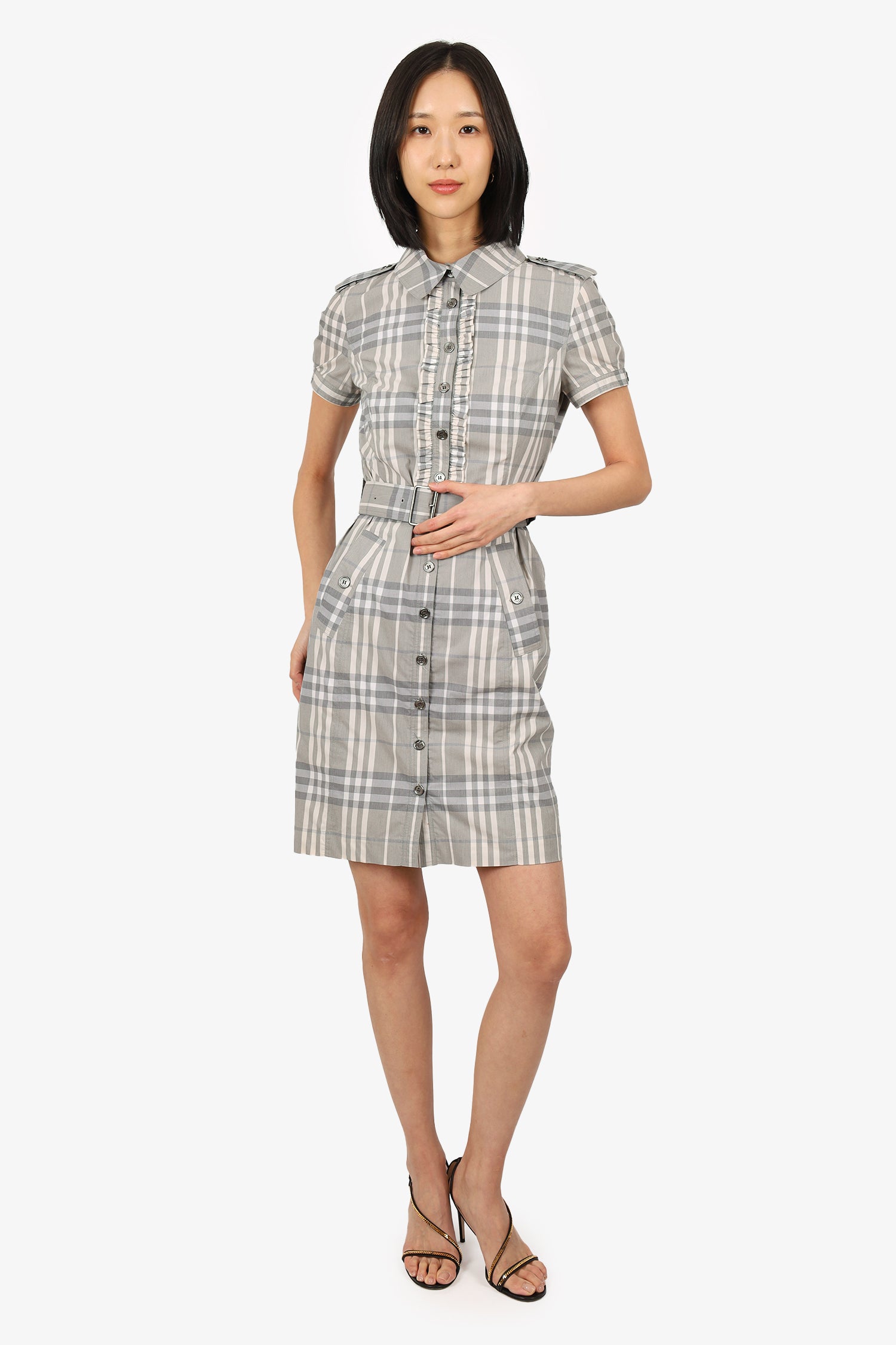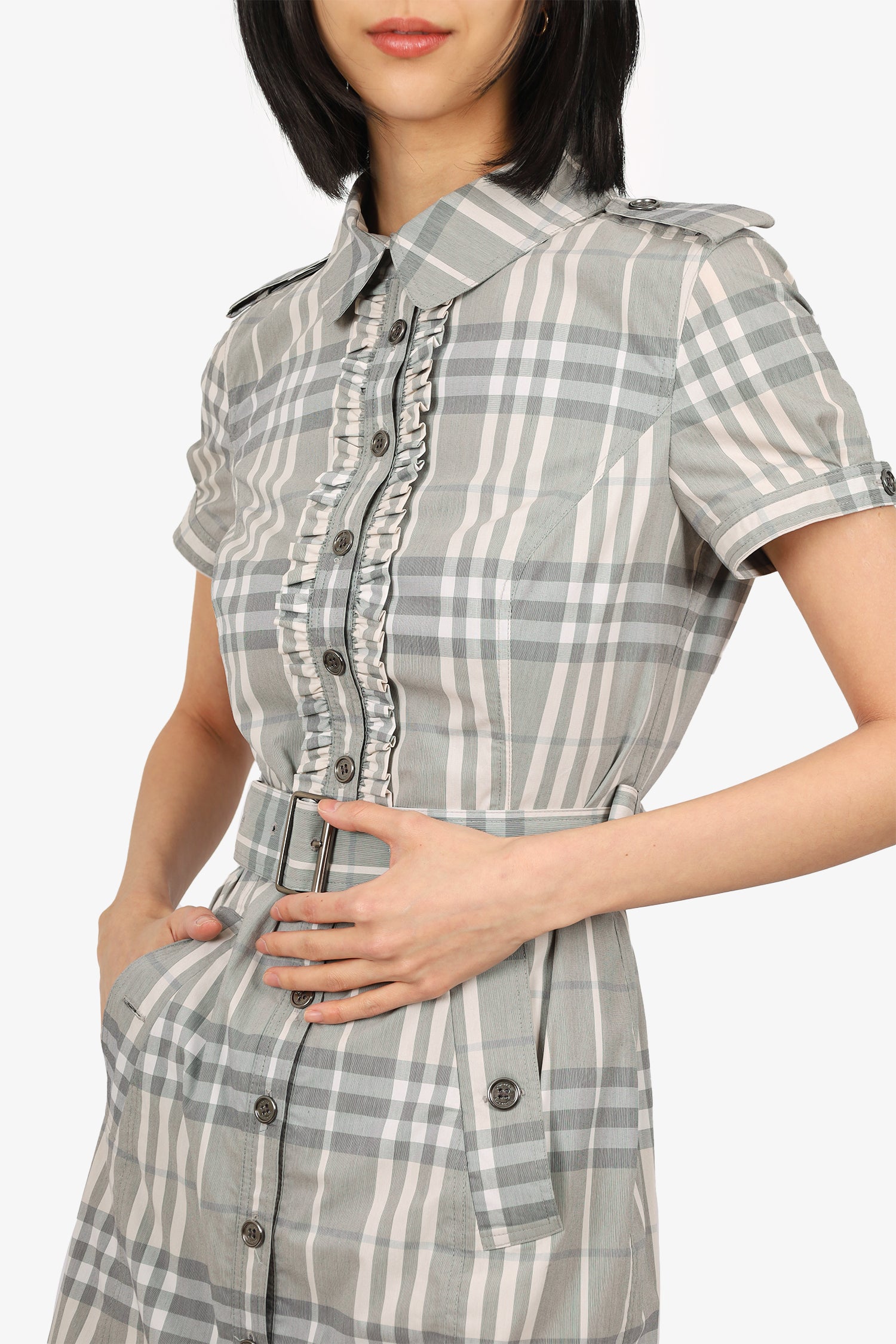 Refresh availabilityBurberry Grey Nova Check Print Ruffle Detail Belted Shirtdress Dress. Front button closure. Waist belt closure. Front button slip pockets. Tonal stitching.