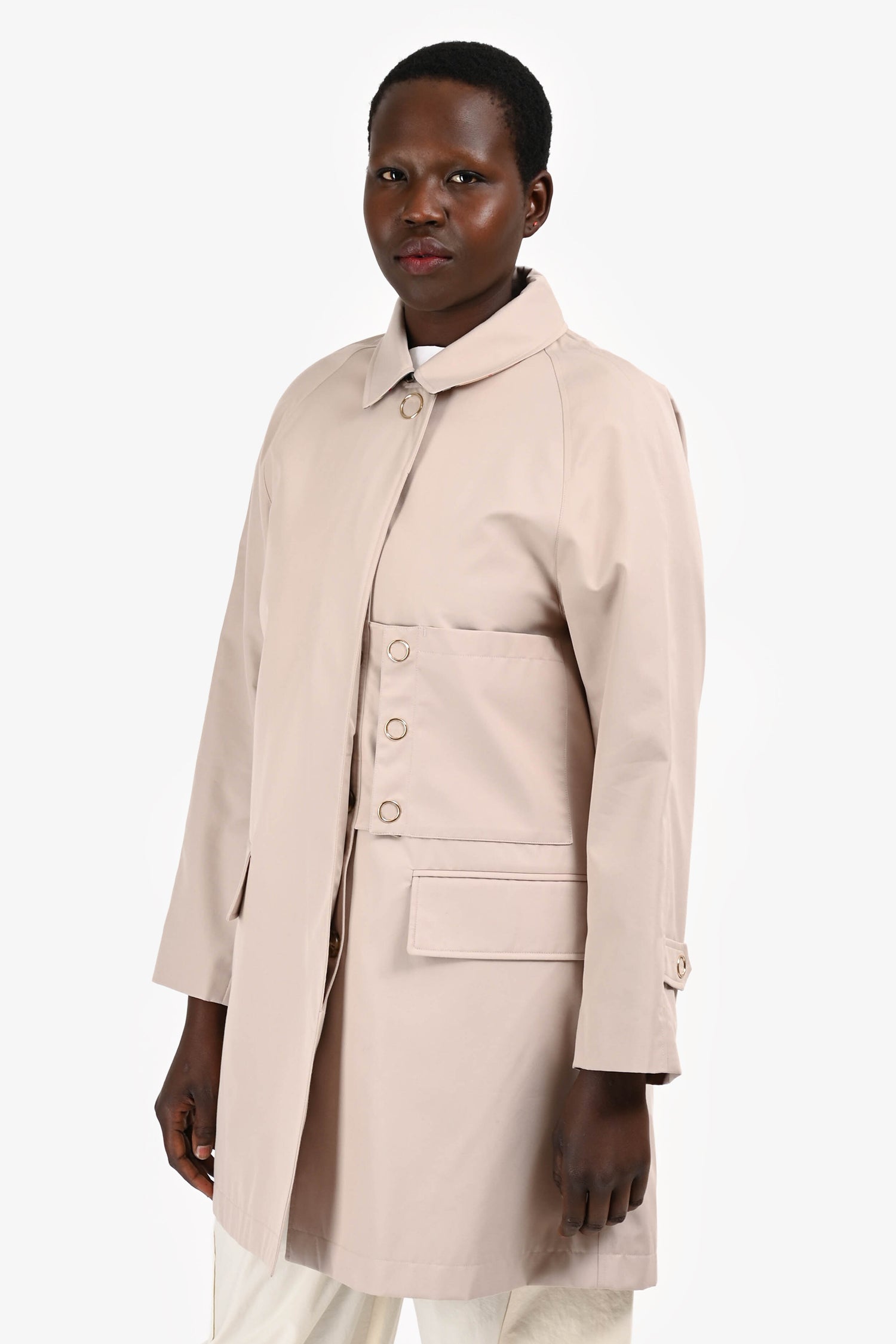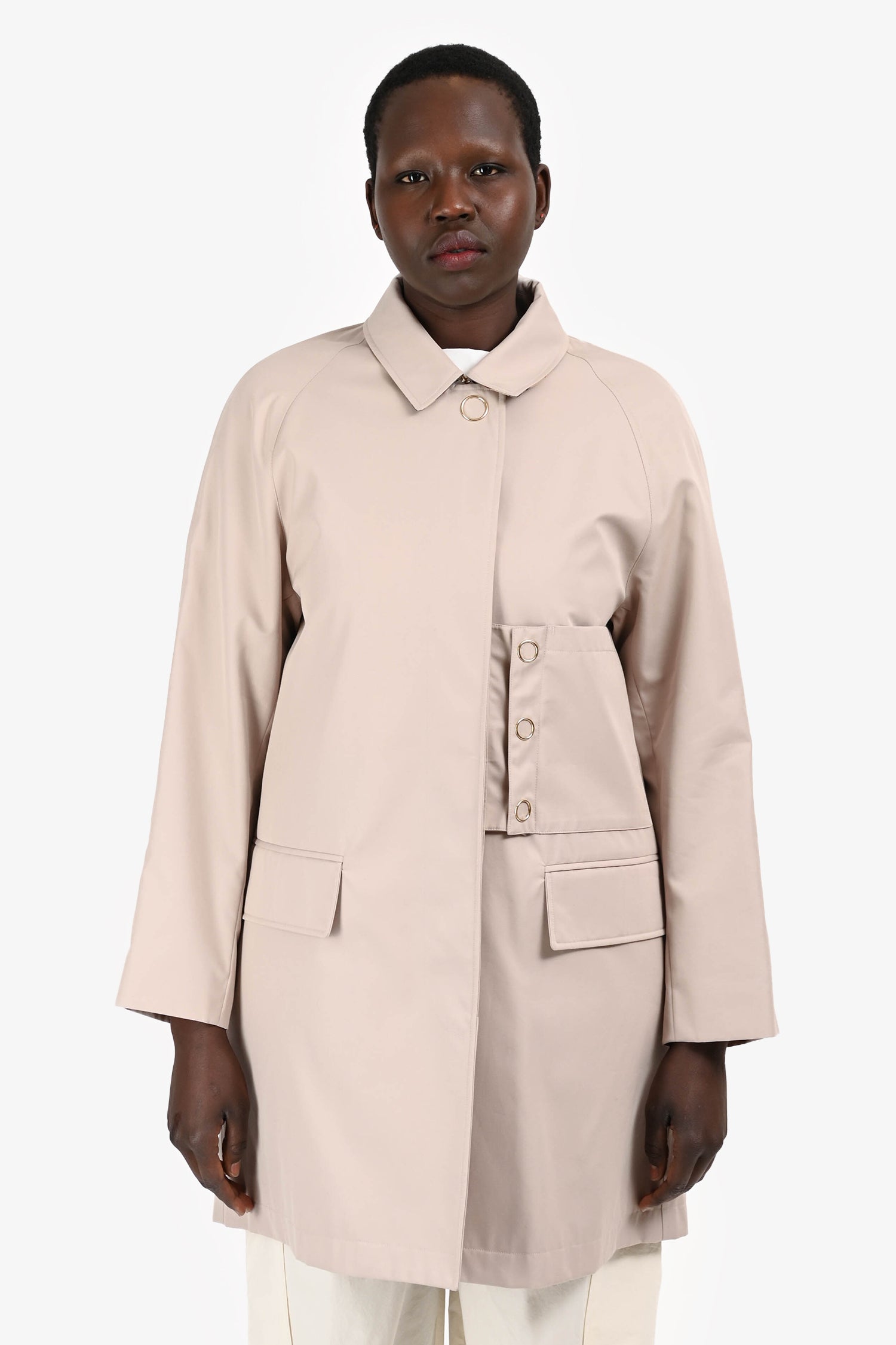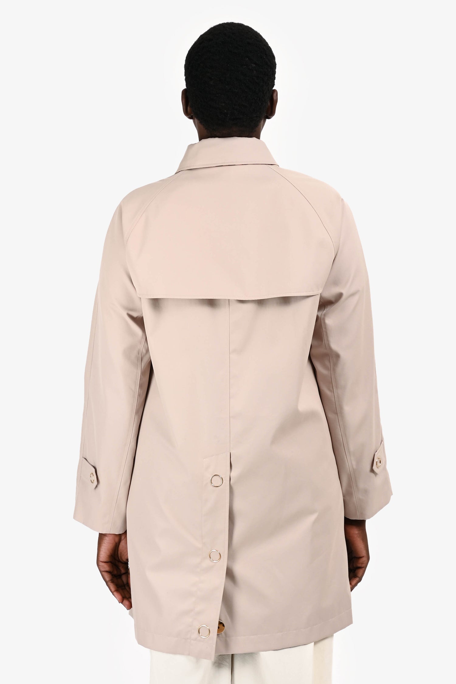 Refresh availabilityBurberry Light Pink Short Trench Coat. Front button closure. Belted waist and cuffs. Side pockets. Two front faux flap pockets. Front slip pockets. Fully lined. Tonal stitching.