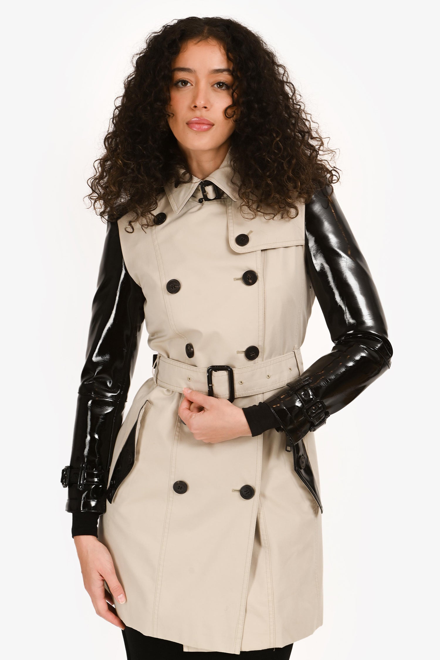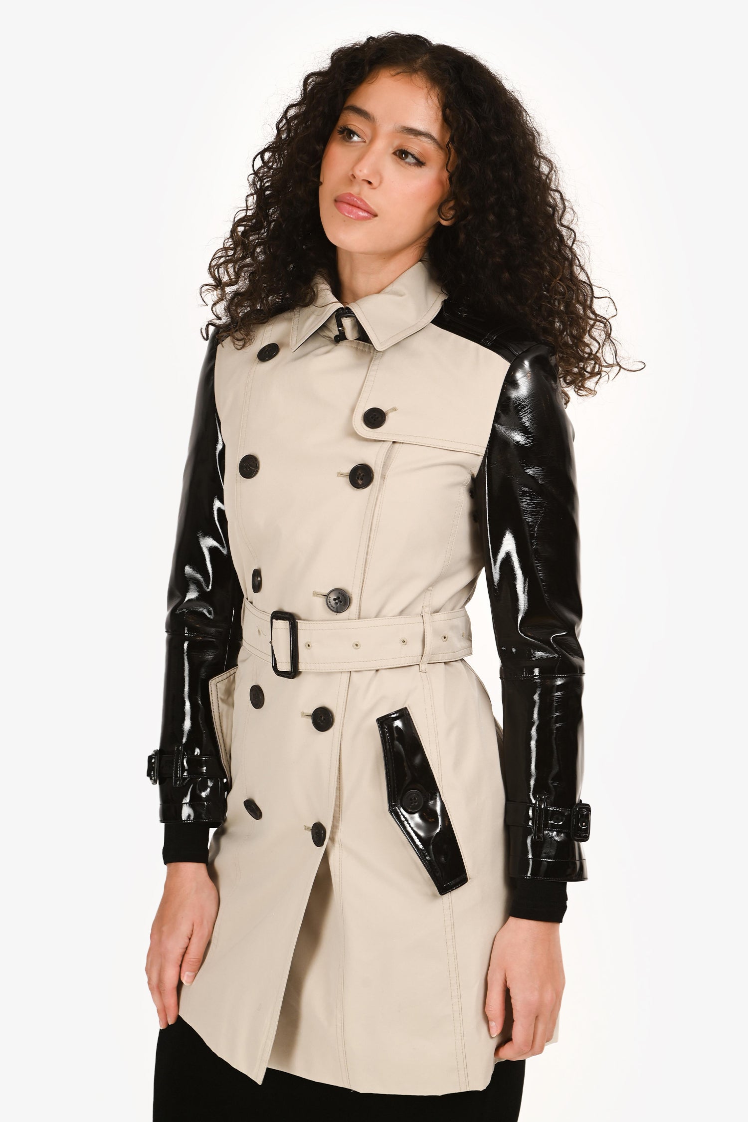 Burberry London Beige/Black Faux Leather Sleeve Trench Coat Size 4 US