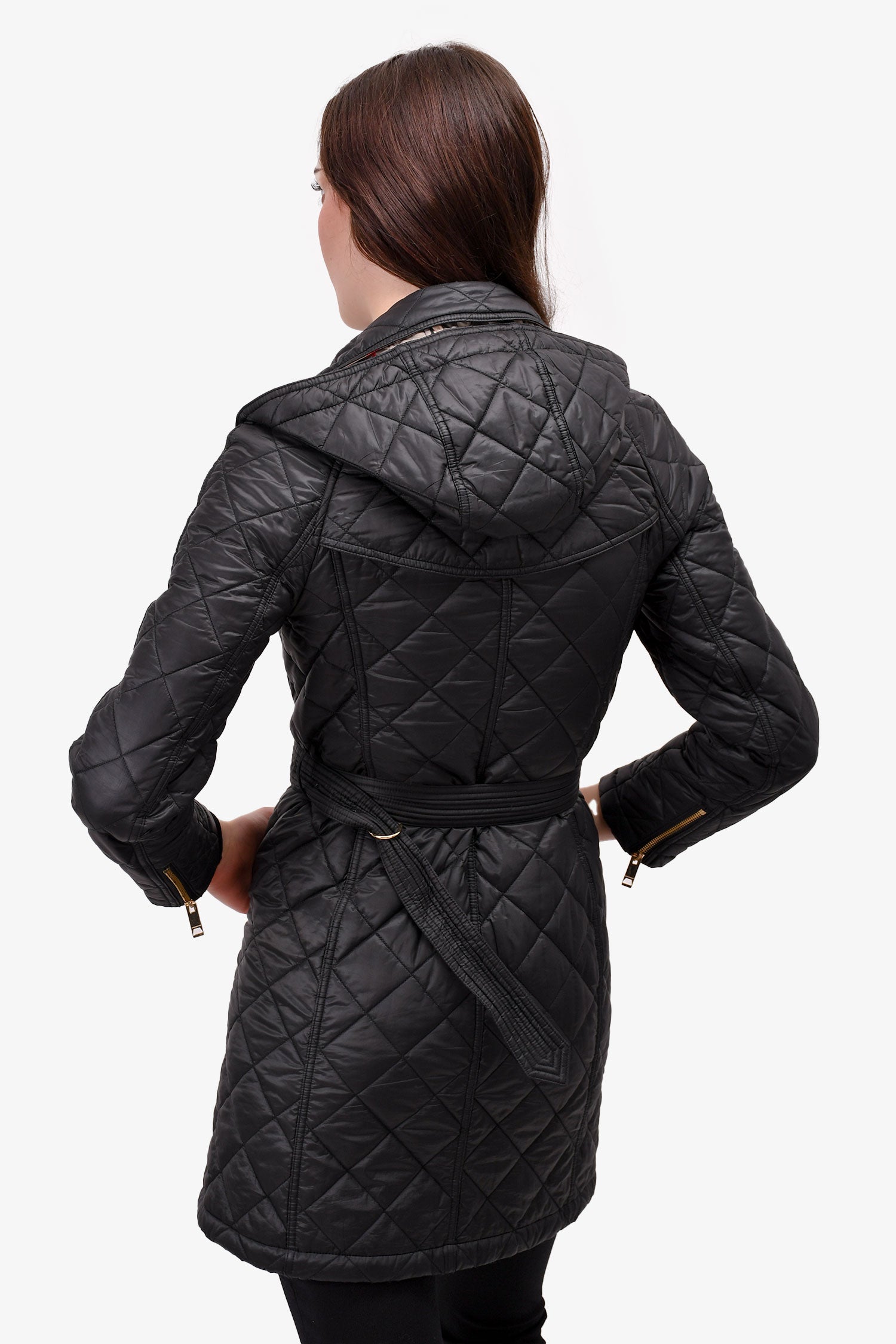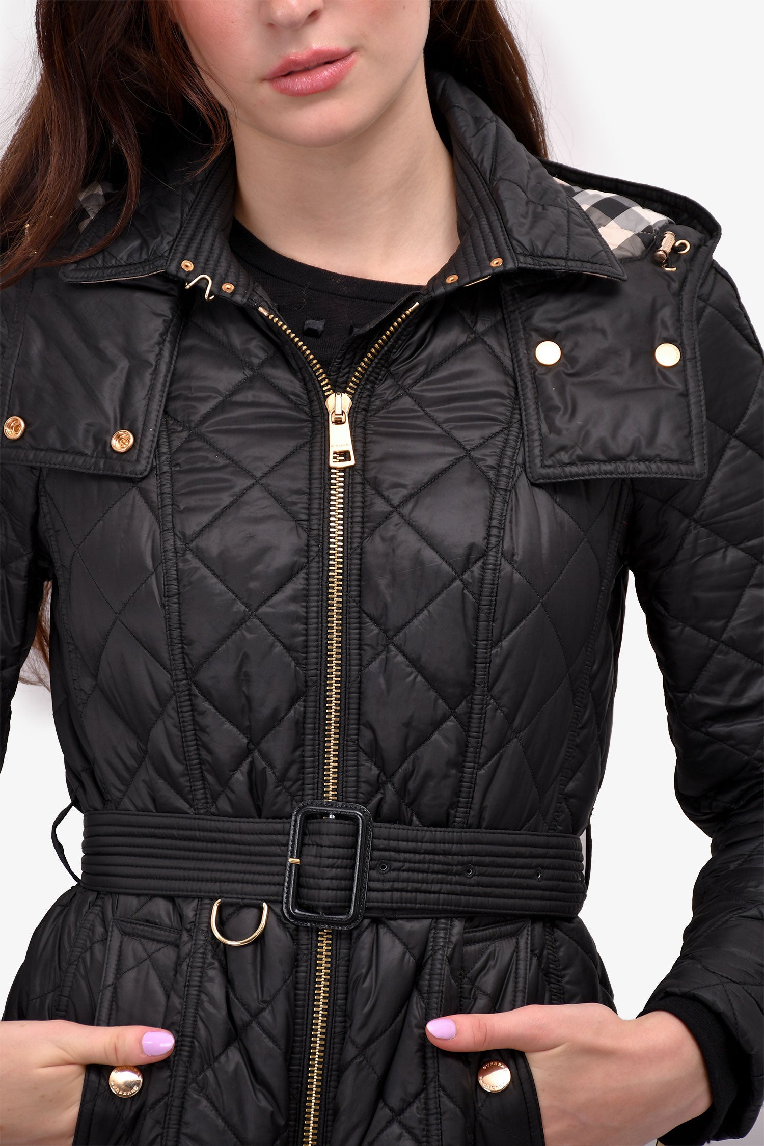 Refresh availabilityBurberry London Black Diamond Quilted Coat with Belt. Front zip closure. Front pockets with button closure. Waist belt with buckle closure. Nova check interior lining. Gold-tone hardware. Detachable zip hood.