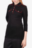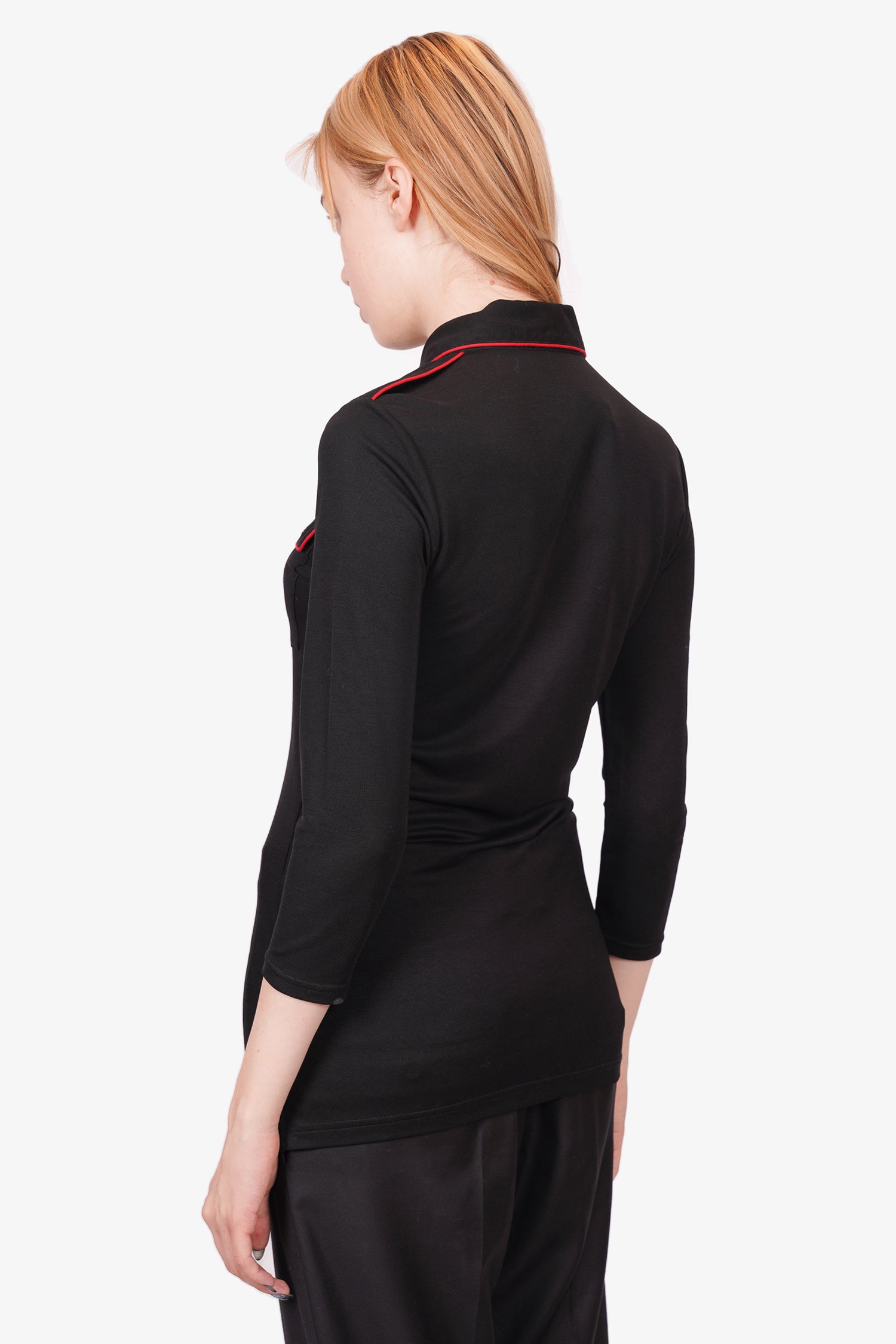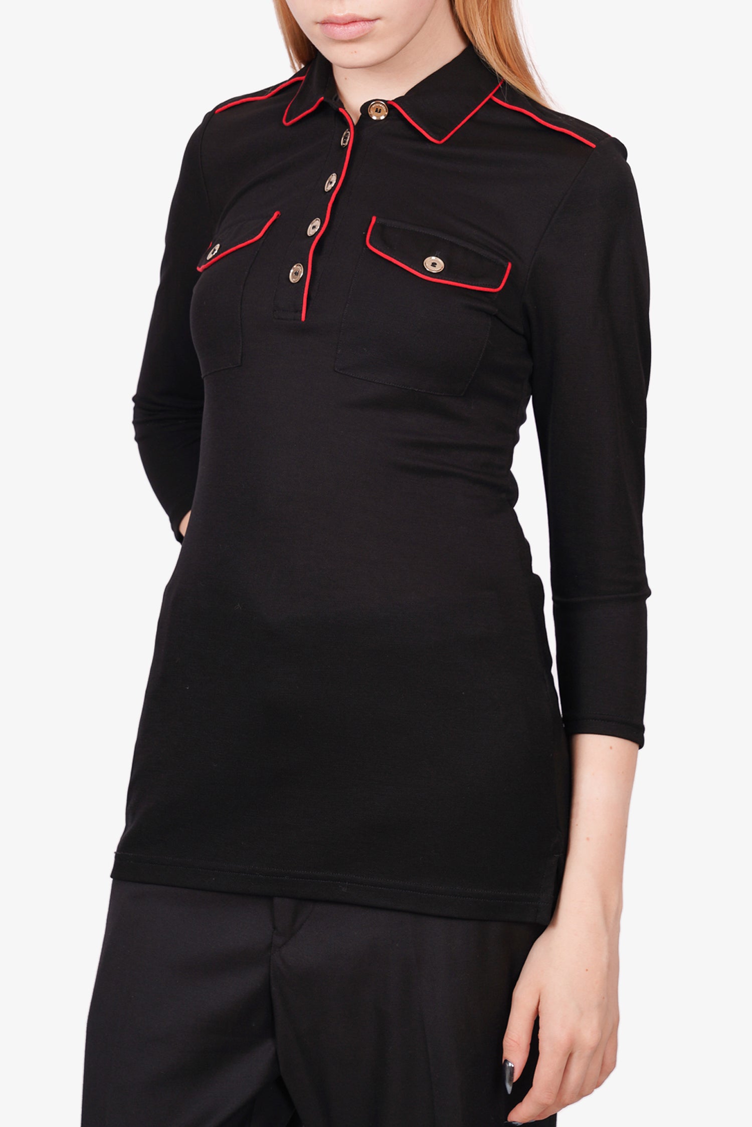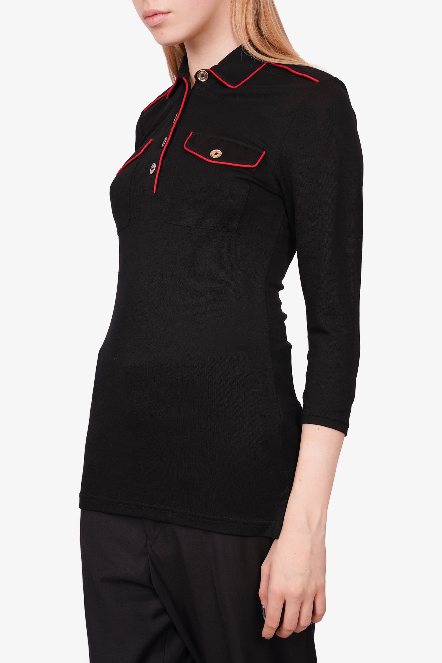 Refresh availabilityBurberry London Black/Red Jersey 3/4 Sleeve Top. Collared neckline. Front button up closure. 2 front pockets with button closure. Gold-toned hardware. Tonal stitching.