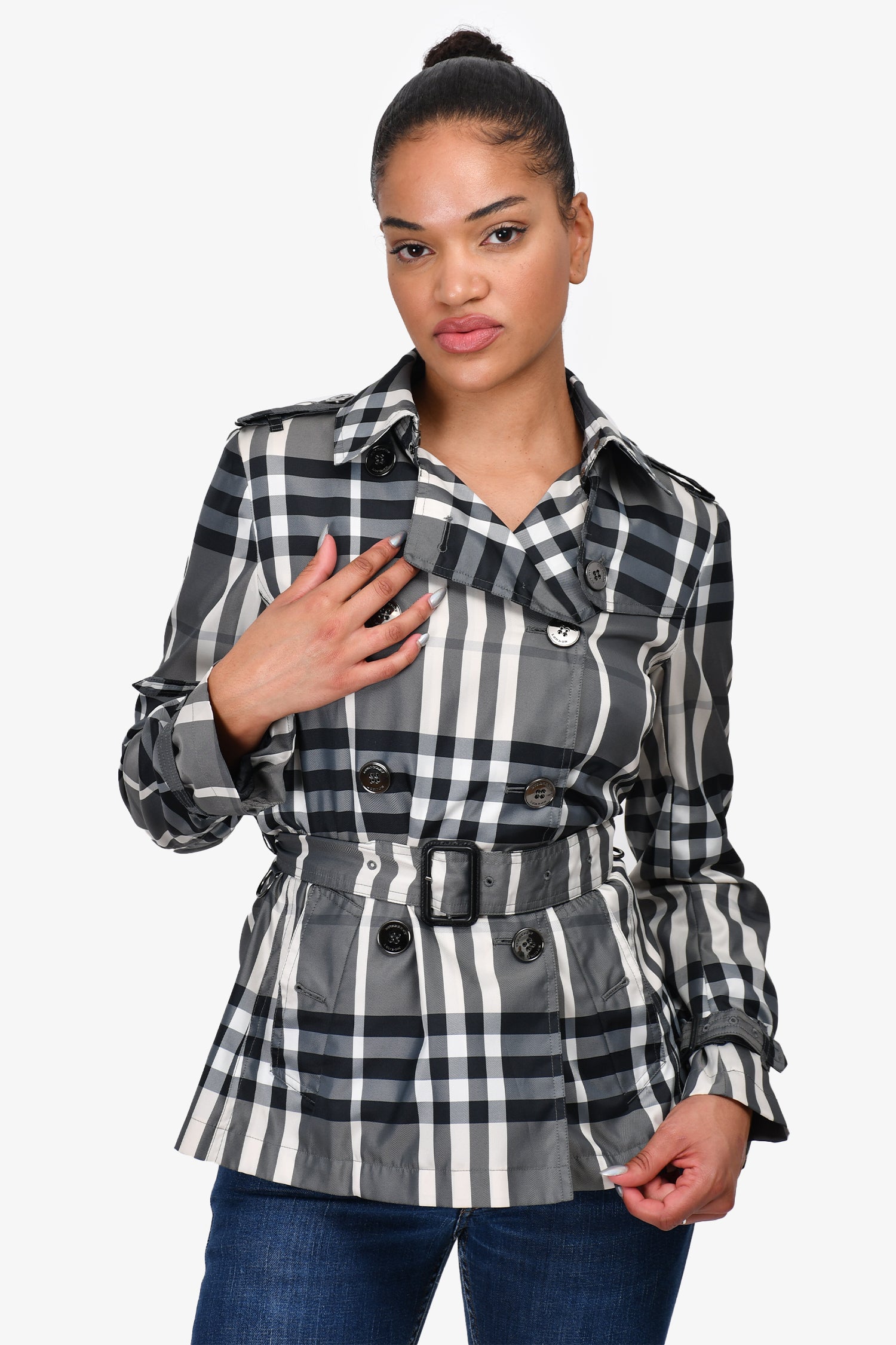 Refresh availabilityBurberry London Black/White Tartan Belted Short Trench Jacket. Front button-up closure. Strap with buckle closure on the cuffs. Waist belt with buckle closure.