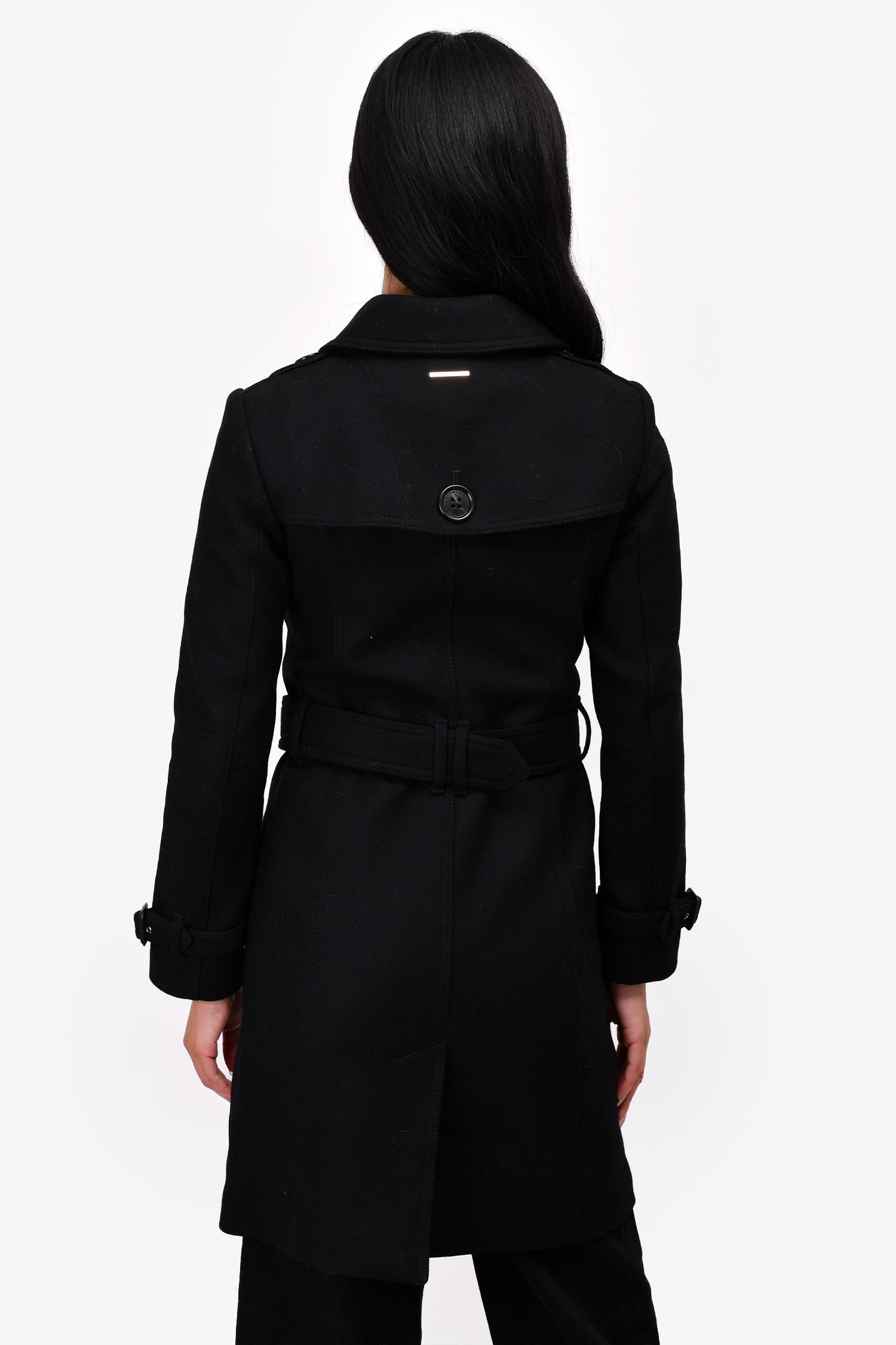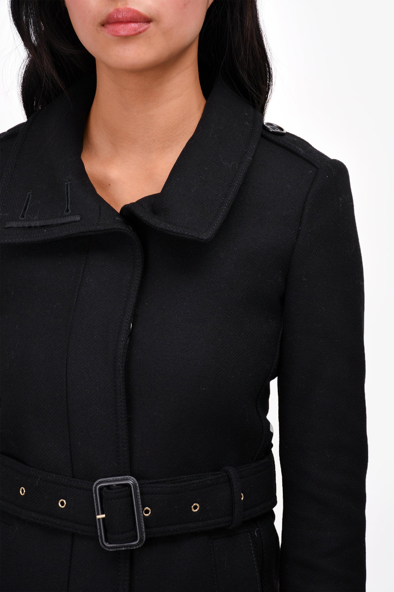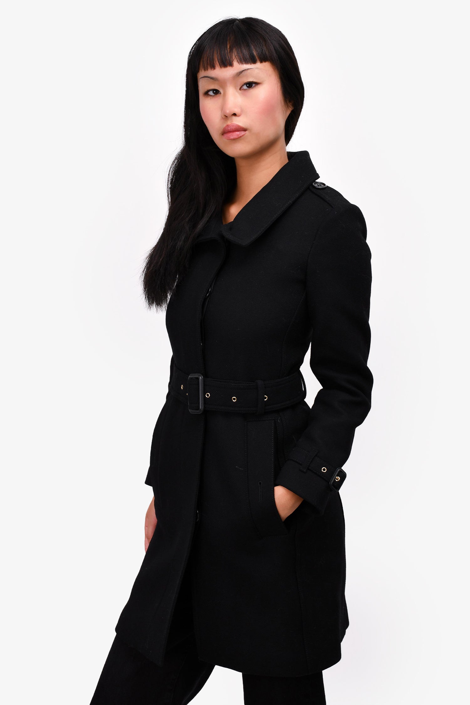 Refresh availabilityBurberry London Black Wool Belted Coat. Front button-up closure. Front pockets with button closure. Lined. Waist belt with buckle closure.