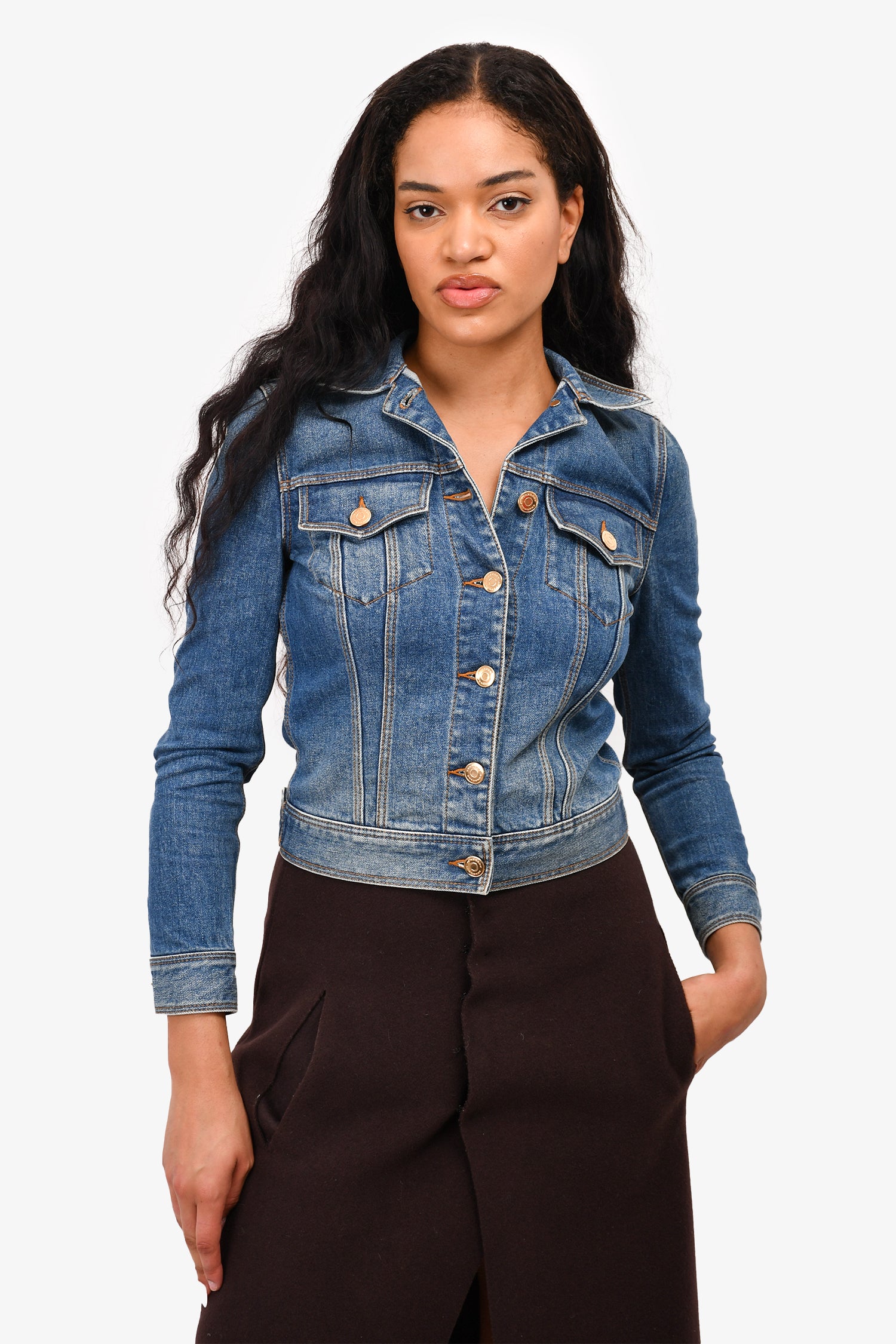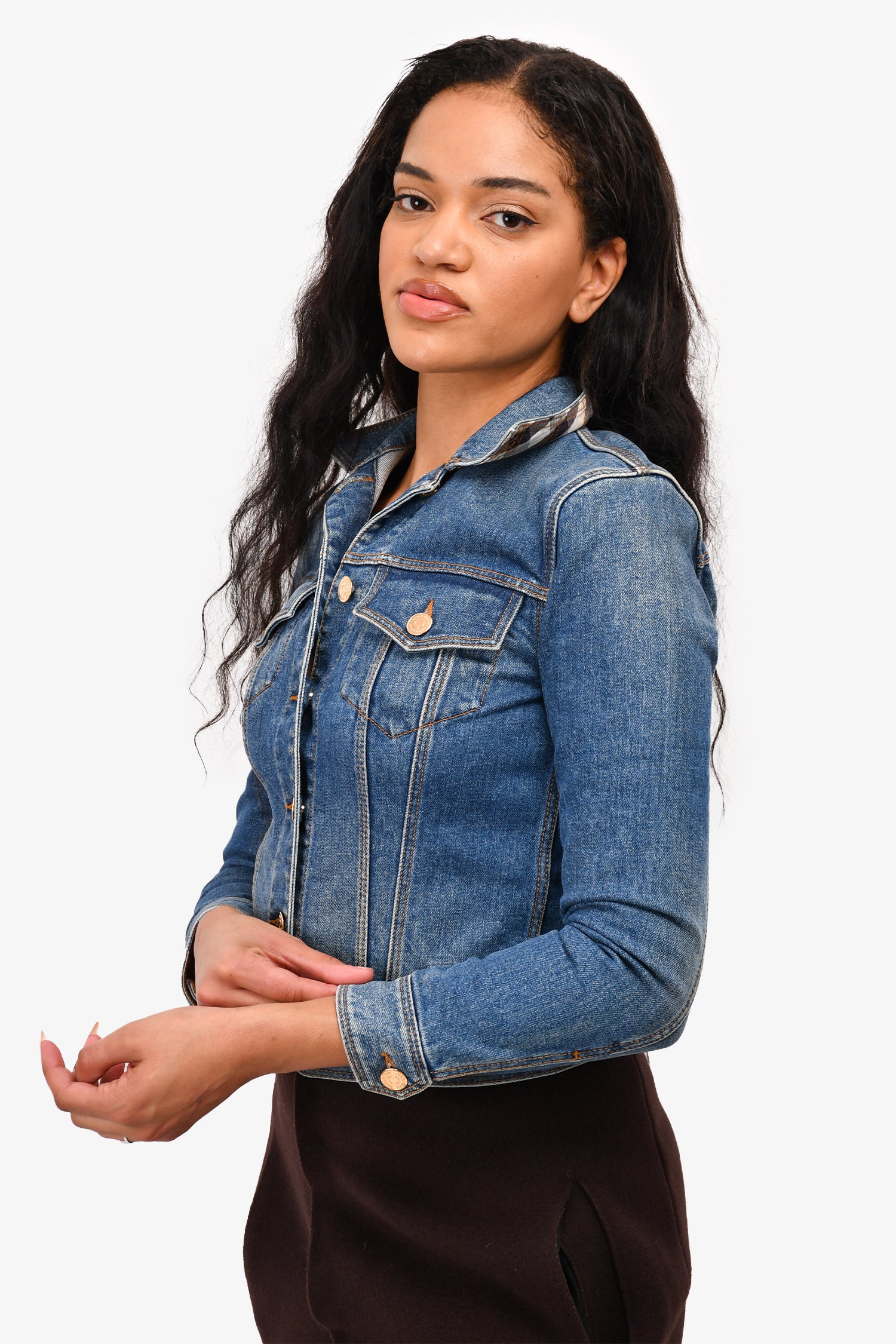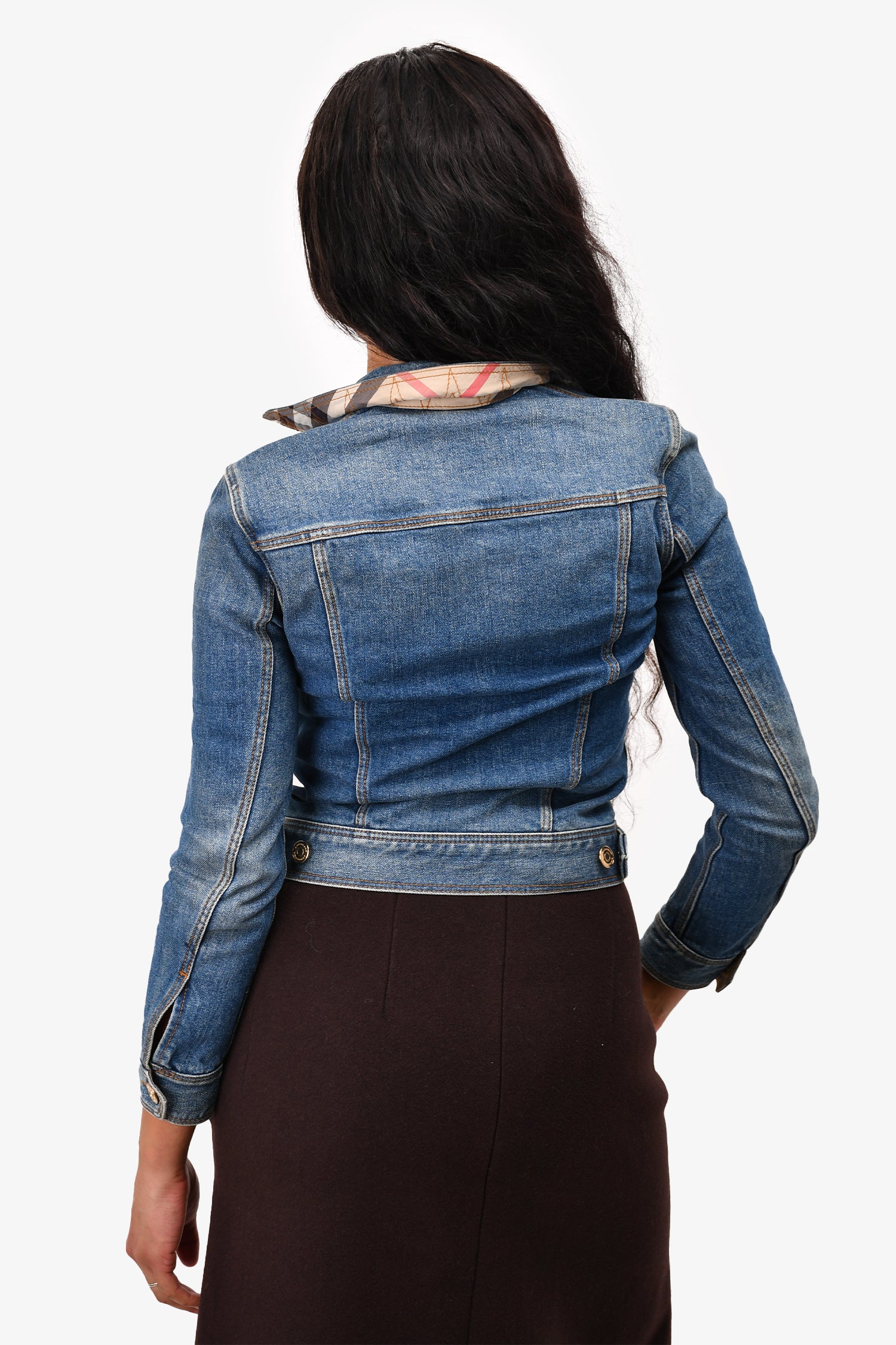 Refresh availabilityBurberry London Blue Denim Jacket. Gold-tone hardware. Two front breast pockets. Button-up closure. Fold-up lapel with signature brand print on the reverse side. Mid-length. Tonal stitching.