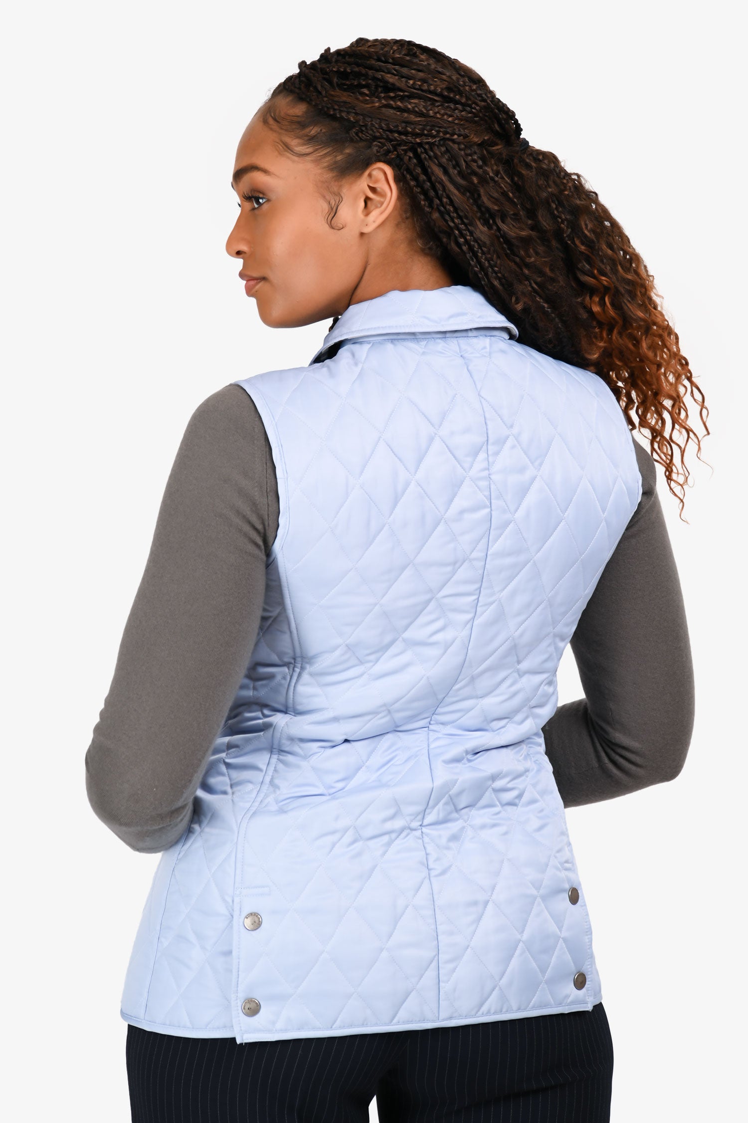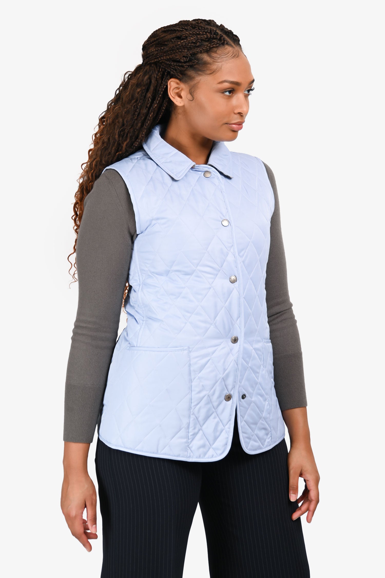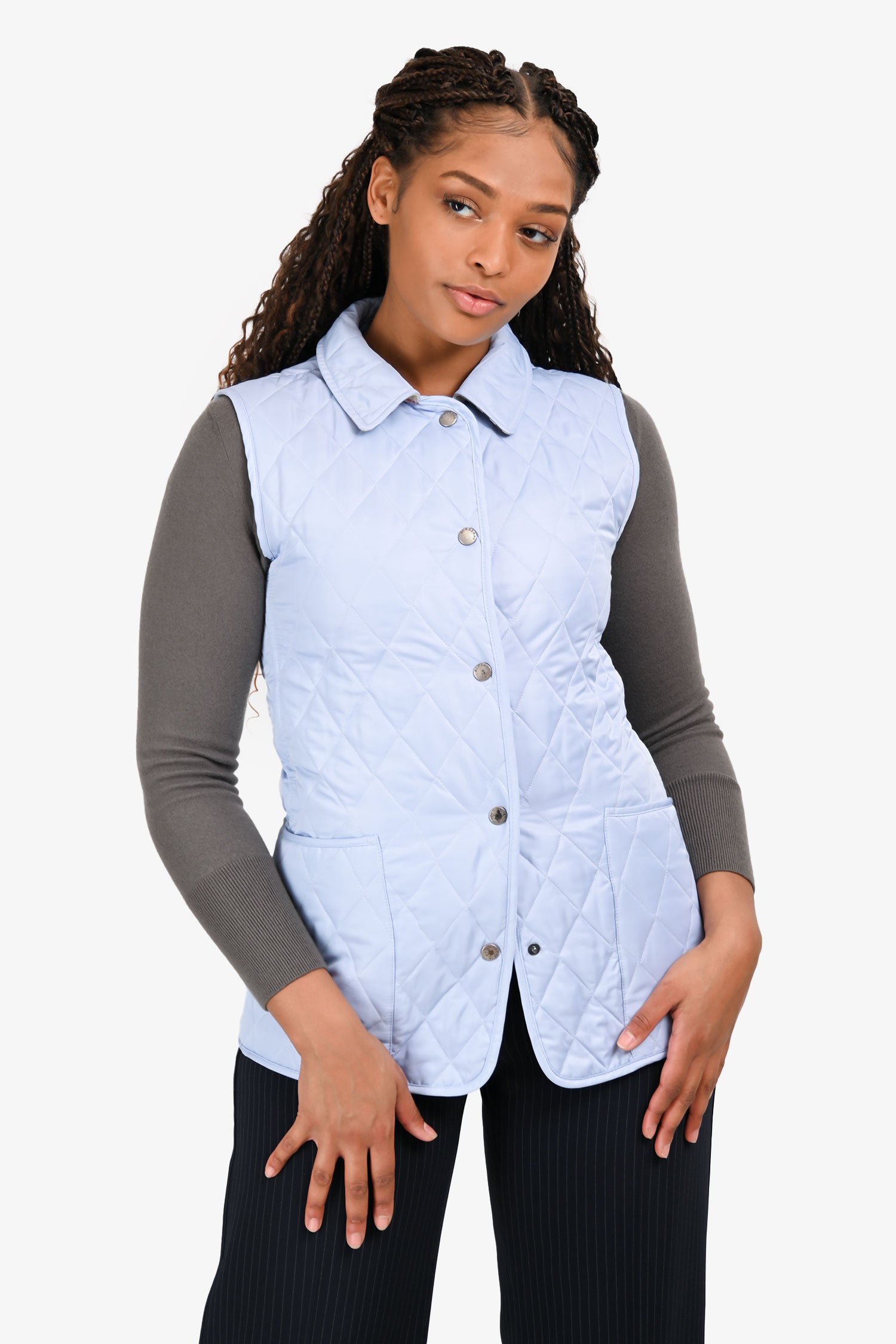 Refresh availabilityBurberry London Blue Quilted Lightweight Vest. Slip-on. Collared neckline. Front snap button closure. 2 exterior slip pockets. Snap button details at the hem. Silver-tone hardware. Tonal stitching.