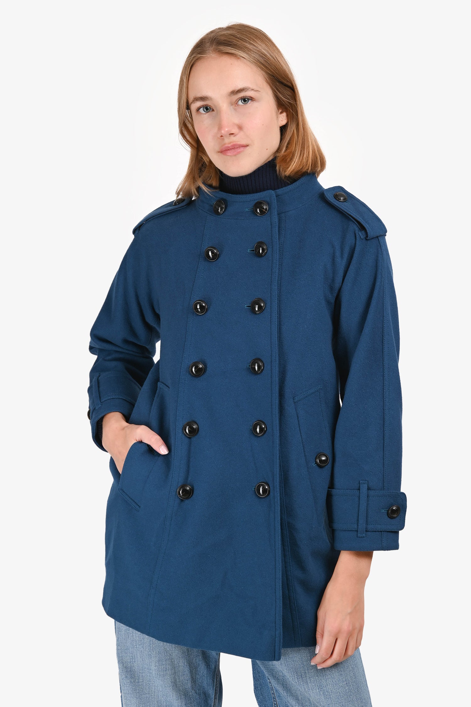 Refresh availabilityBurberry London Blue Wool Double Breasted Coat. Slip-on. Front button-up closure. Raised collar with button closures. Strap with button details on the shoulders. 2 front pockets with button closure. Lined interior. Tonal stitching.