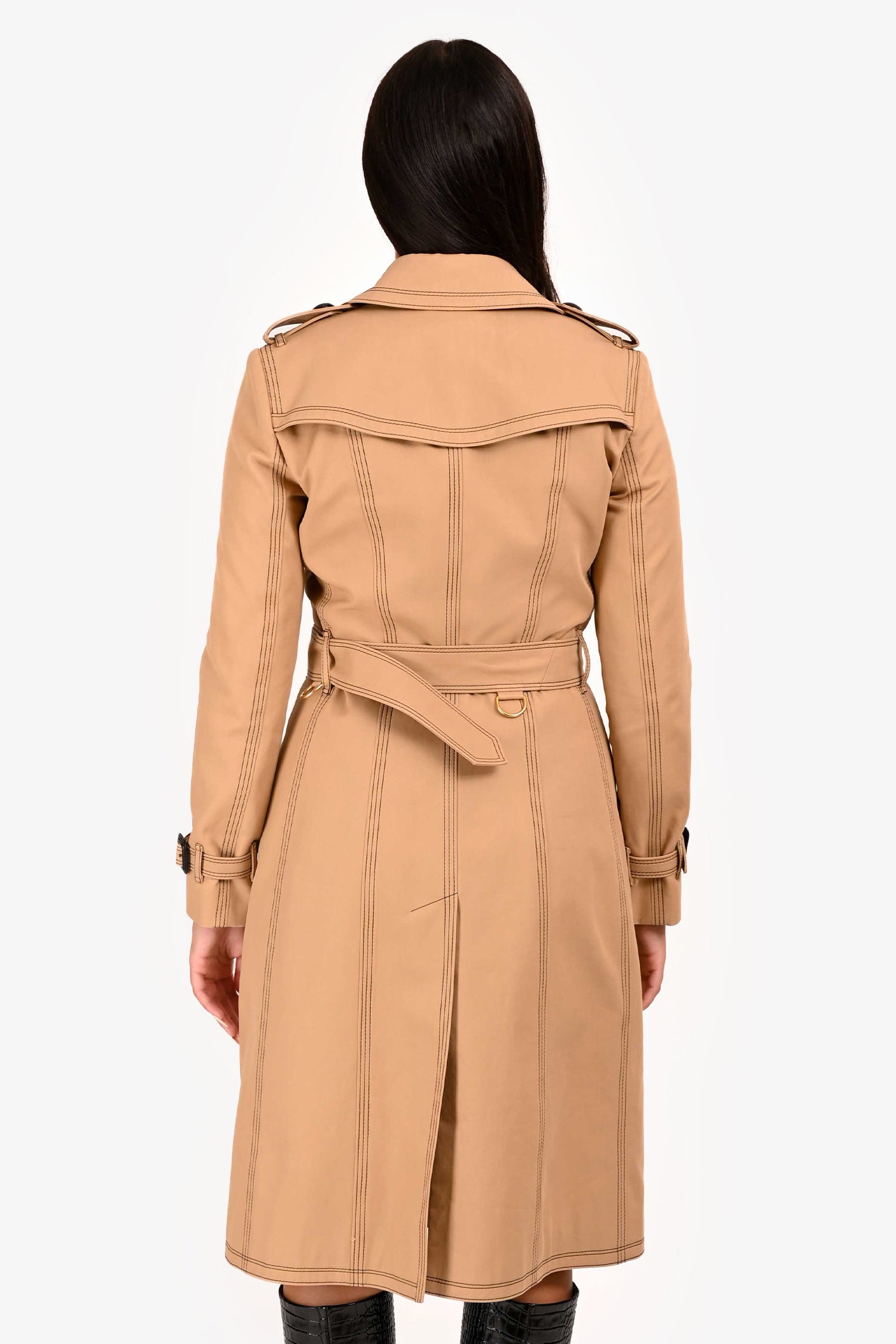 Refresh availabilityBurberry London Brown Utility Belted Trench Coat. Double-breasted front button closure. Two front pockets with button closure. Detachable belt. Classic collar with interior chain detail and clasp detail. Gold-tone hardware. Black lining. Upper back yolk detail. Contrast stitching.