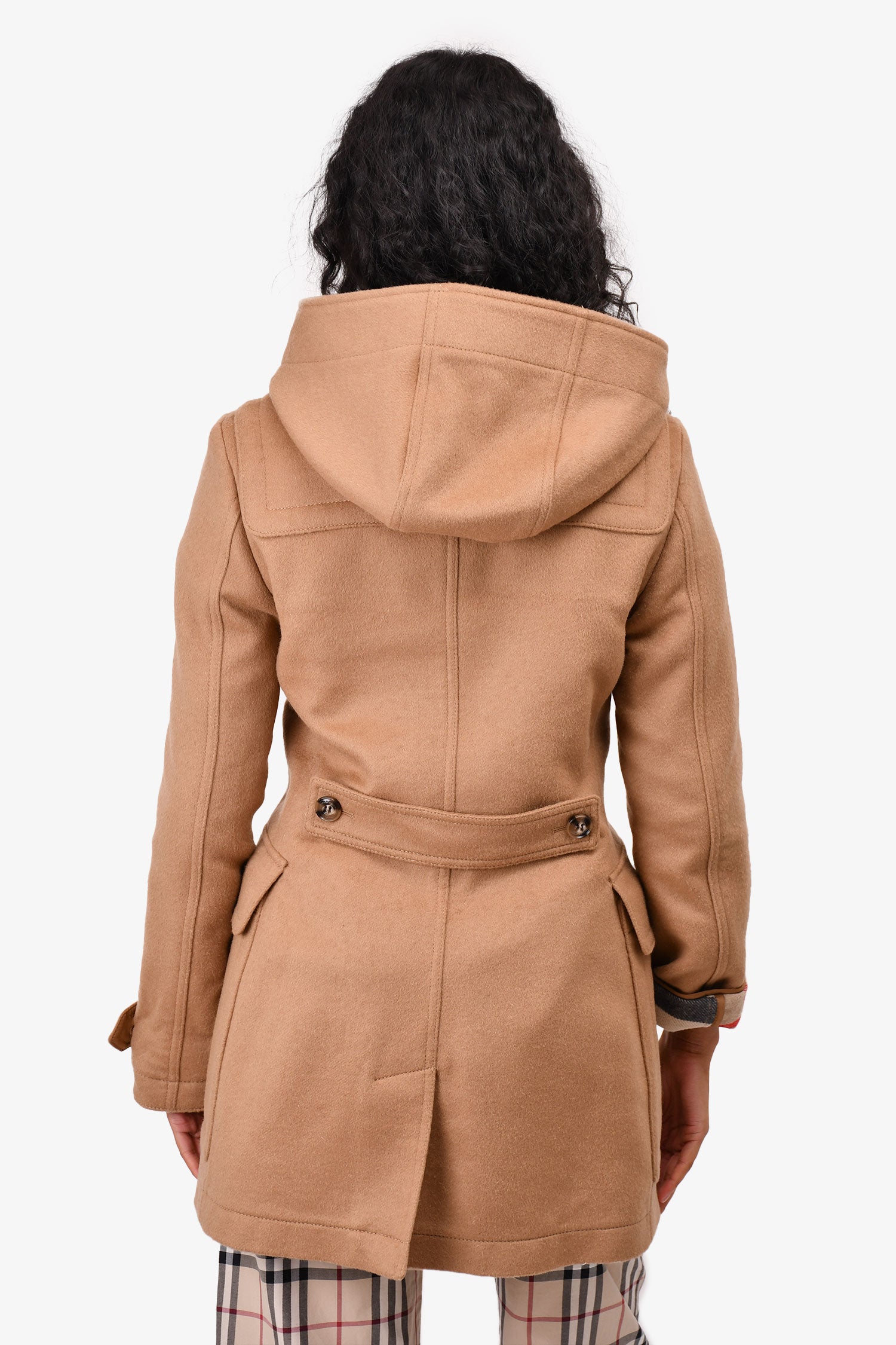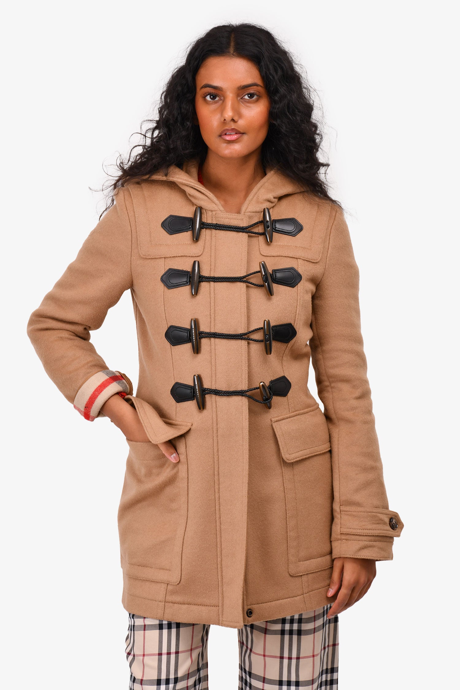 Refresh availabilityBurberry London Brown Wool Hooded Peacoat with Toggle Closure. Front pockets. Signature nova check interior graphic. Front zip closure.