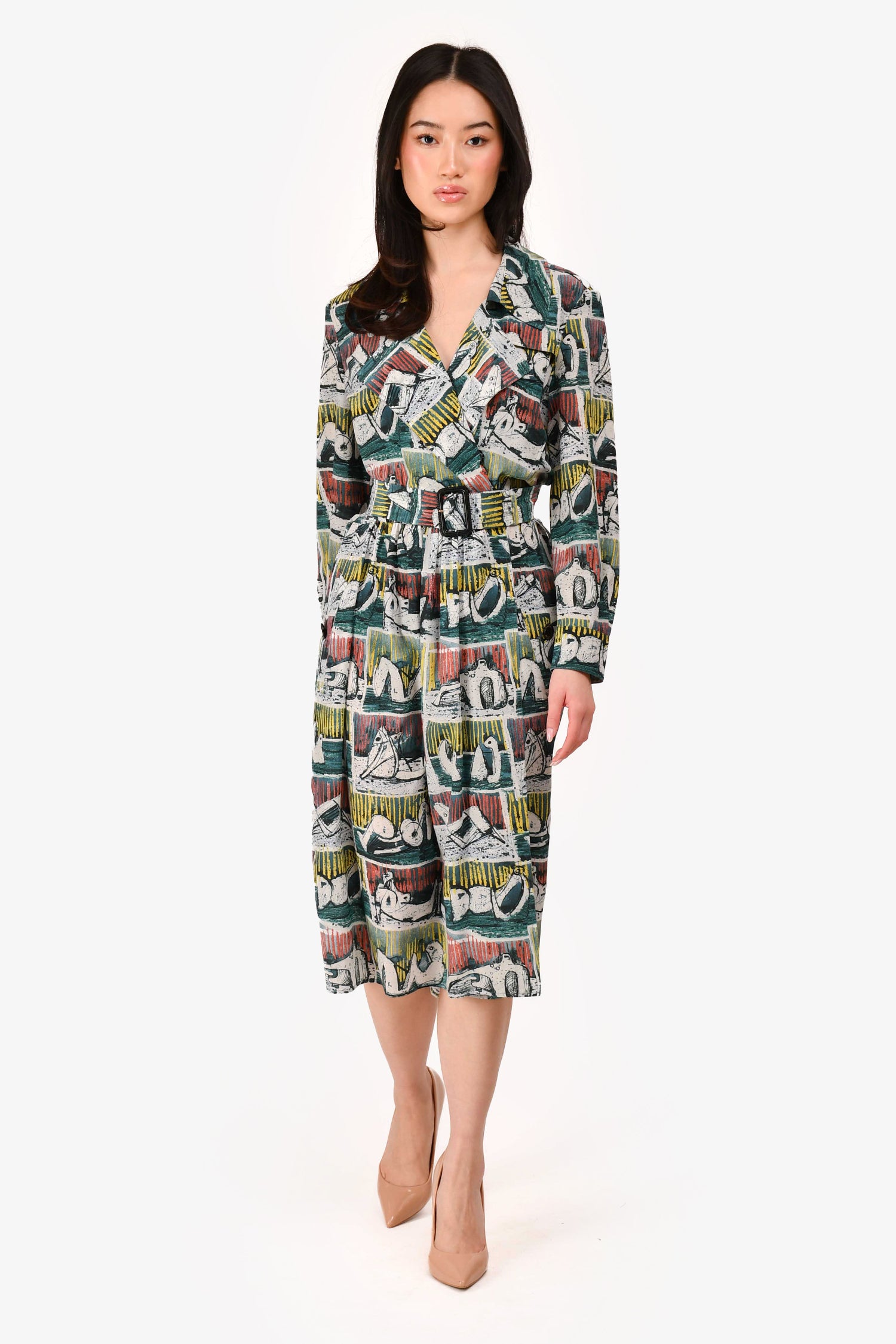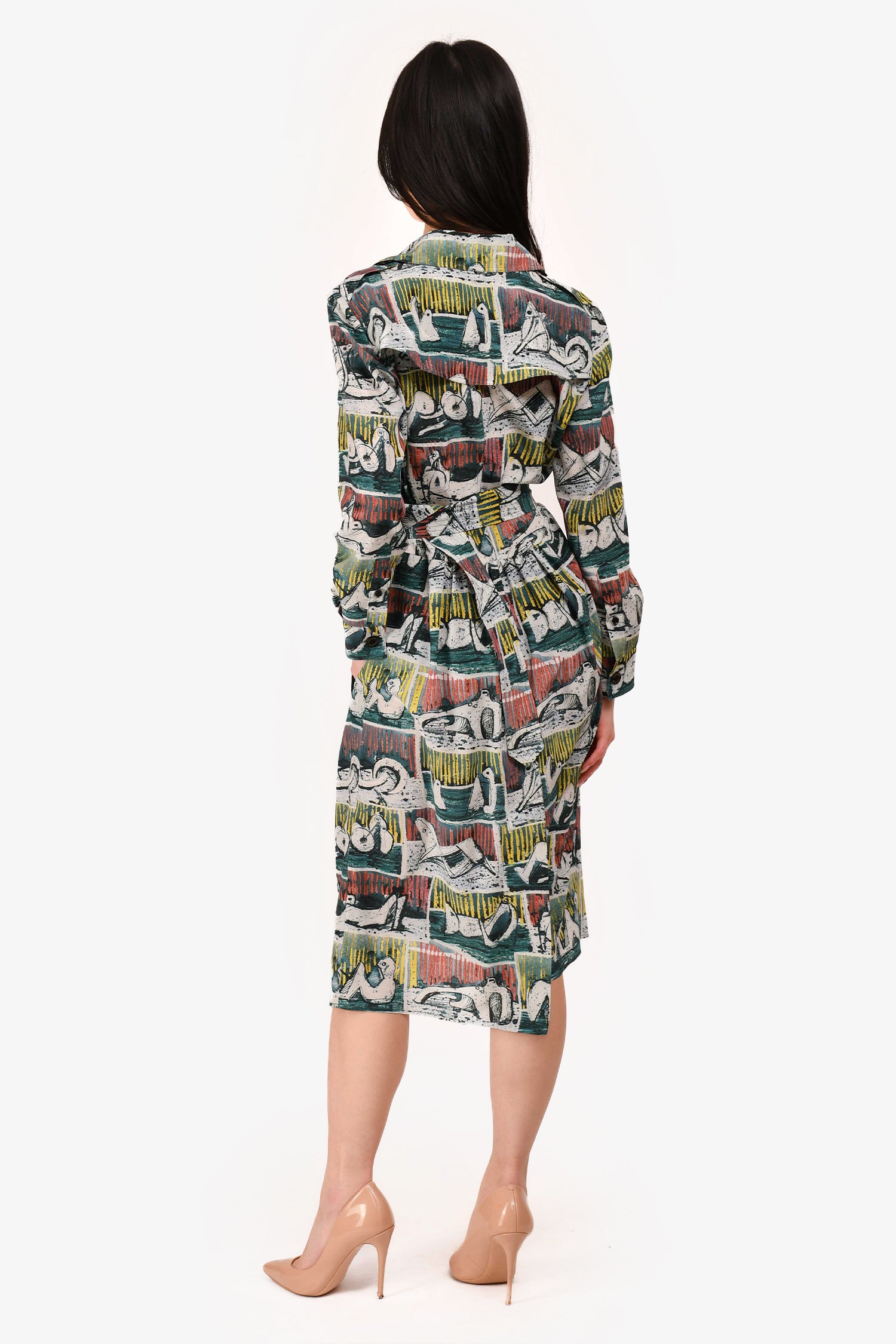 Refresh availabilityBurberry London Green Multicolour Painting Silk Midi Dress. V-neckline with notched lapel. Front snap-on button closure. Adjustable pull-through belt at waist. Two front pockets. Cuffed at the sleeves. Tonal stitching.