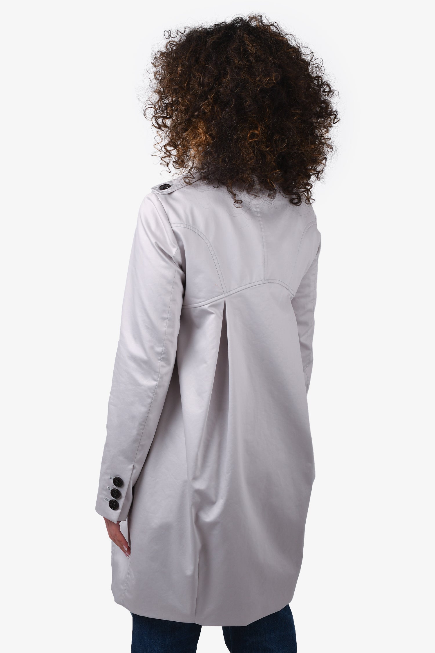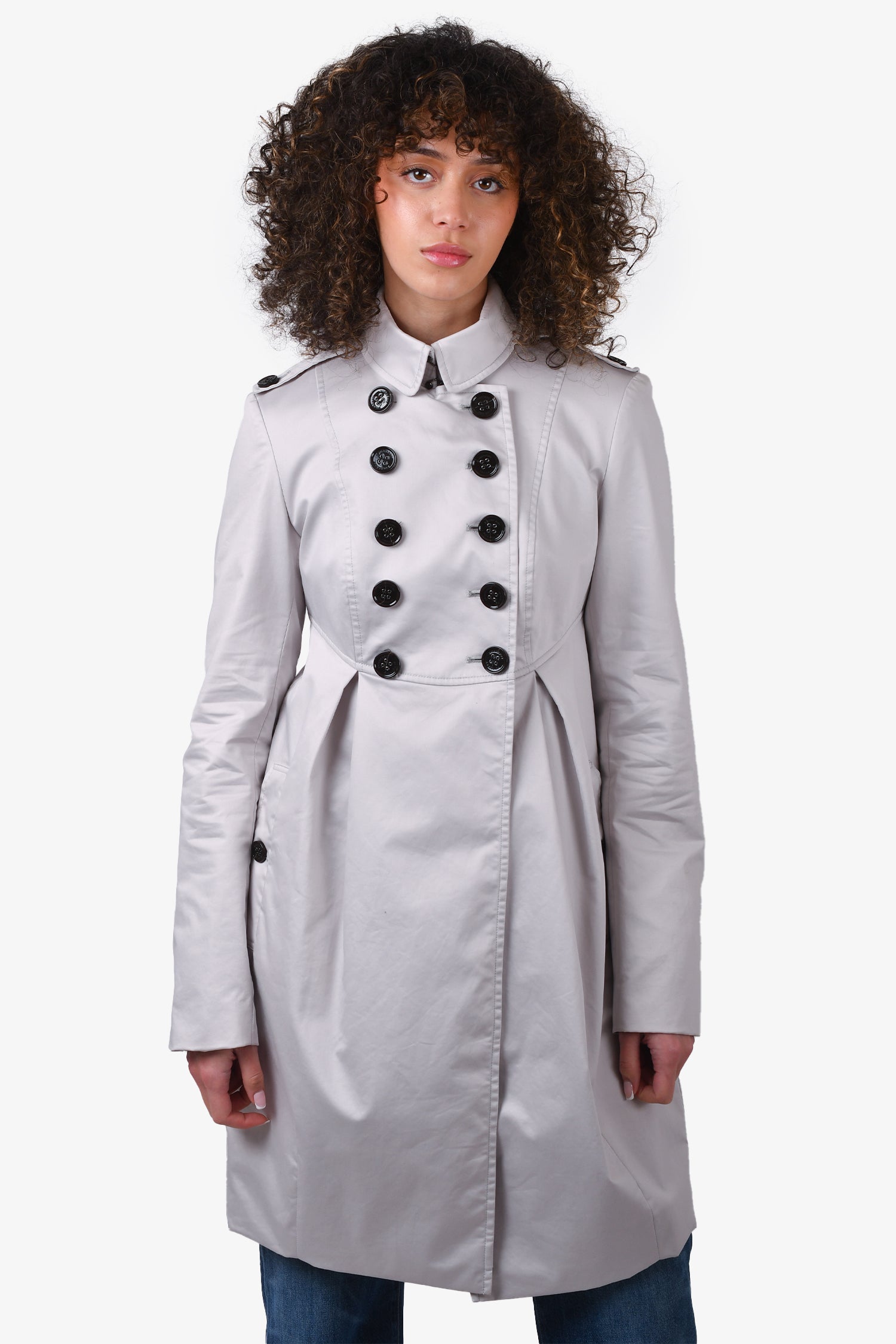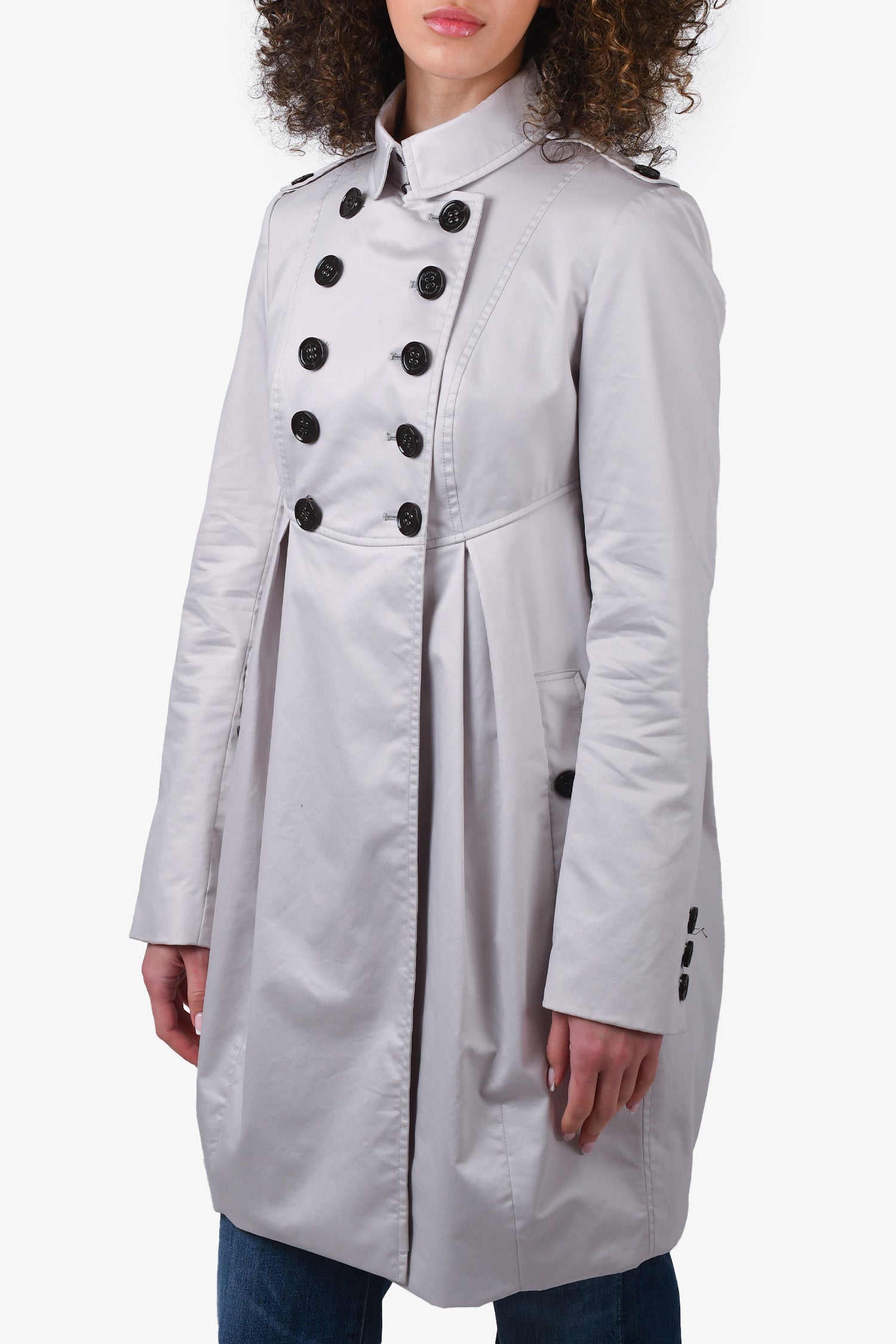 Refresh availabilityBurberry London Grey Pleated Trench Coat. Lined. 2 front pockets with button closure. Tonal stitching.