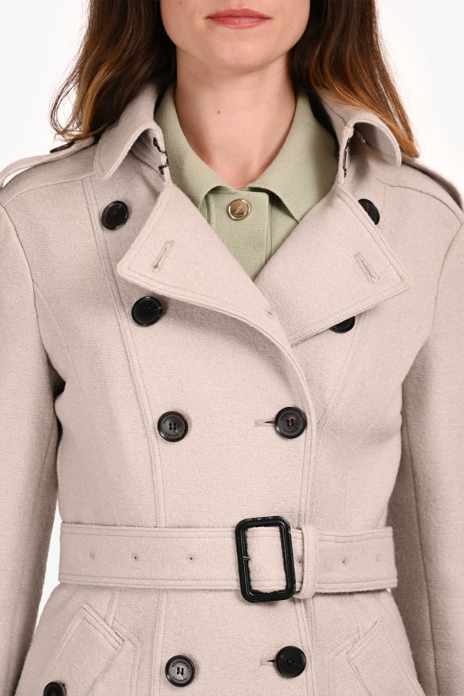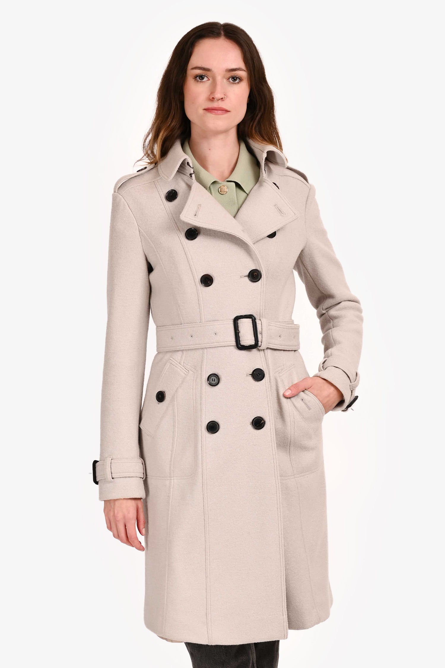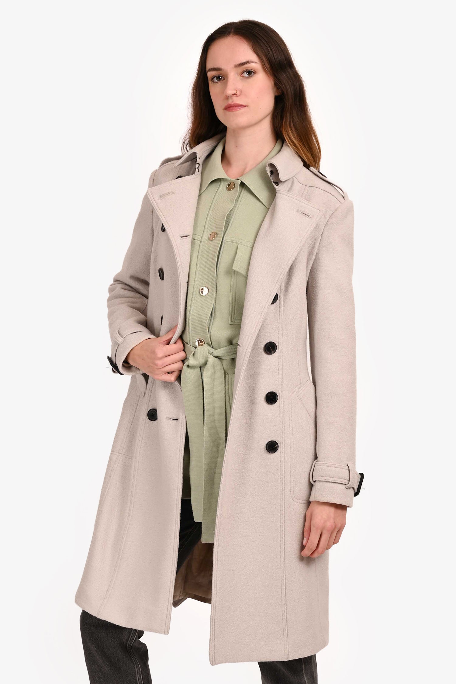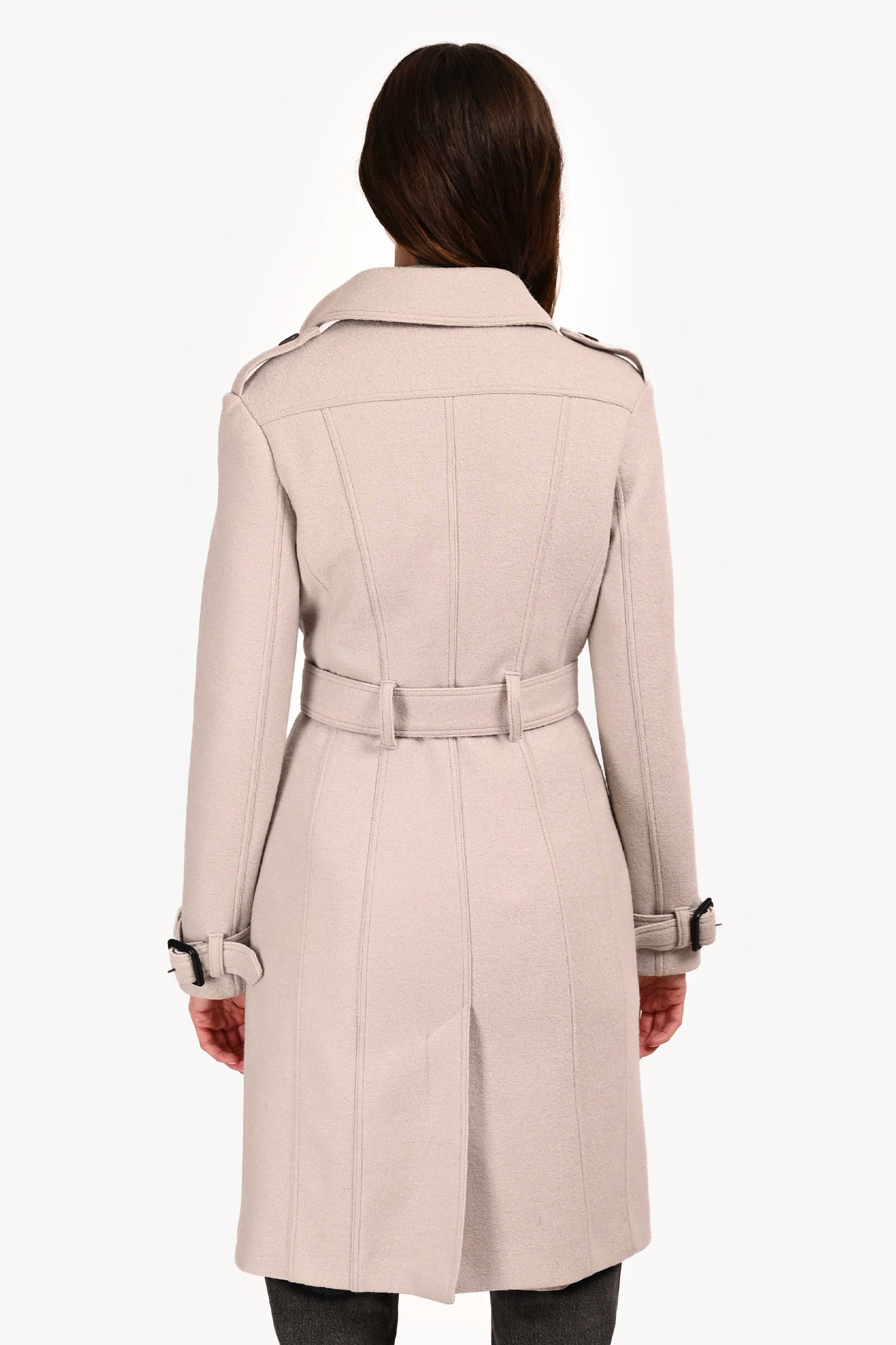 Refresh availabilityBurberry London Grey Wool Double Breasted Long Coat. Pull-on. Front button-up closure. 2 front slip pockets with button closure. Strap with buckle closure at sleeve cuffs. Removable and adjustable belt at waistline. Tonal stitching.