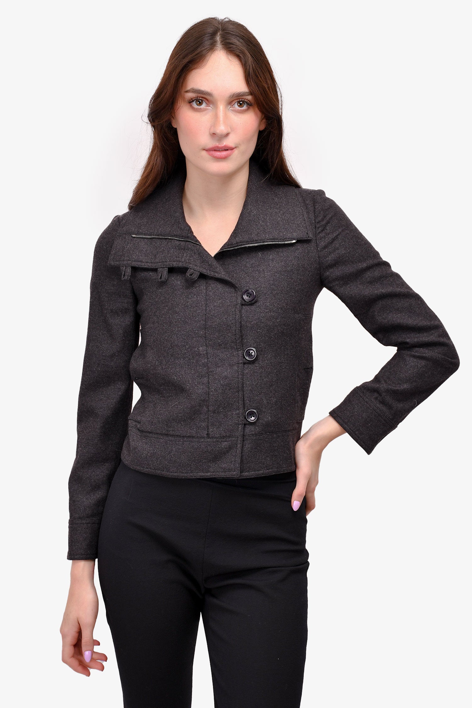 Refresh availabilityBurberry London Grey Wool Jacket. Tonal stitching. Lined interior. Hook and button fastening. Zipped closure.
