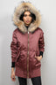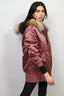 Burberry London Muted Red Satin Longline Bomber Jacket with Fur Trim Hood Size XS
