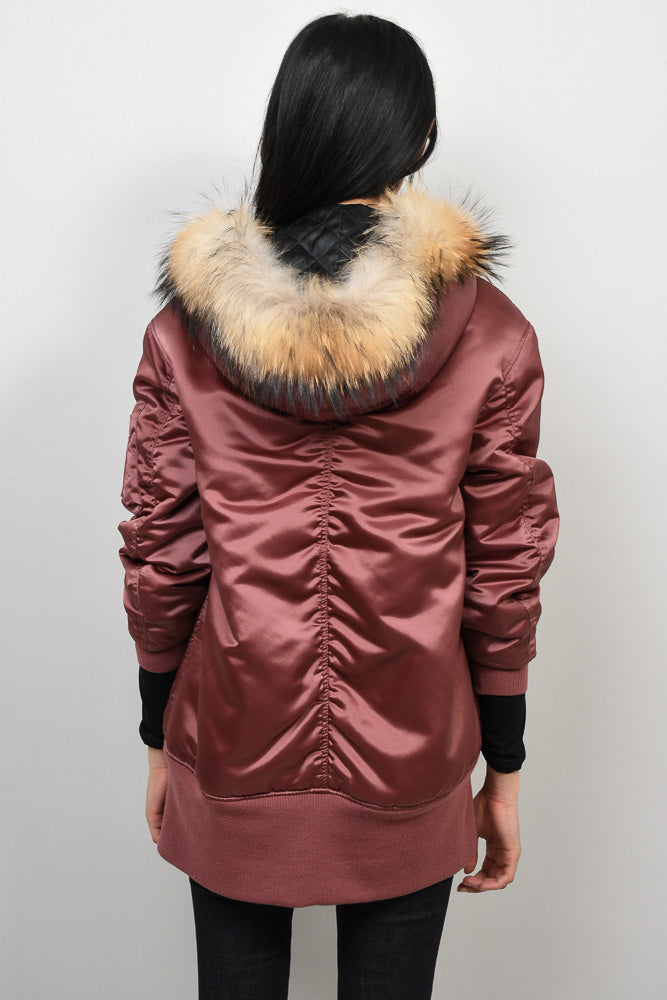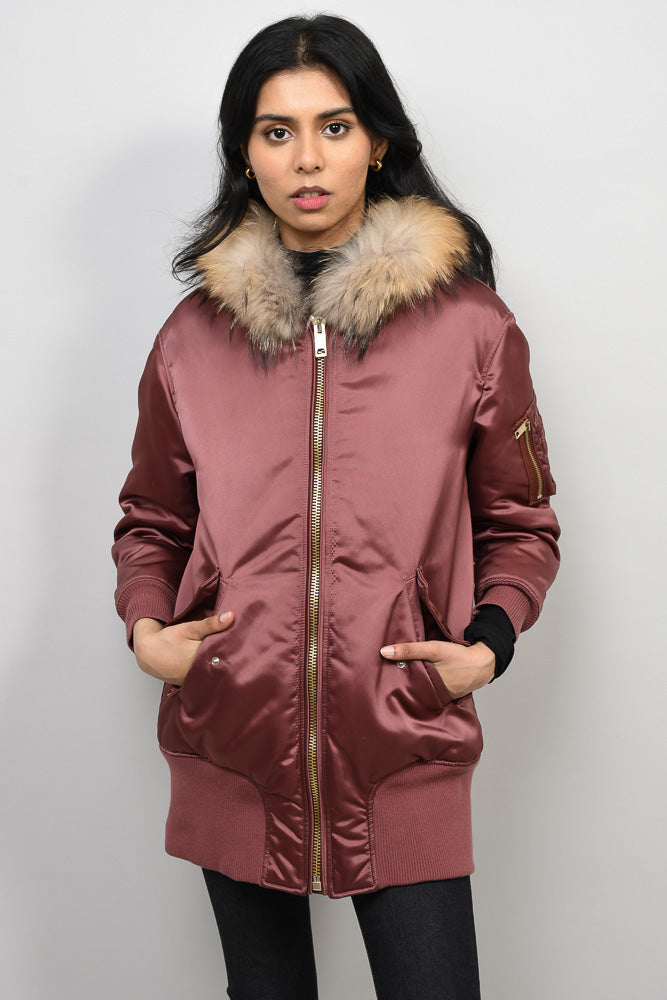 Refresh availabilityBurberry London Muted Red Satin Longline Bomber Jacket with Fur Trim Hood. Tonal top stitching. Front flap pcokets. Front zip closure. Ribbed hemline. Sleeve pocket detail. Lined. Ribbed cuffs