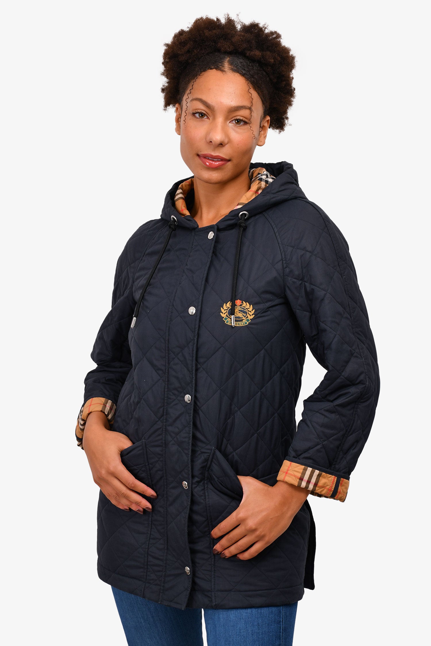 Burberry Navy Quilted Nova Check Detailed Hooded Short Coat Size XS