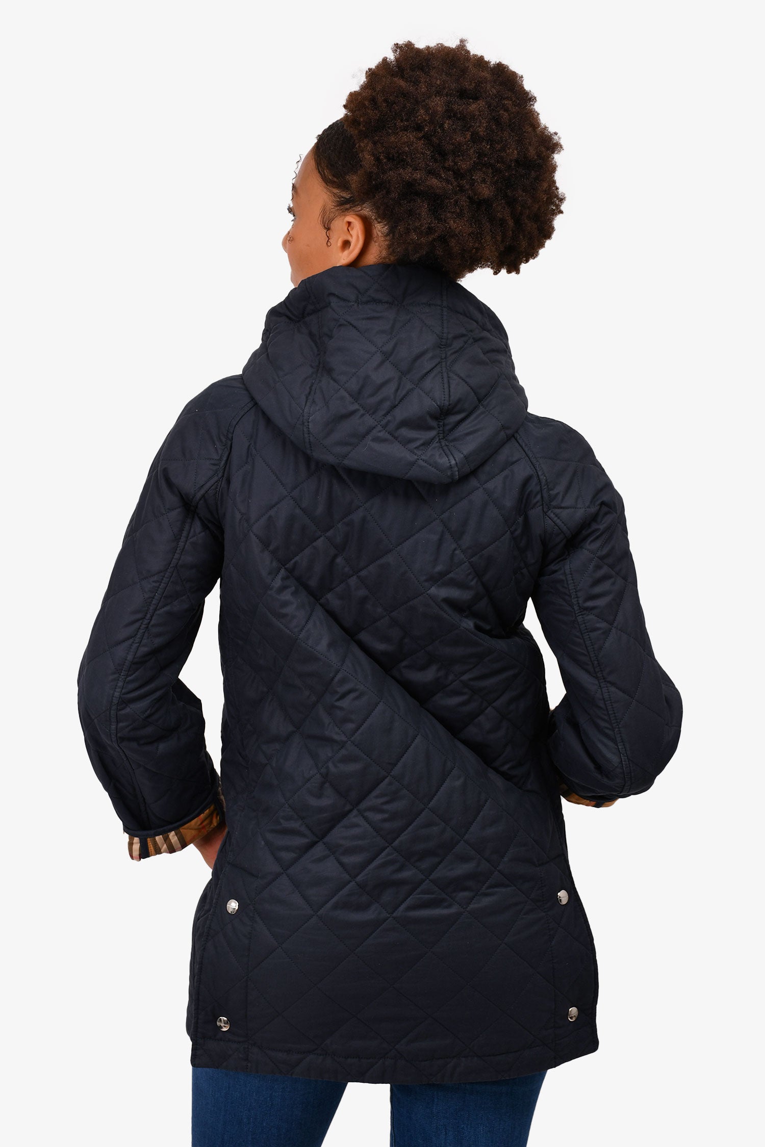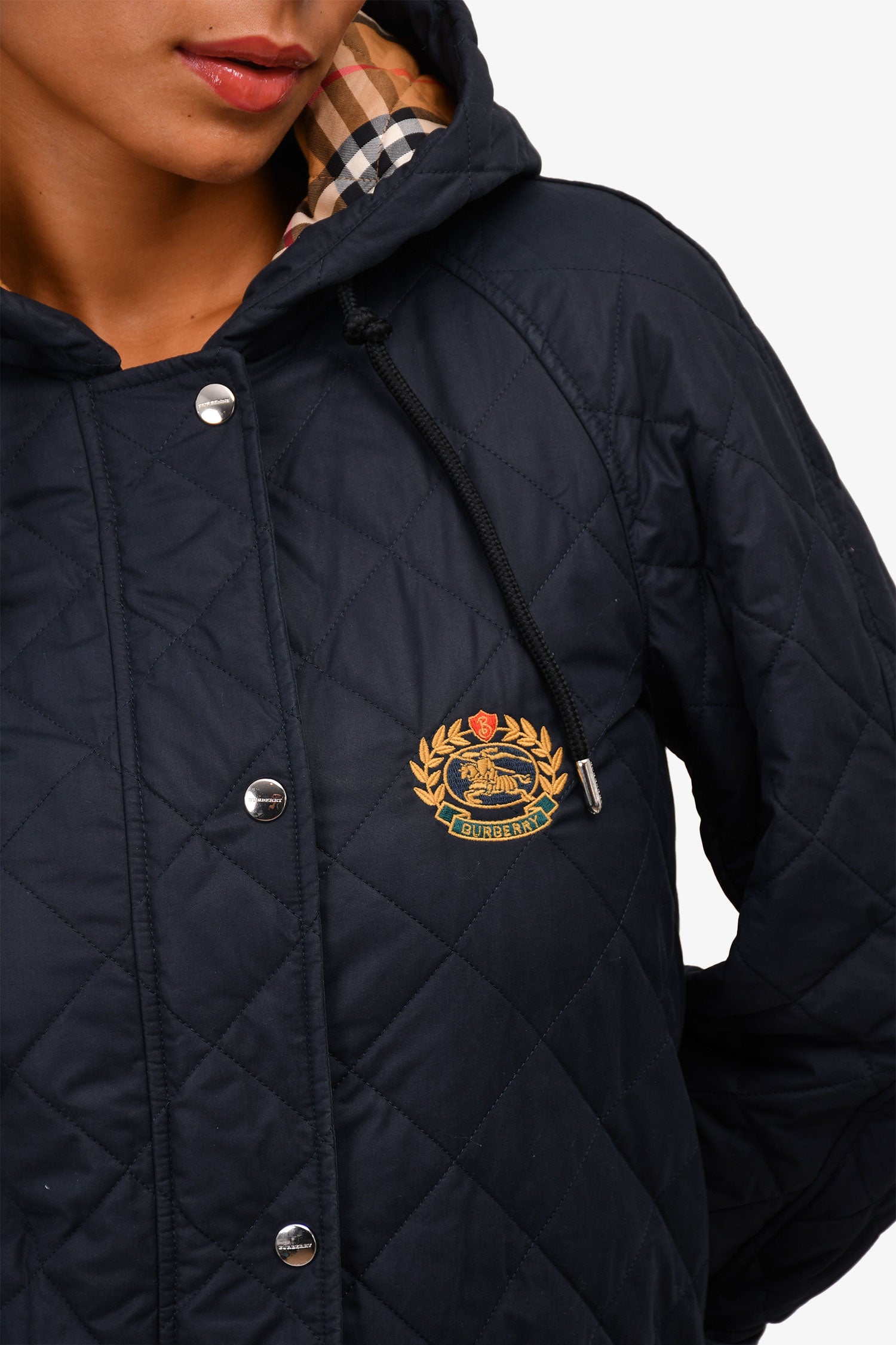 Refresh availabilityBurberry Navy Quilted Nova Check Detailed Hooded Short Coat. Front zip and snap-button closures.