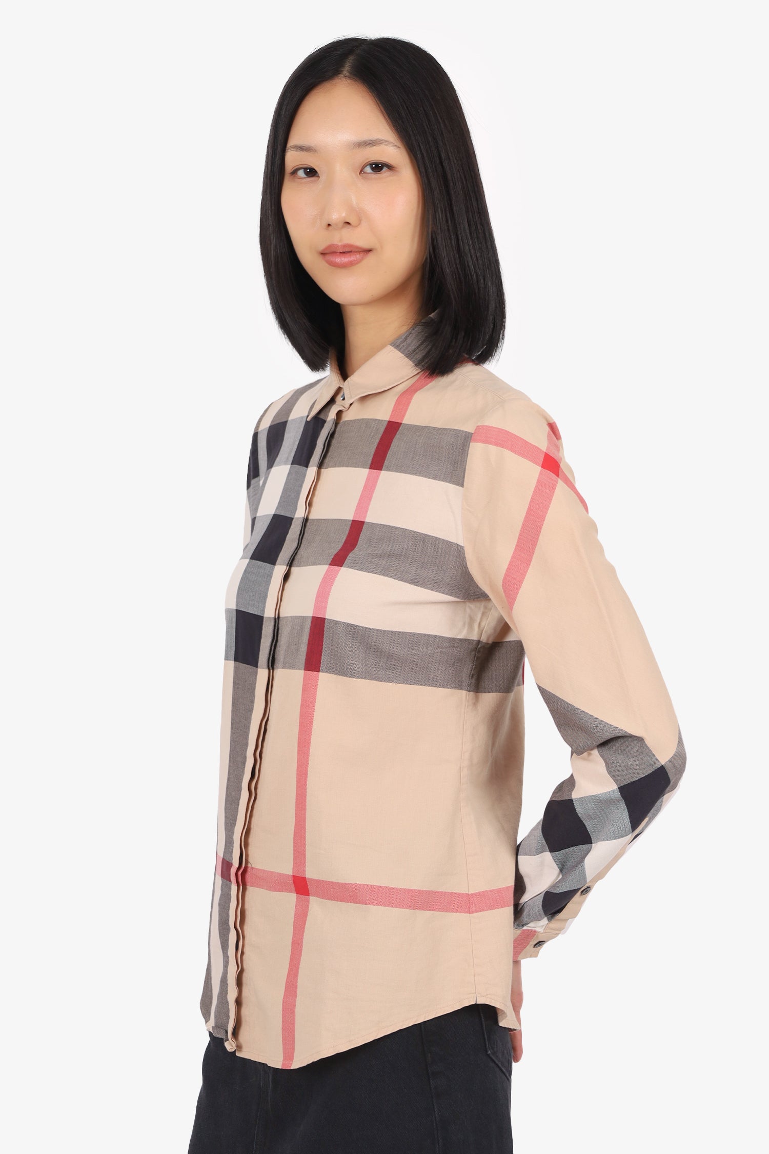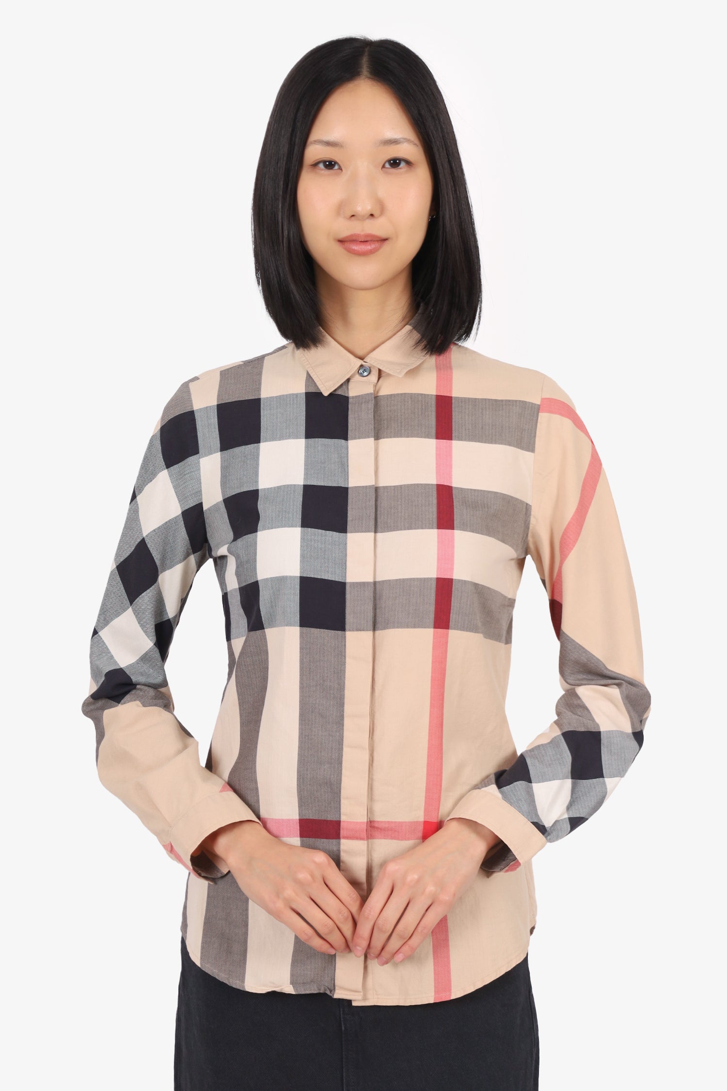 Refresh availabilityBurberry Nova Check Shirt. Pull-on. Collared neckline. Front button-up closure. Sleeve cuffs with button-up closure. Tonal stitching.