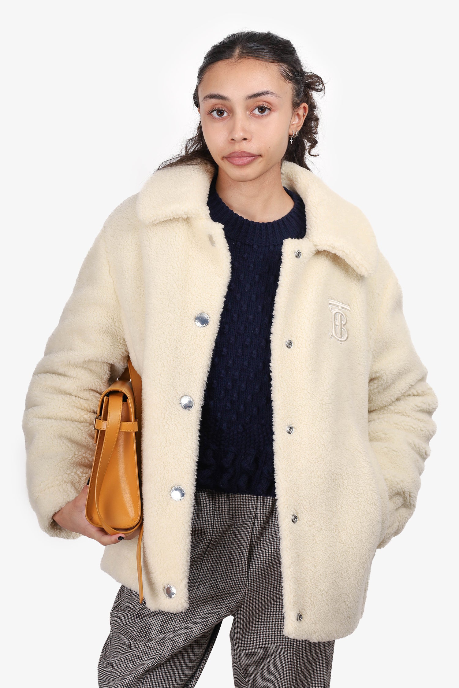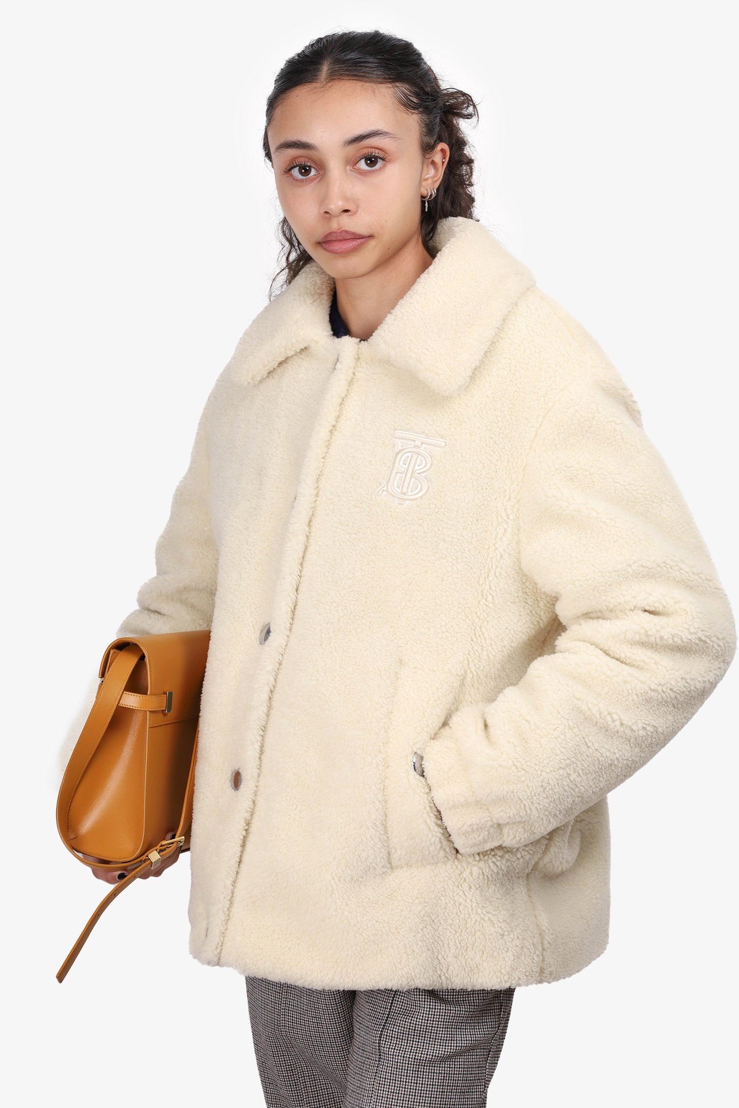 Refresh availabilityBurberry Off-White Wool Fleece Wishaw Jacket. Front snap button closure. Front pockets with snap button closure. Tonal stitching.