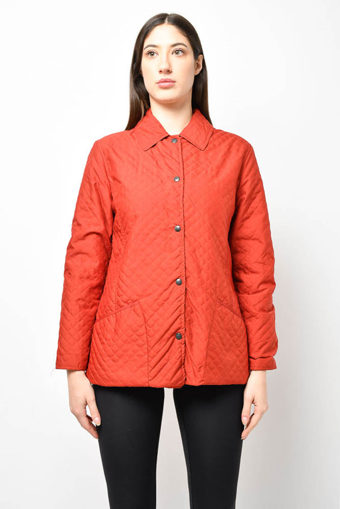 Refresh availabilityBurberry Orange Nylon Quilted Long Sleeve Button Jacket. Pointed collar. Front snap button closure. Check interior lining. 2 exterior slip pockets. Tonal stitching.