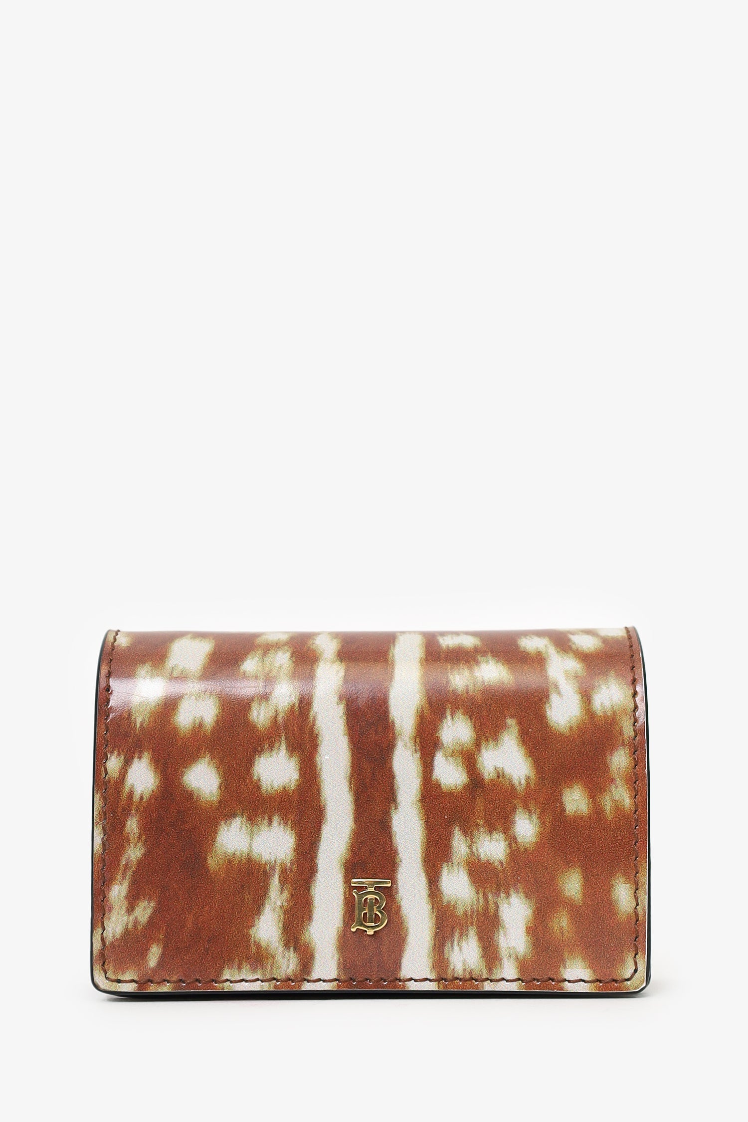 Refresh availabilityBurberry Patent Leather Deer Print Wallet On Chain. 2 front fold-over flaps with snap-button closure. 3 slip pockets under first flap. Single compartment under second flap with snap-button closure. Removable chainlink with lobster clasp closure. Gold-tone hardware. Tonal stitching.
