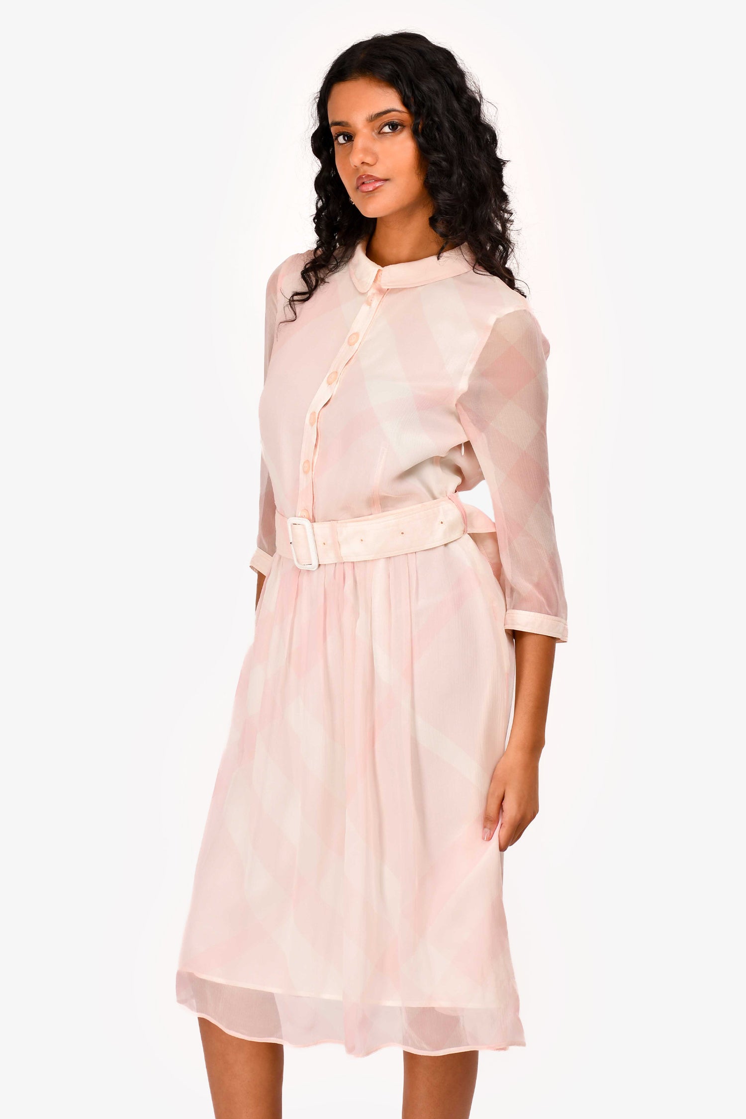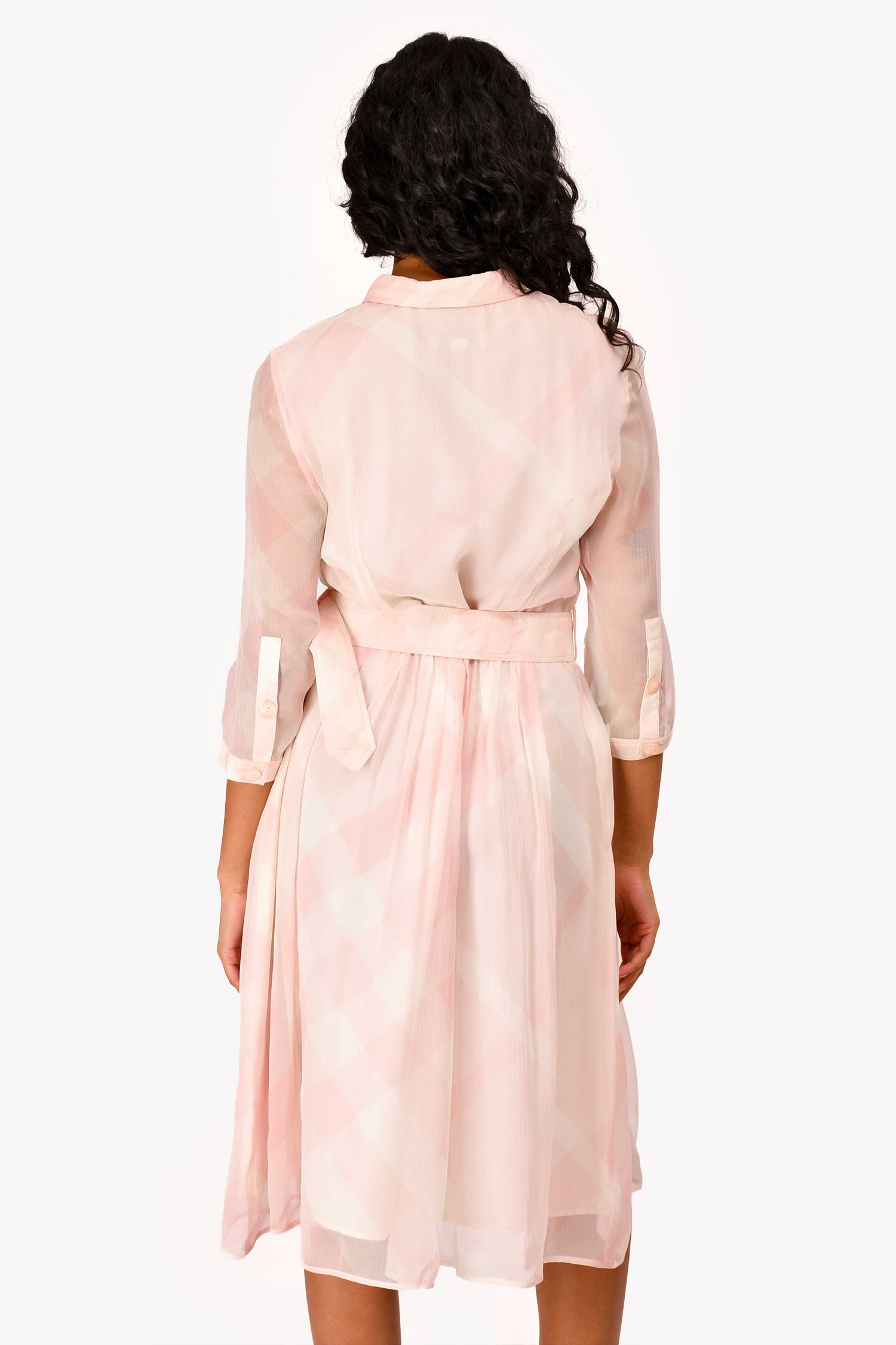 Refresh availabilityBurberry Pink Check Silk Belted Midi Dress. Front button down closure. Button closure at cuffs. Lined. Tonal stitching.