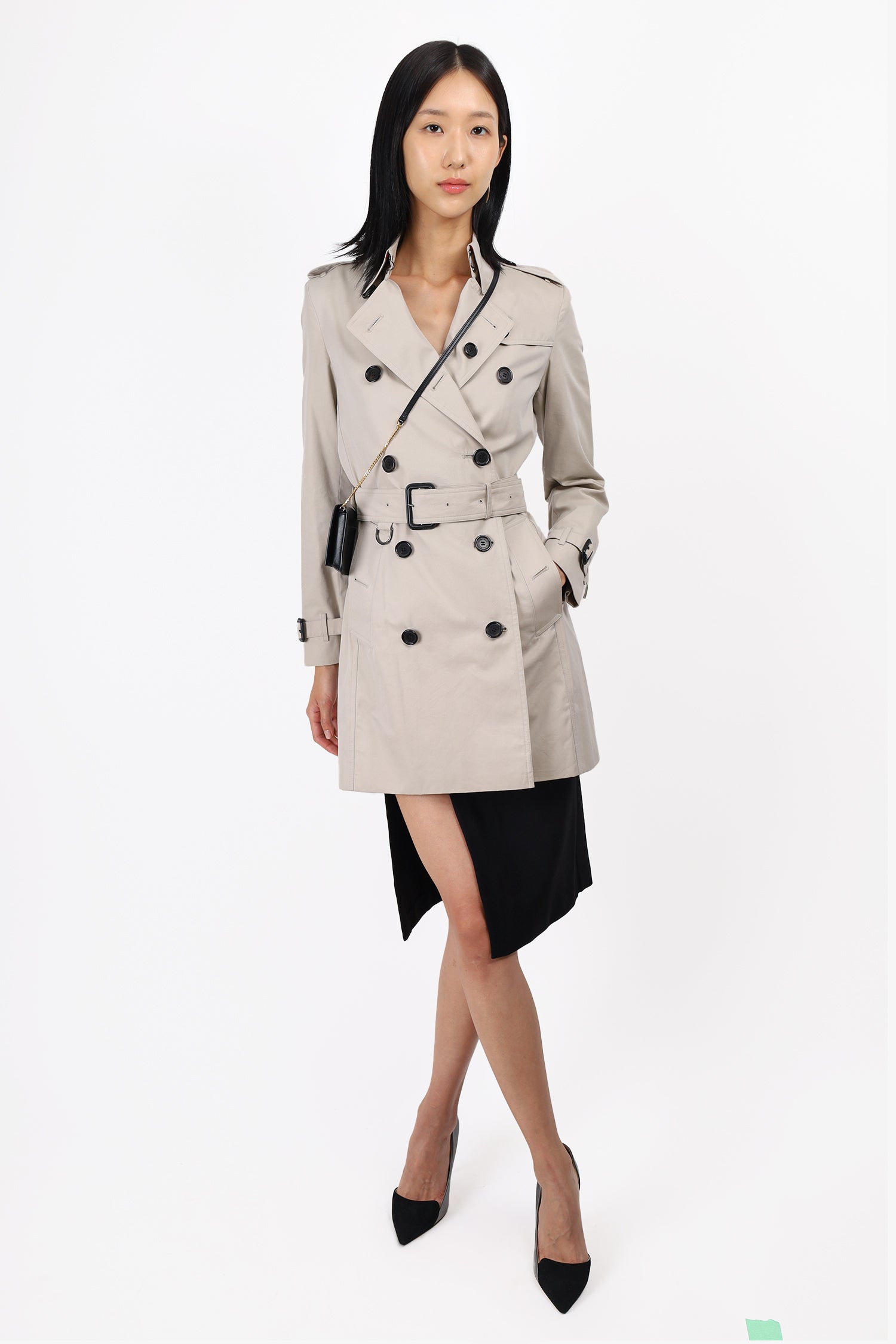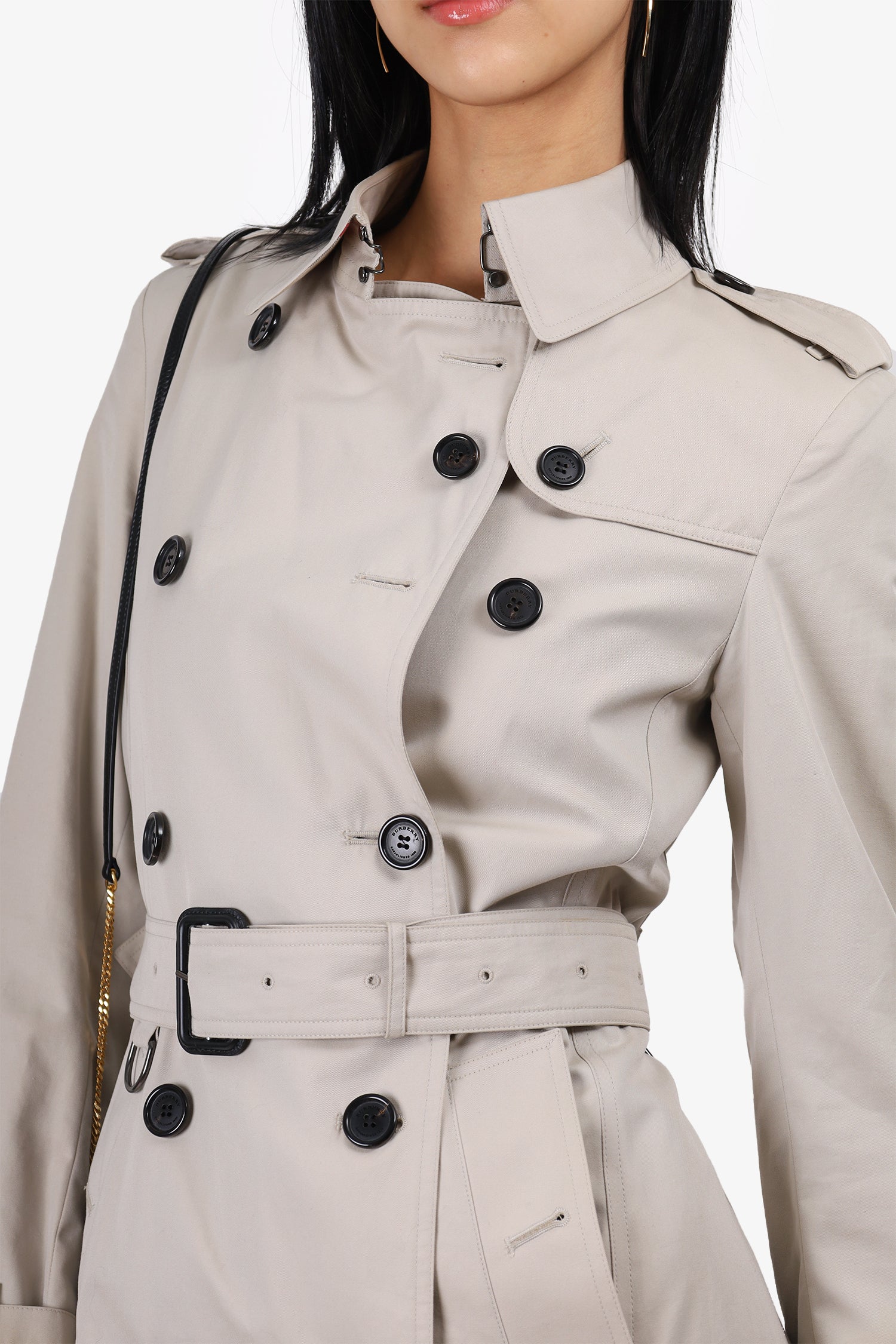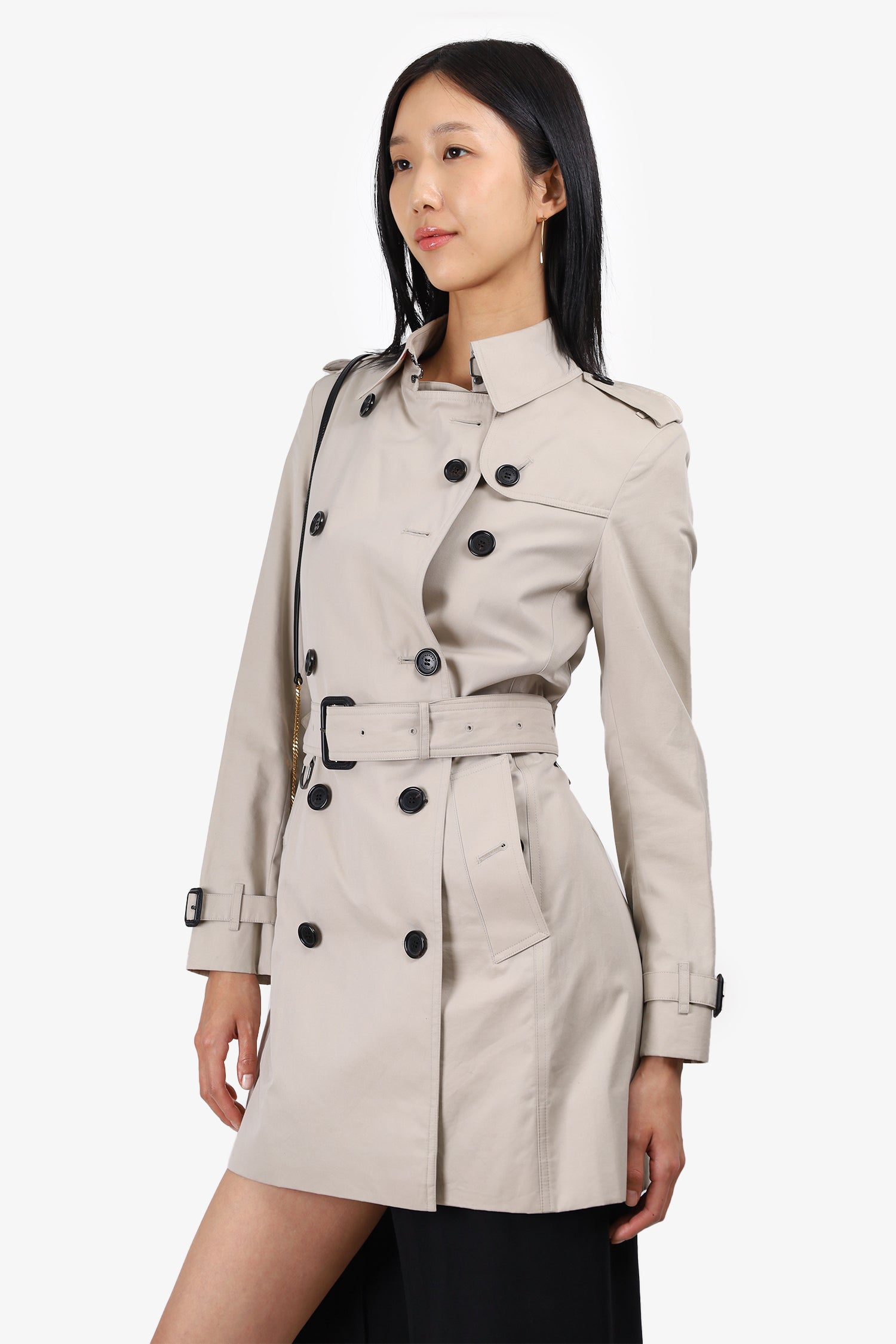 Refresh availabilityBurberry Prorsum Beige Belted Trench Coat. Front double breasted button-up closure with neck hook closure. Collared neckline. 2 front pockets with button-up closure. Adjustable pull-through buckle belt on sleeve cuffs and around waist. Lined. Tonal stitching.