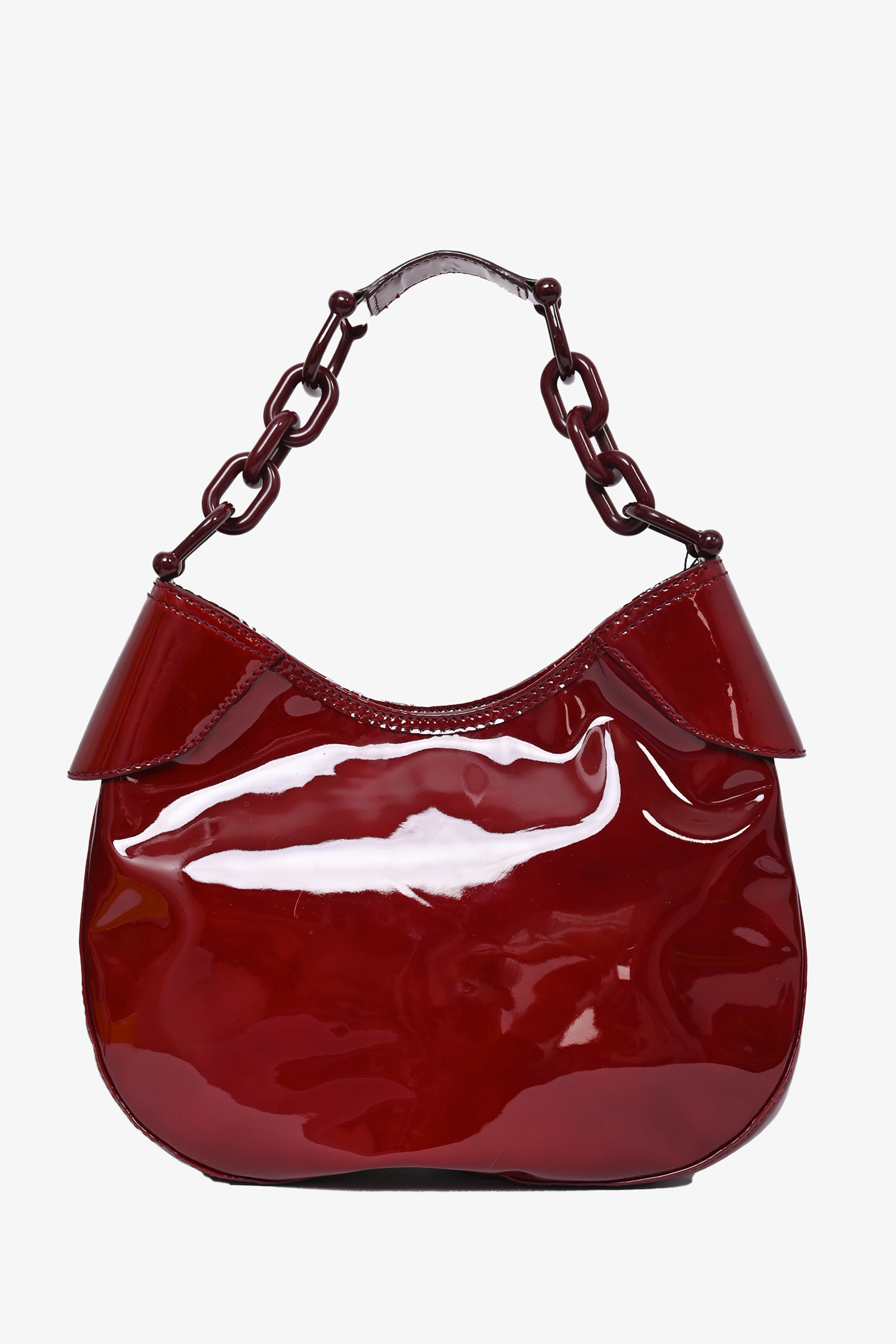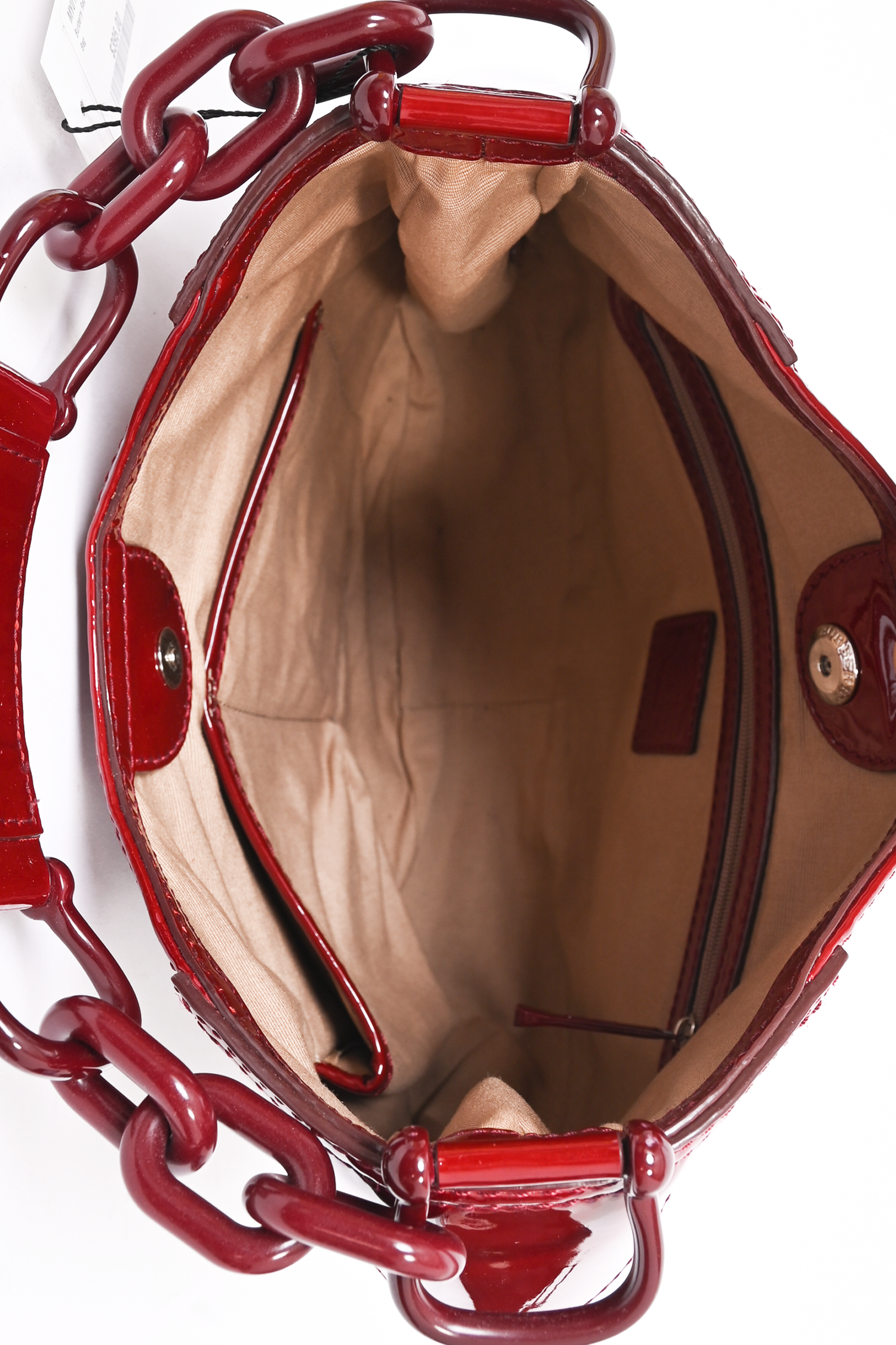 Refresh availabilityBurberry Red Patent Leather Shoulder Bag. 2 interior slip pockets. 1 interior zip pocket. Tonal stitching.