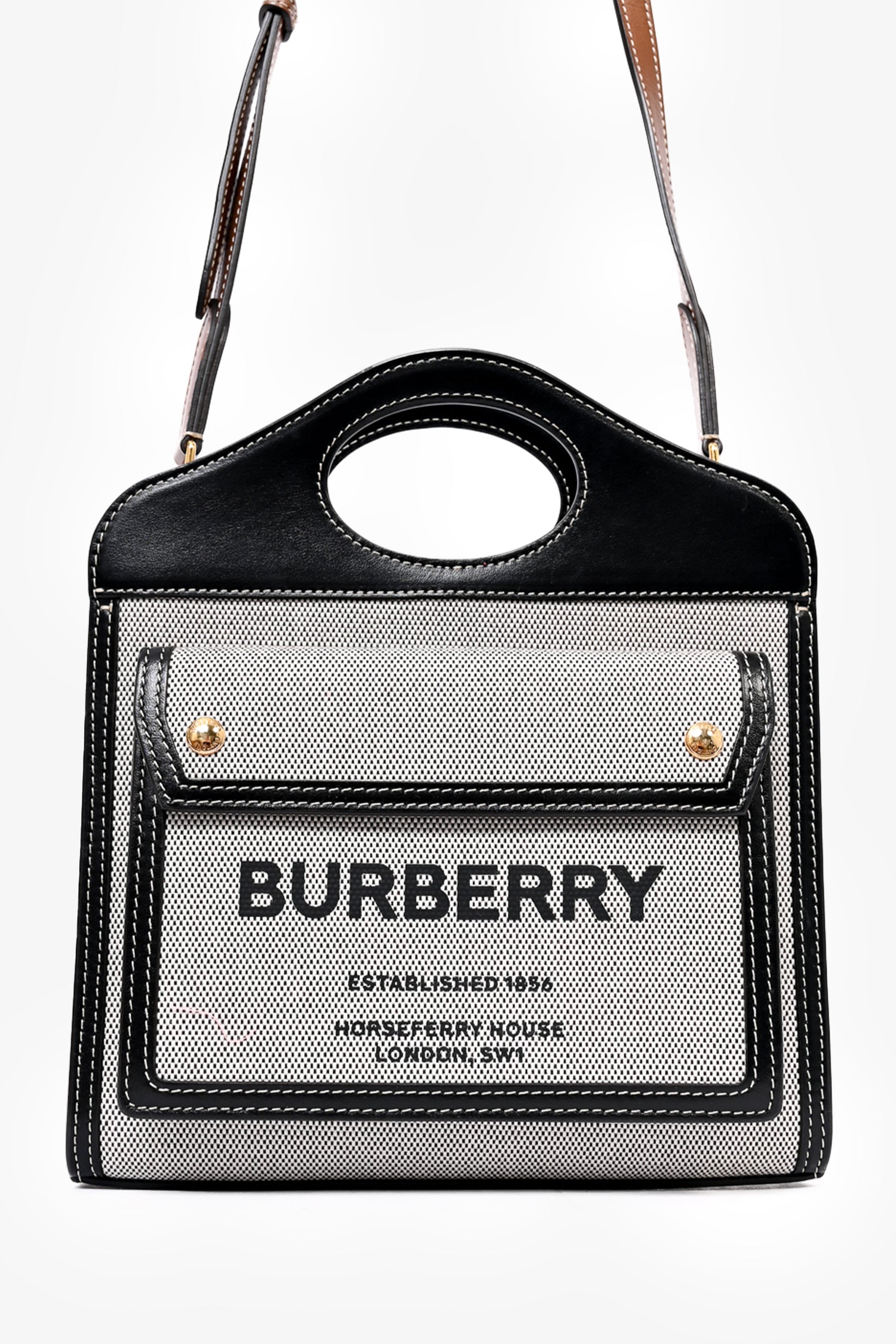 Refresh availabilityBurberry Two-Tone Canvas/Leather Mini Pocket Bag. Front pocket with fold-over flap and magnetic button closure. Open top. Beige textile interior lining. Single interior wall zip pocket. Removable and adjustable strap. Gold-tone hardware.