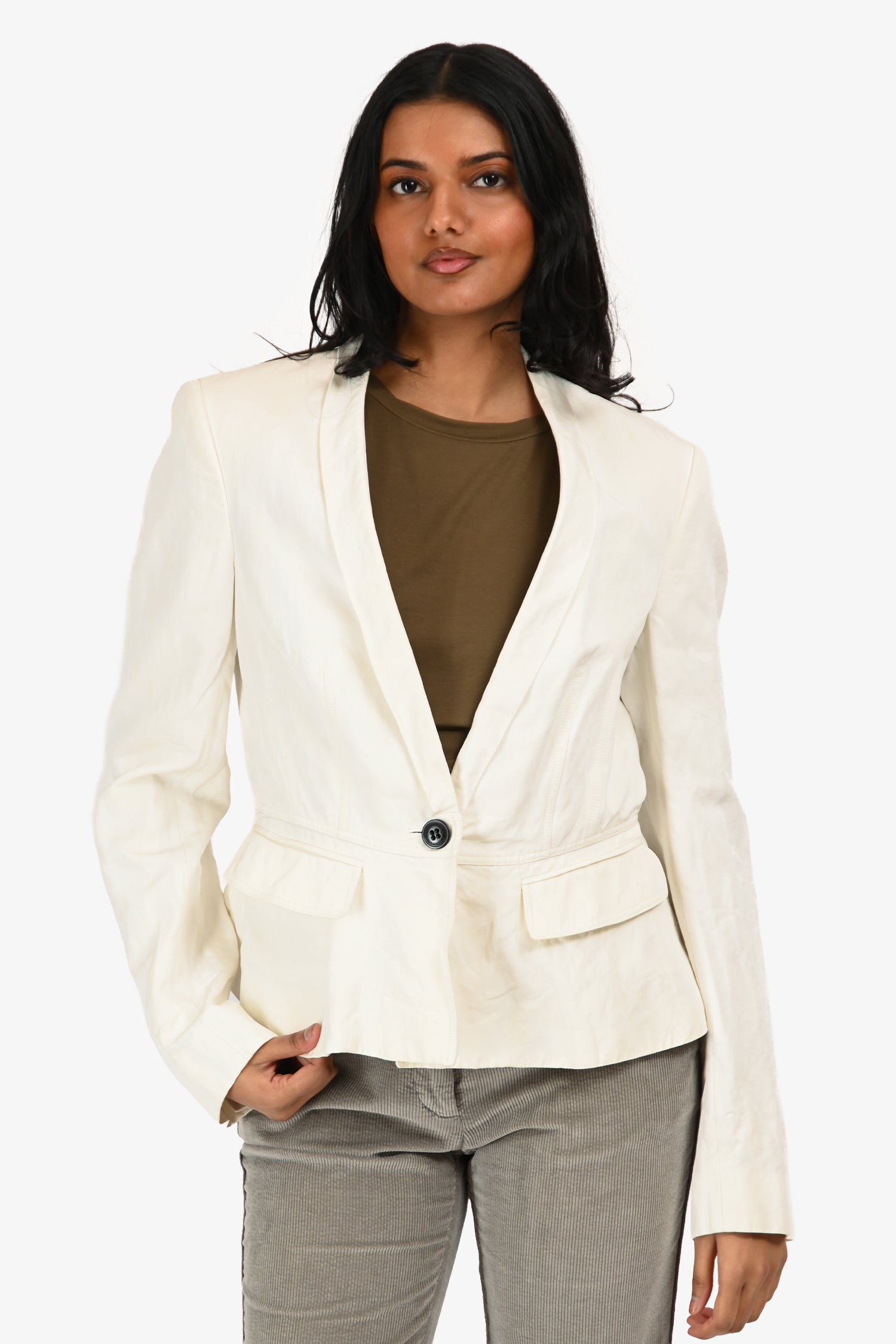 Refresh availabilityBurberry White Cotton Blend Single-Button Blazer. Slip-on. Shawl lapel. Single-button front closure. Padded shoulders. Interior chain detail at the neckline. Cuffs with button-up closures. 2 exterior flap pockets. Fully lined interior. Tonal stitching.
