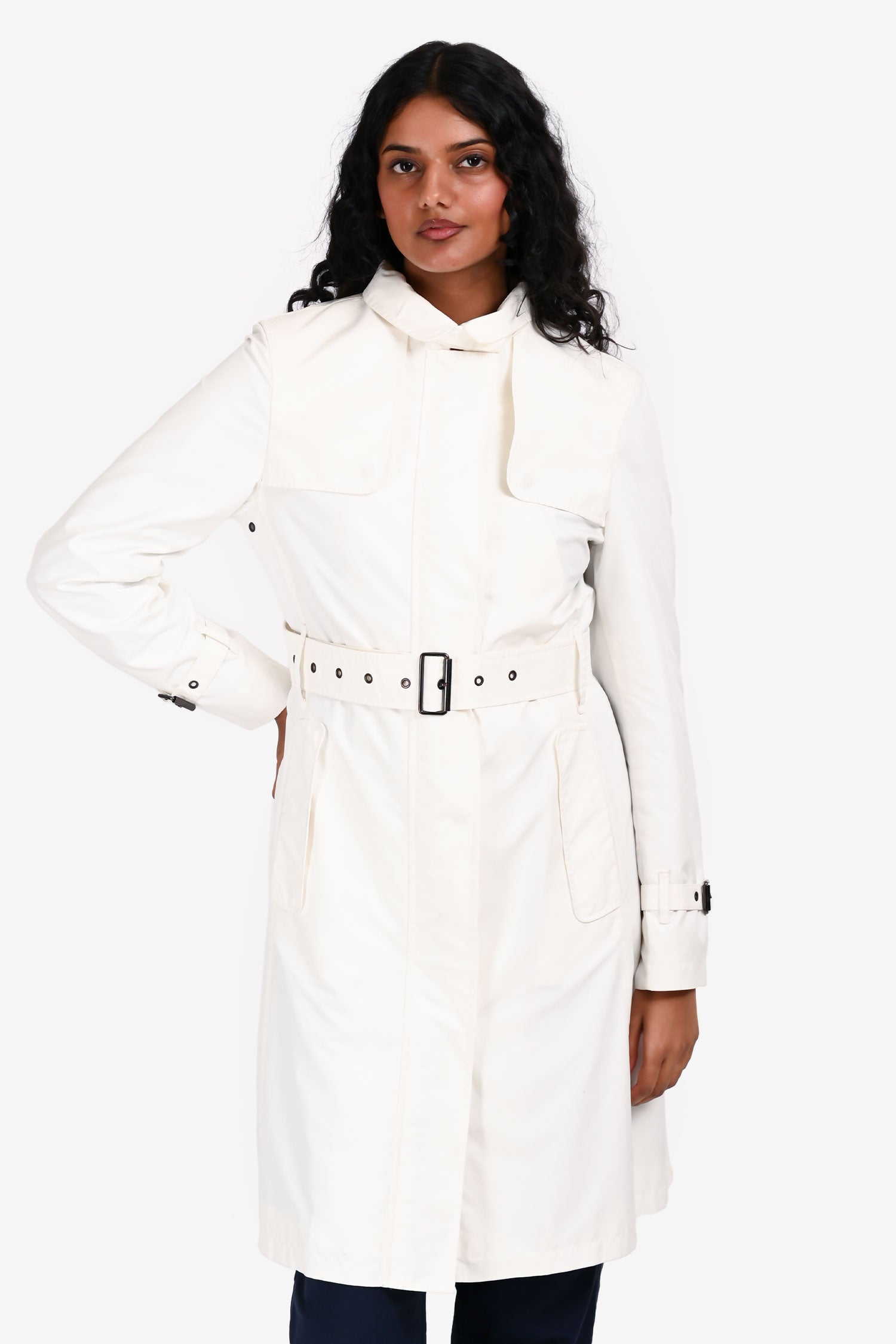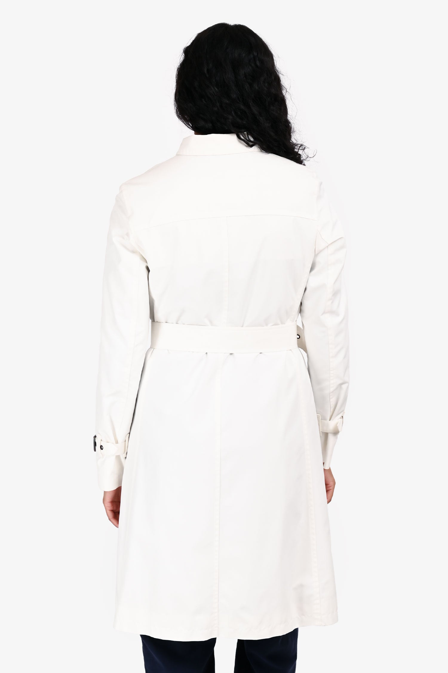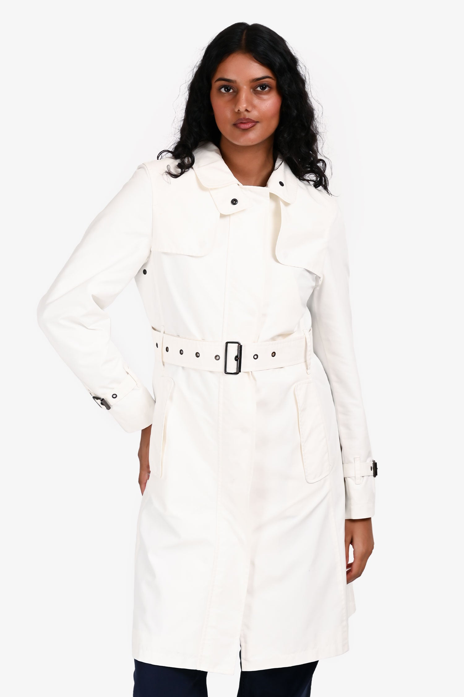 Refresh availabilityBurberry White Mid Length Rain Coat. Pull-on. Collared neckline. Front zip with snap button closure. 2 front pockets. Sleeve cuffs with strap and buckle closure. Removable waistband strap with adjustable buckle closure. Lined interior. Silver-tone hardware. Tonal stitching.