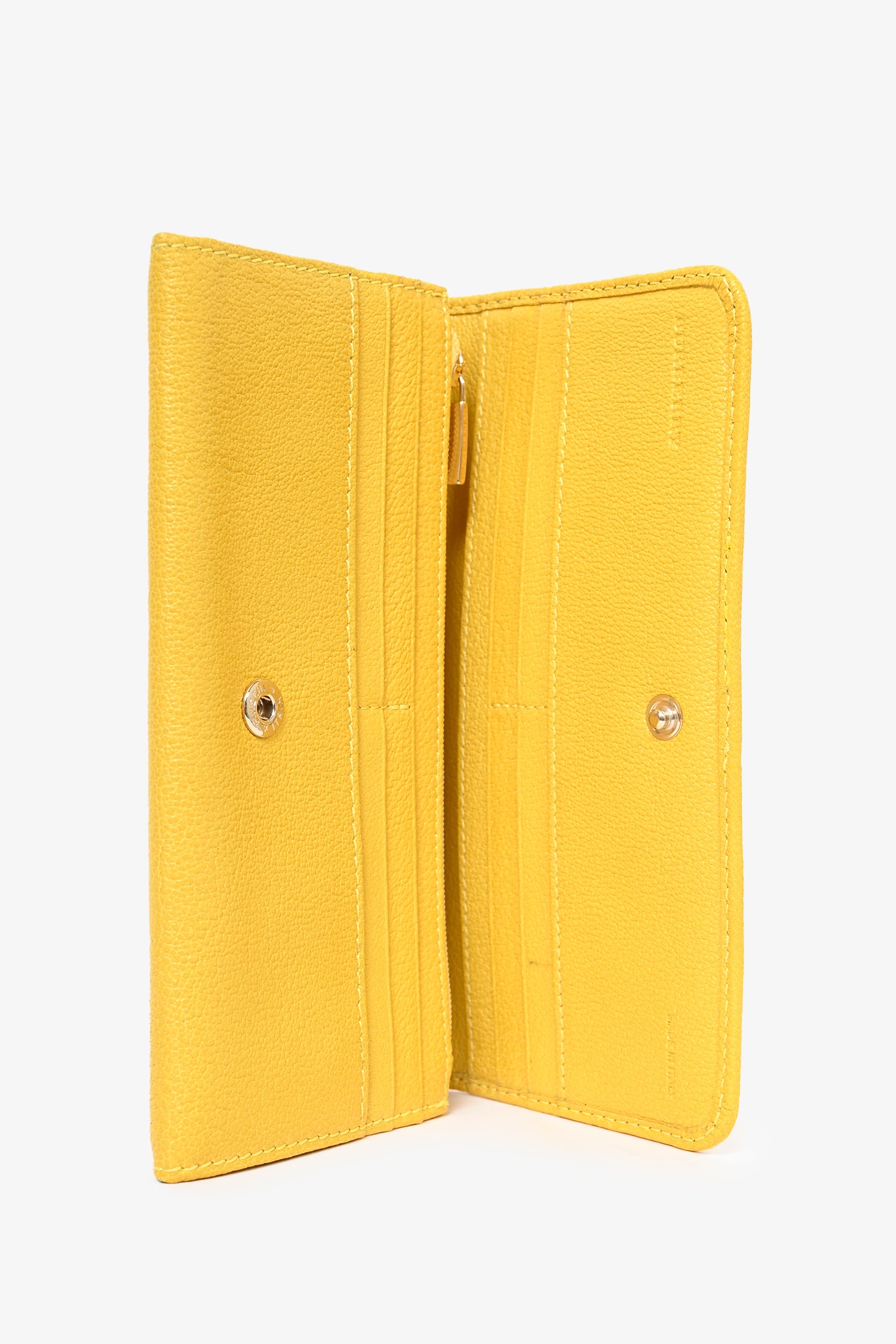 Refresh availabilityBurberry Yellow Grained Leather Long Bifold Wallet. Tonal stitching. Snap closure. Gold-tone hardware. Leather trimming. Interior zipped compartment. 12 card holder slots. 5 bill compartments.