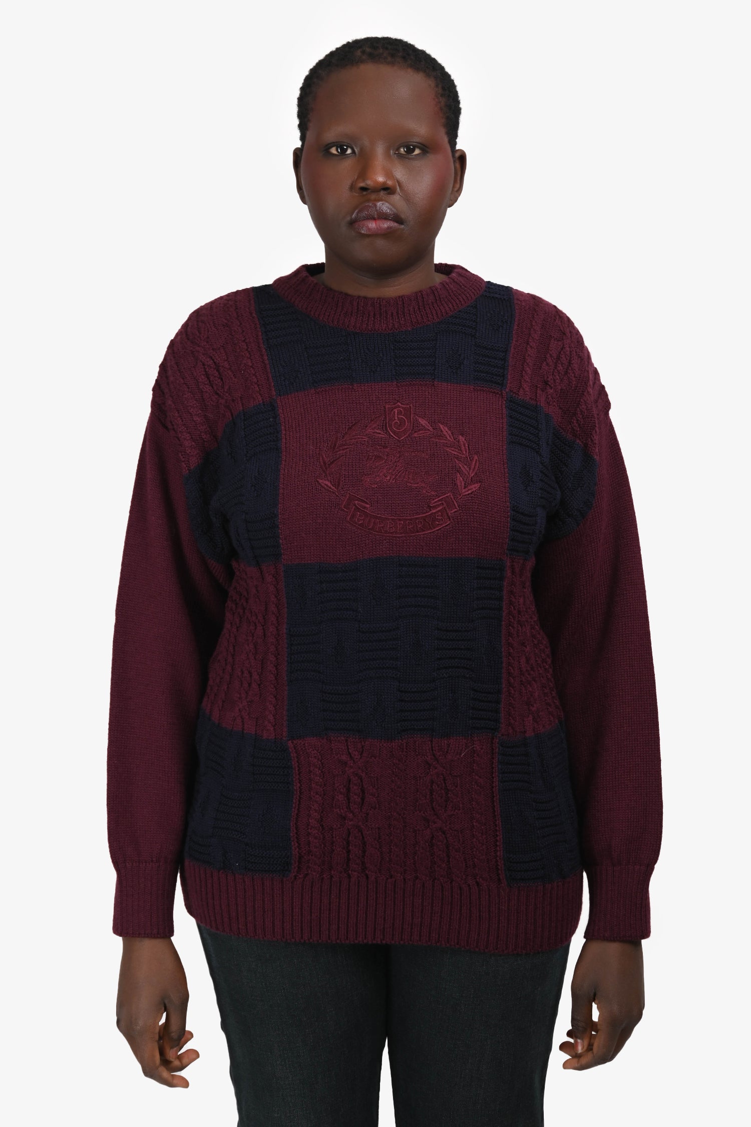 Refresh availabilityBurberrys Maroon/Navy Wool Embroidered Logo Check Sweater. Pull-on. Round neckline. Ribbed neck, cuffs and hem. Tonal stitching.