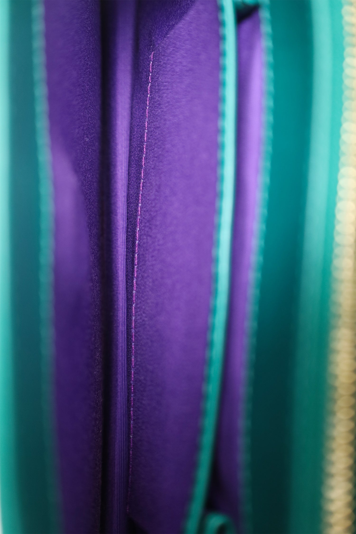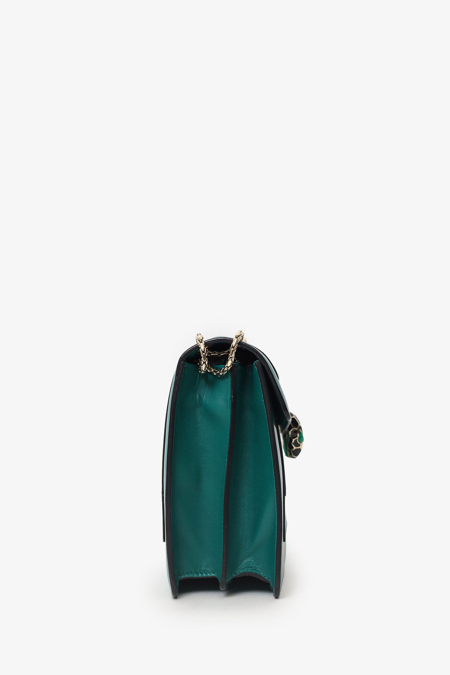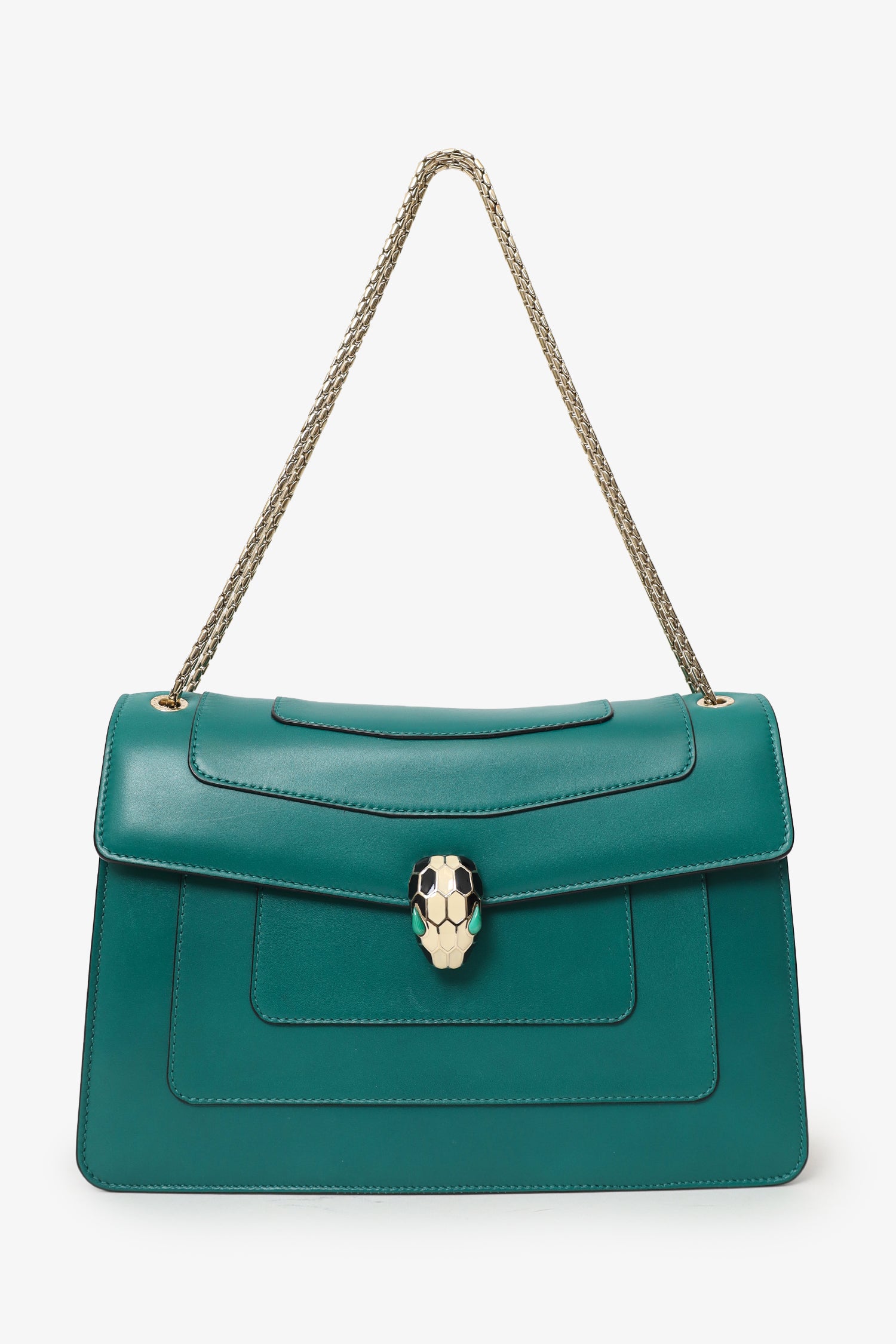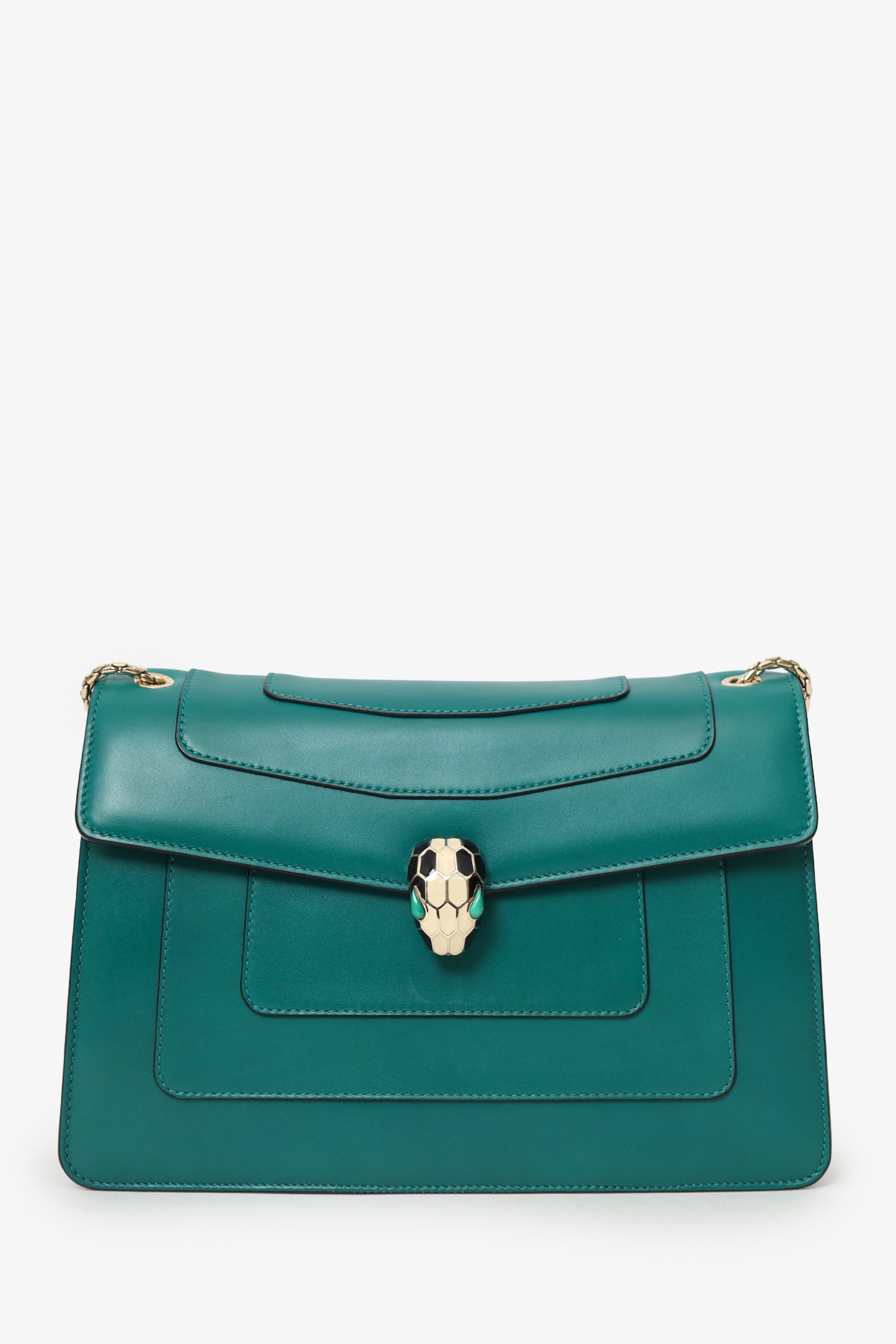 Refresh availabilityBvlgari Green Leather Medium Serpenti Forever Shoulder Bag. Front fold-over flap with snap button-up closure. Chainlink shoulder strap. Lined interior with 6 pockets; 4 slip, and 2 zip. Additional compact mirror. Gold-tone hardware. Tonal stitching.