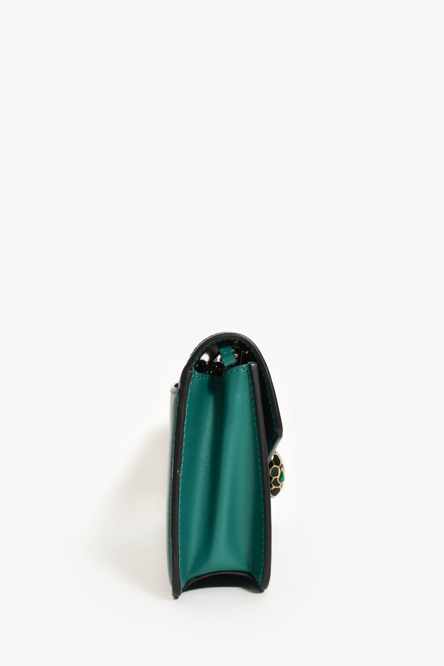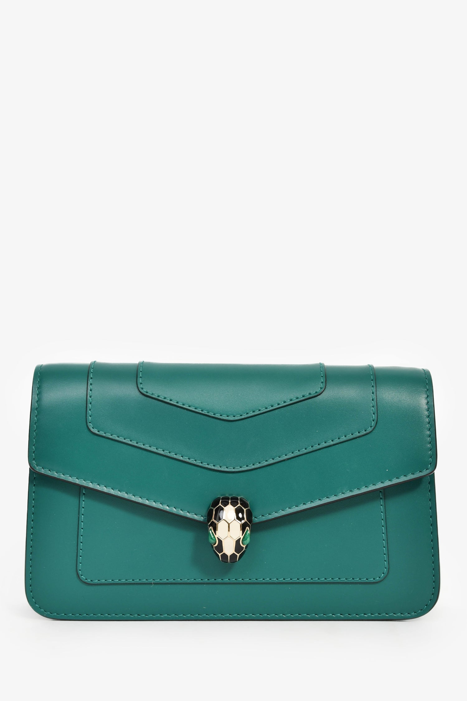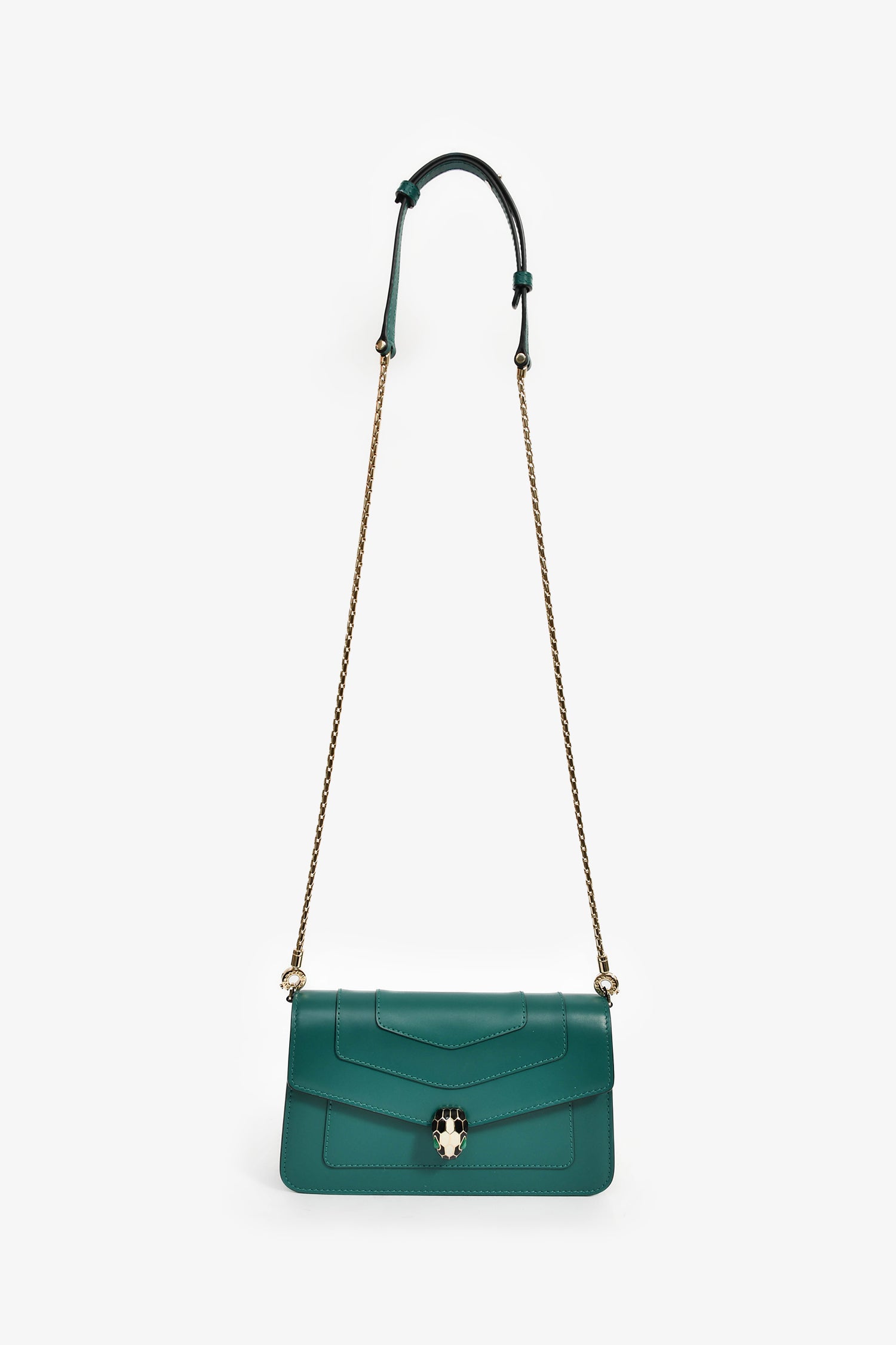 Refresh availabilityBvlgari Green Leather Serepenti Forever East-West Shoulder Bag. Front fold-over flap with a snap button closure. Single top handle and chain-link shoulder strap. Front interior zip compartment. 2 slip pockets, and 6 card holder slots in main compartment. Gold-tone hardware. Tonal stitching