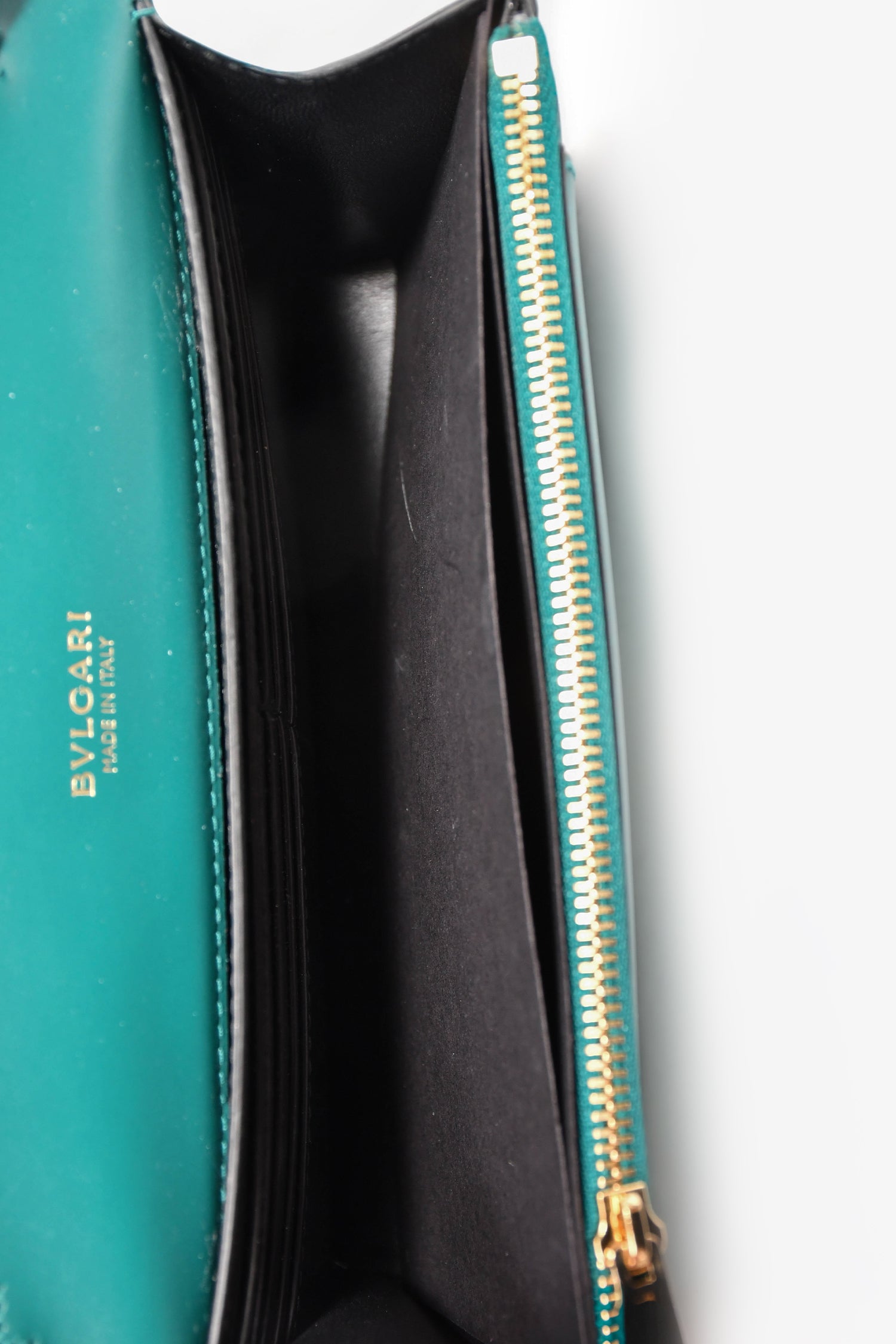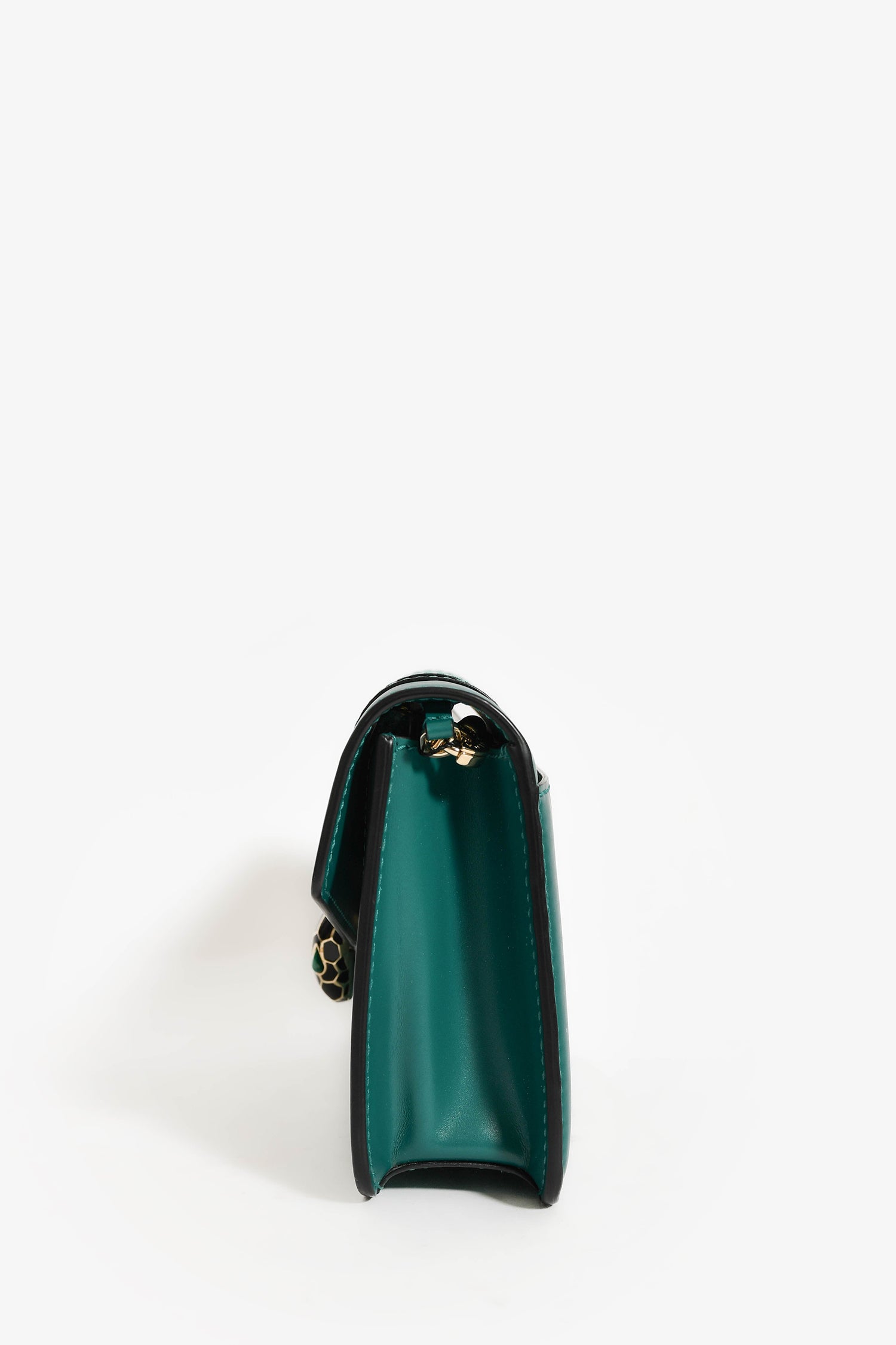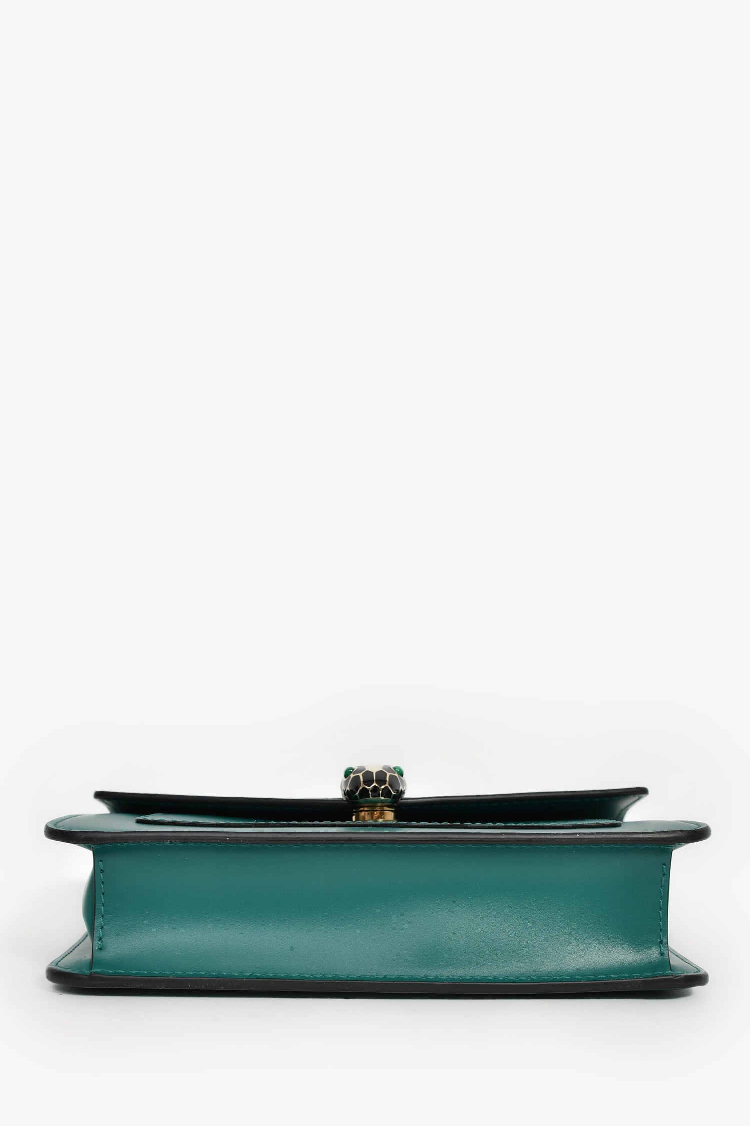 Refresh availabilityBvlgari Green Leather Serepenti Forever East-West Shoulder Bag. Front fold-over flap with a snap button closure. Single top handle and chain-link shoulder strap. Front interior zip compartment. 2 slip pockets, and 6 card holder slots in main compartment. Gold-tone hardware. Tonal stitching