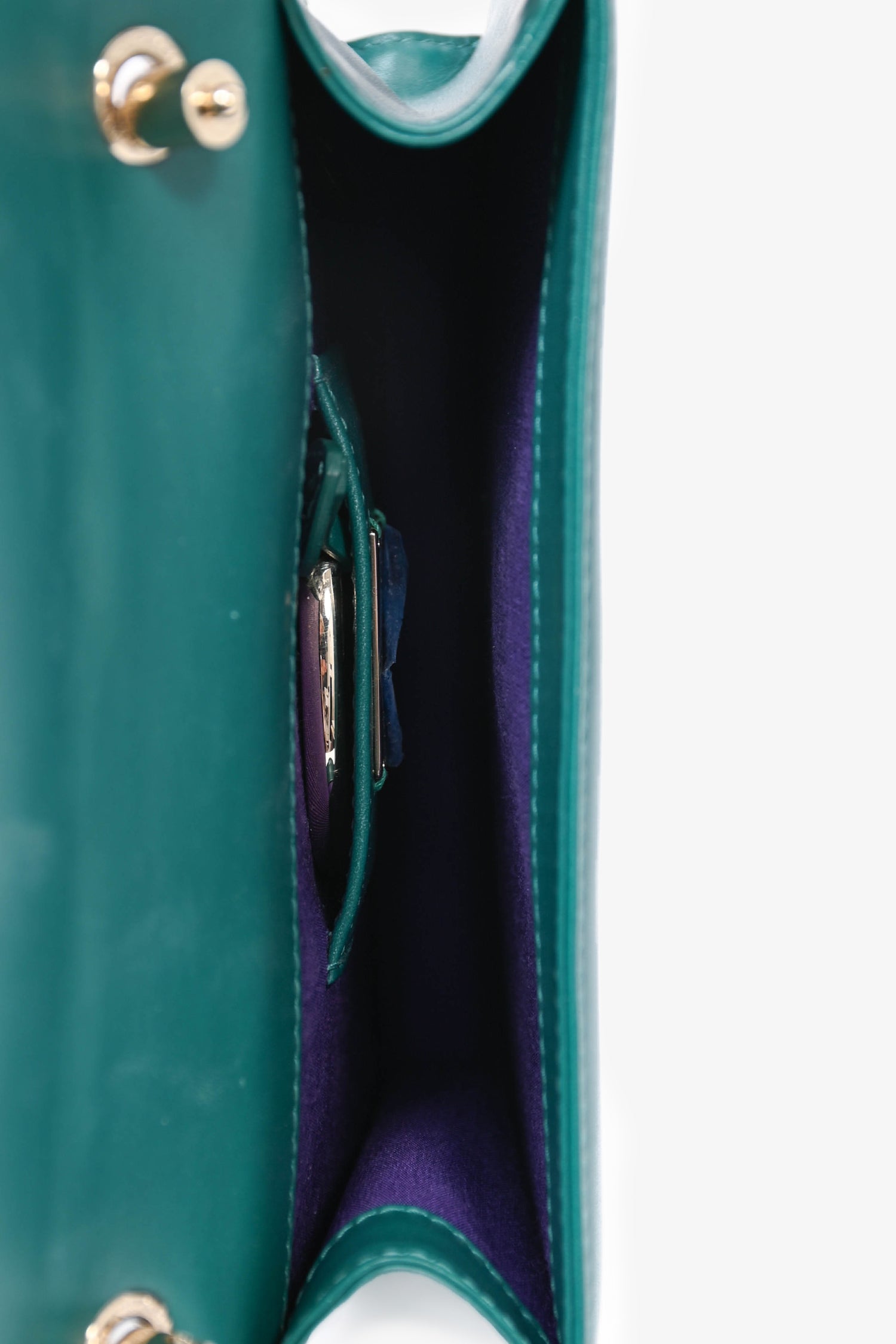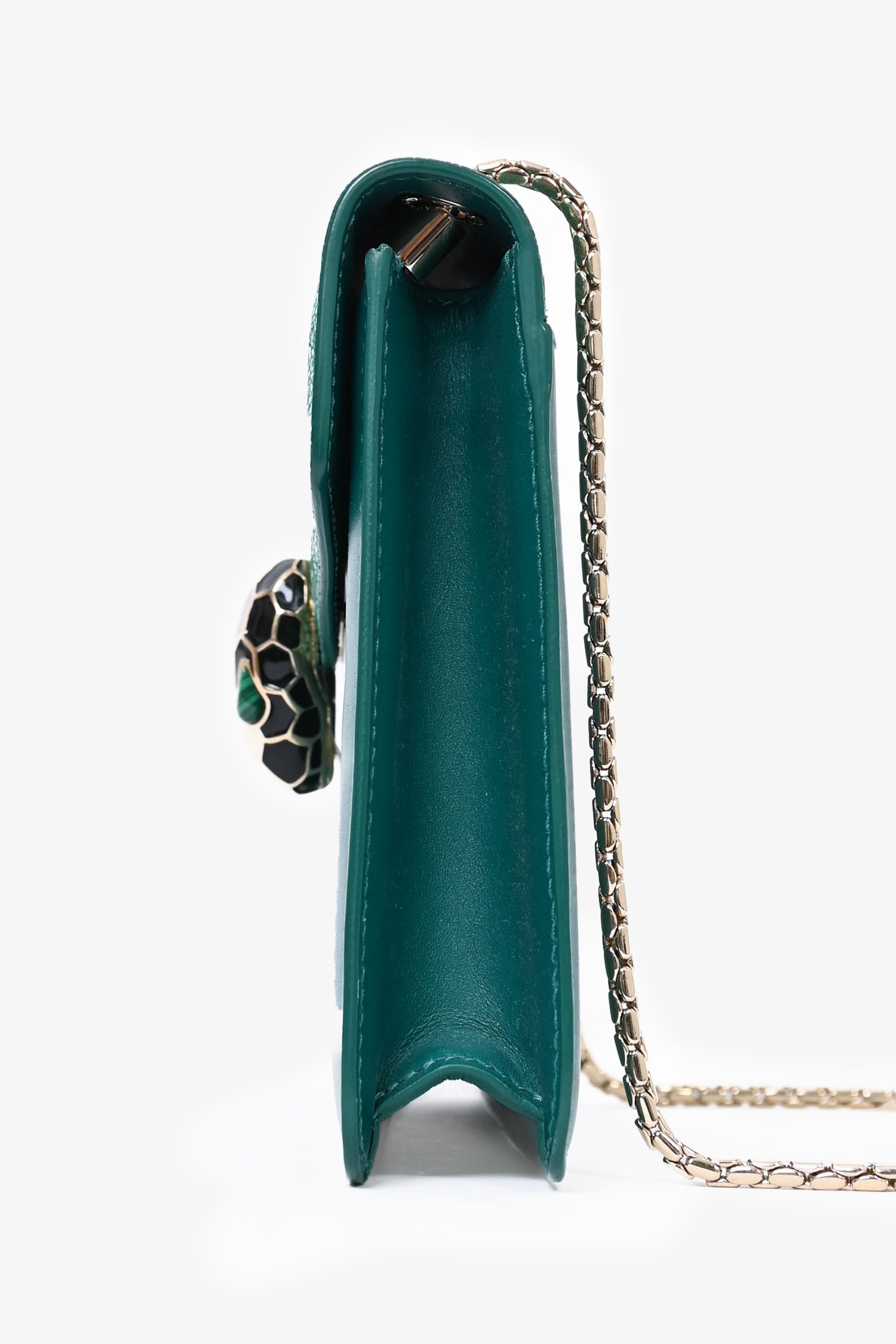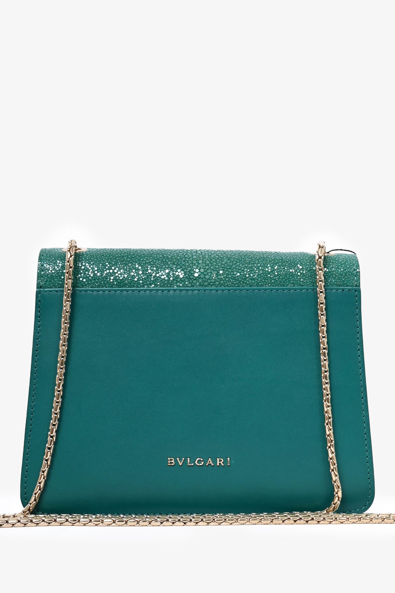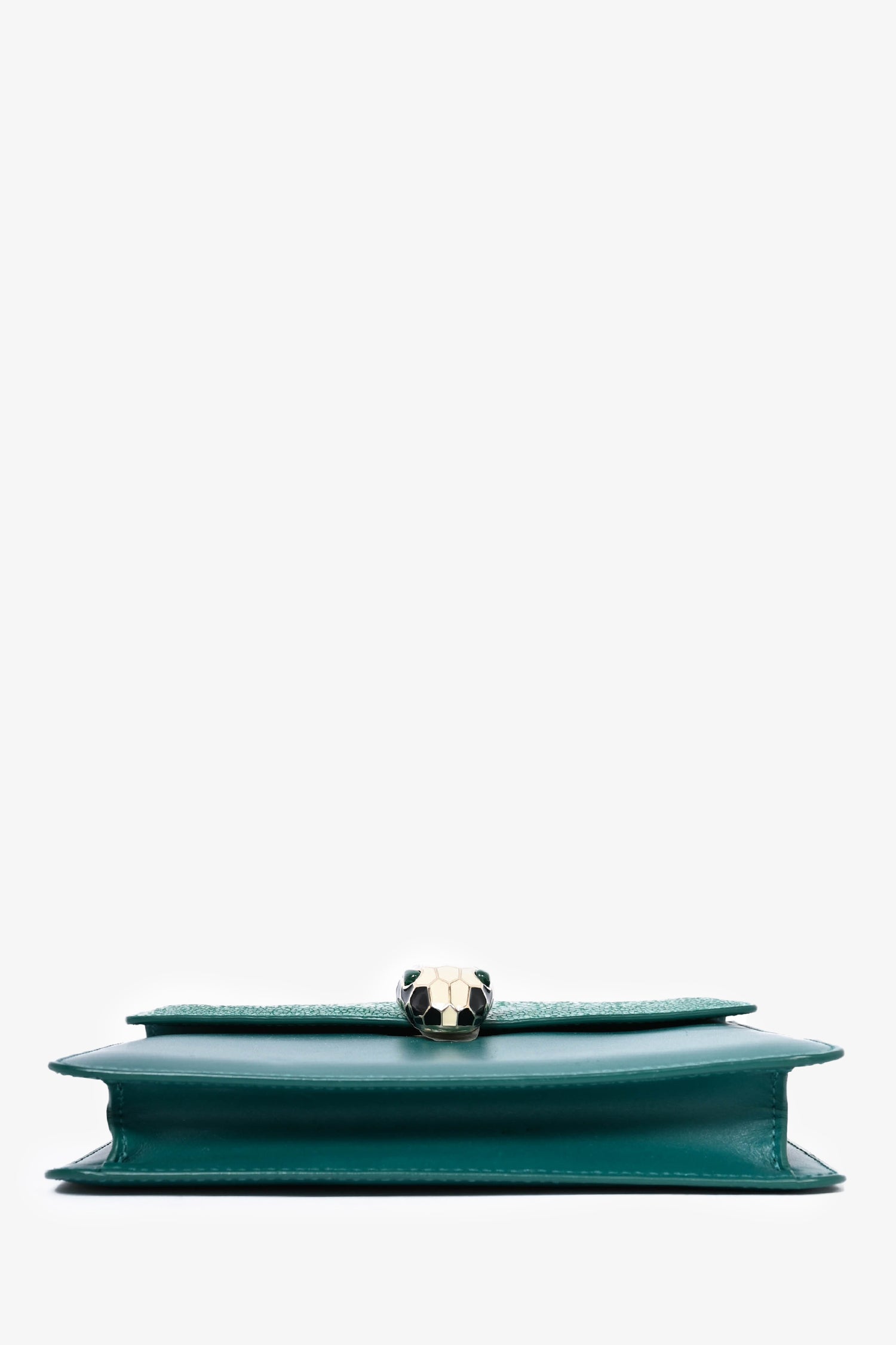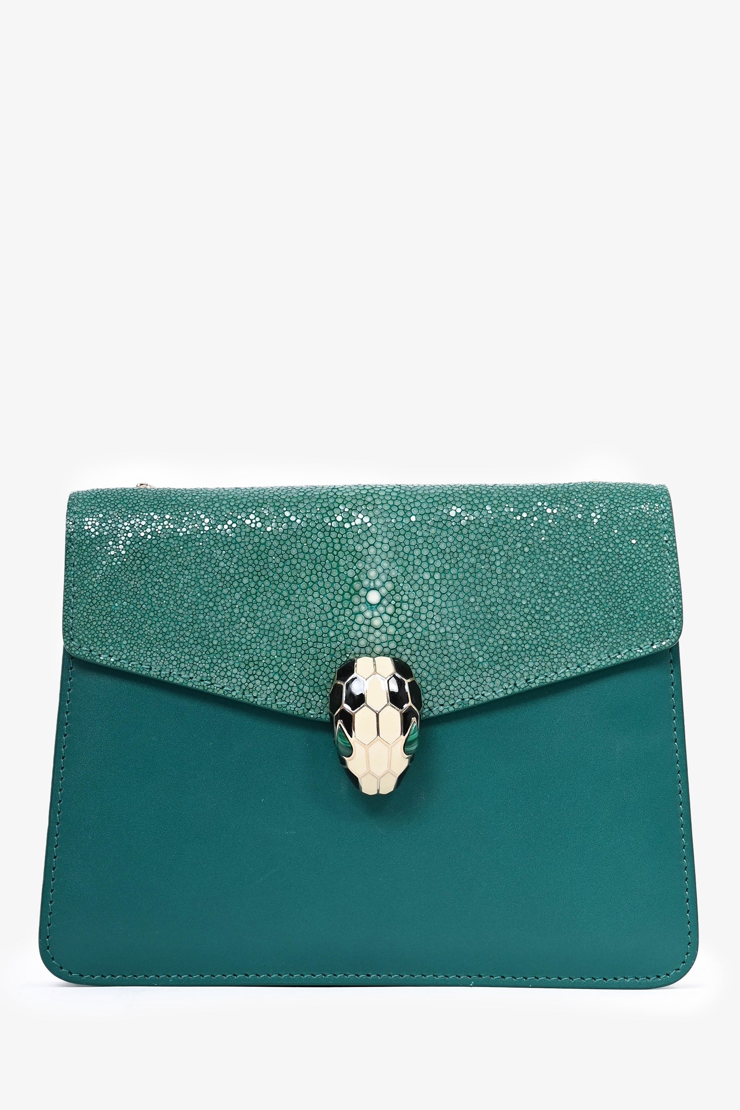 Refresh availabilityBvlgari Green Leather/Stingray 'Serpenti Forever' Bag. Serpenti embellished snap closure. Tonal topstitching. Iridescent front fold-over flap. Interior wall pocket. Contrast interior. Gold-toned crossbody strap. Comes with mirror.