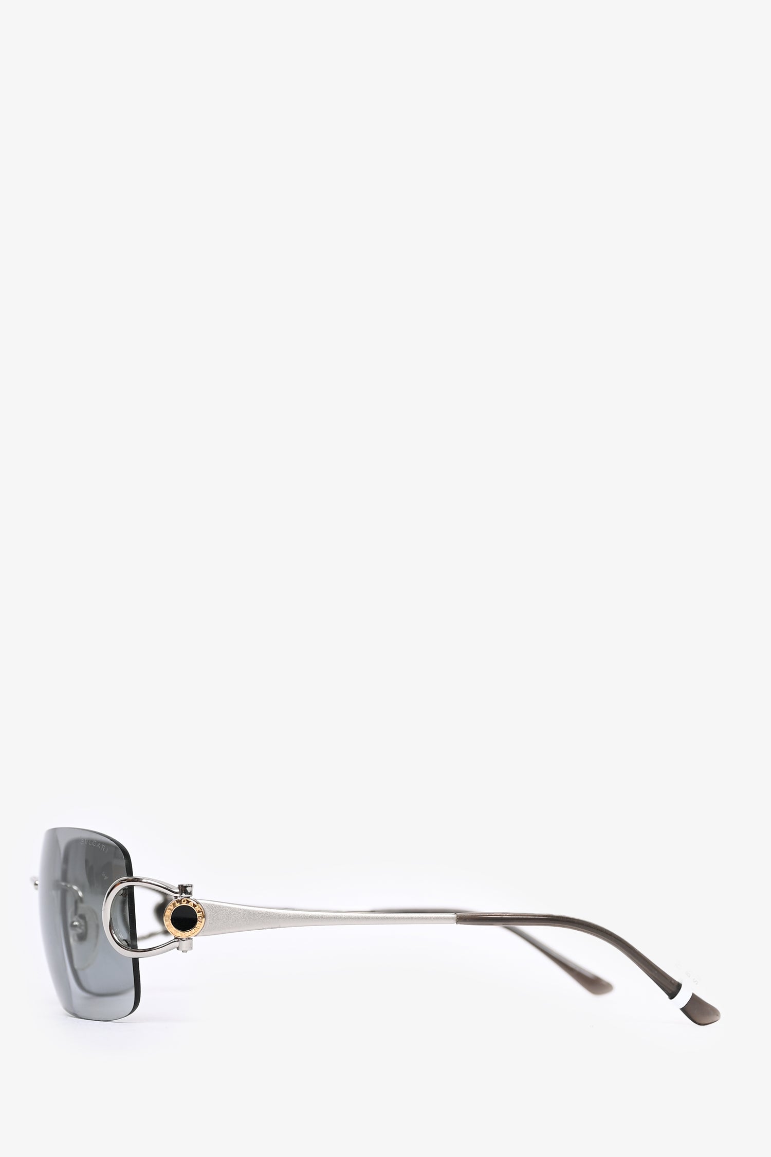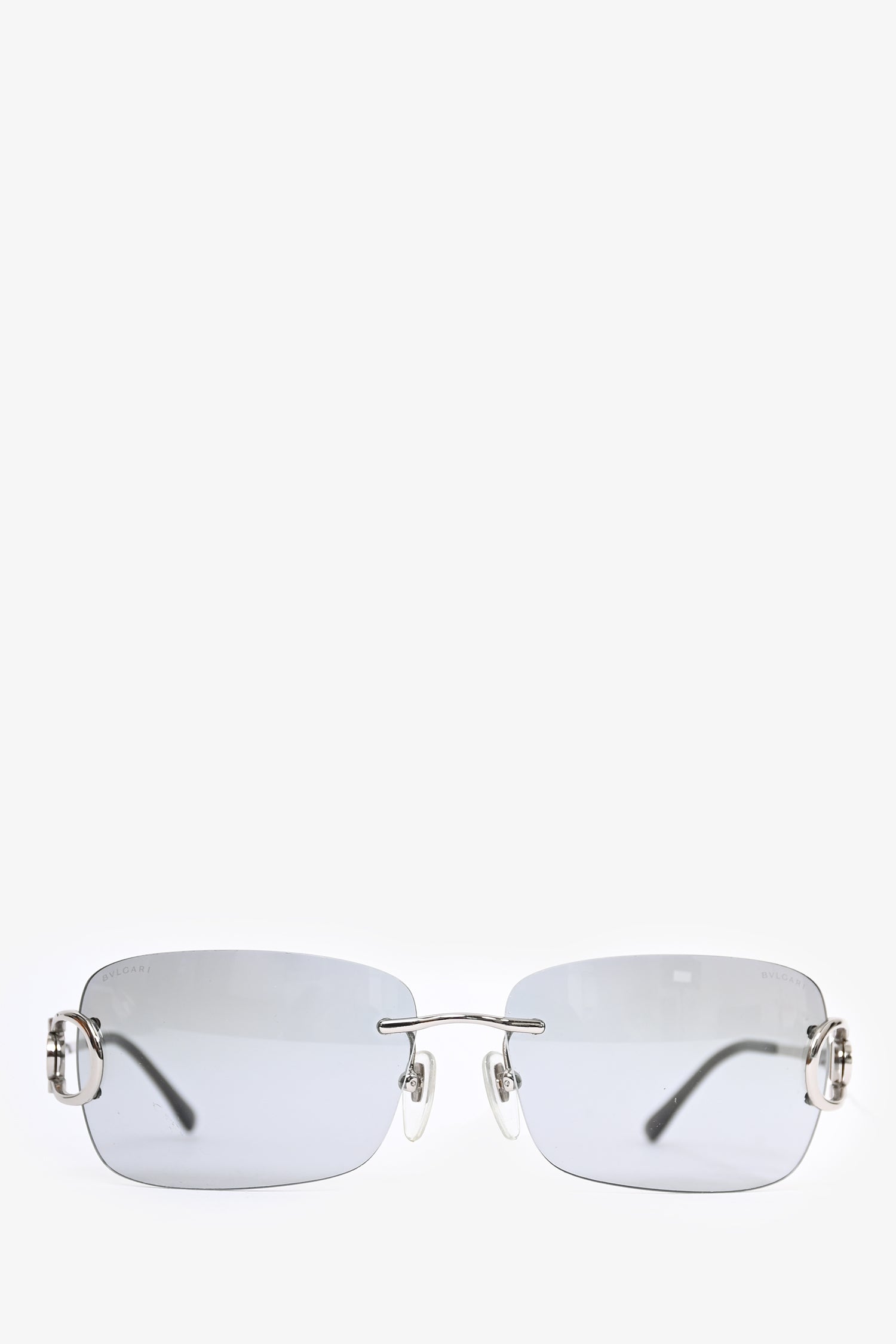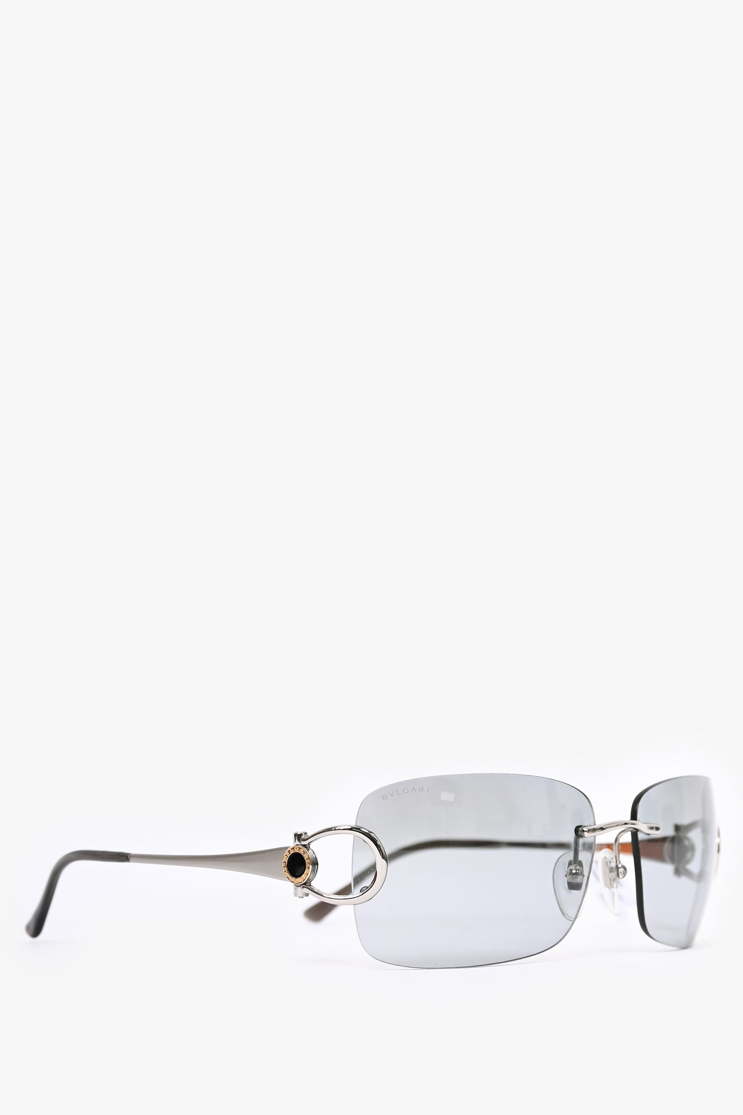 Refresh availabilityBvlgari Grey Rimless Sunglasses. Rounded rectangular lenses. Silver-tone hardware. Nose pads.