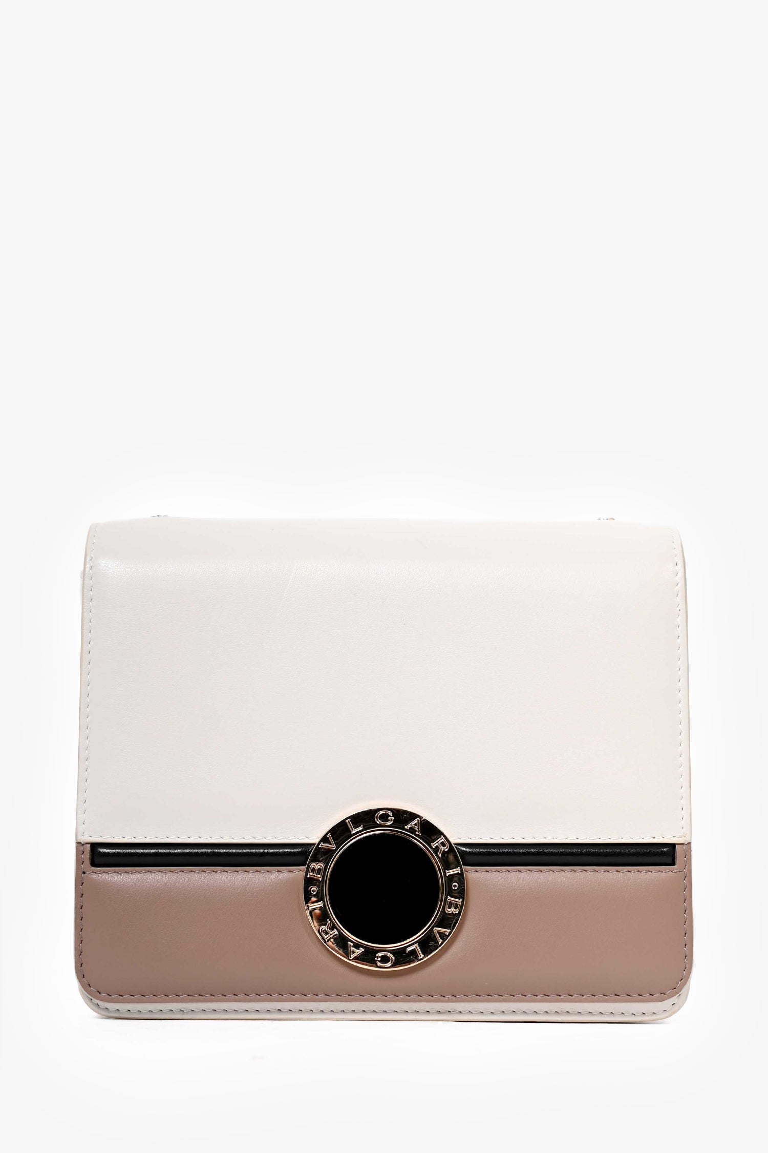 Refresh availabilityBvlgari Pink/Black Leather Crossbody. Front fold-over flap with a magnetic closure. 3 interior compartments. Single interior slip pocket at the back. Adjustable crossbody strap. Gold-tone hardware.